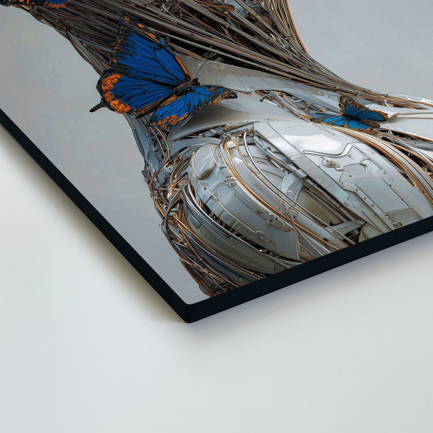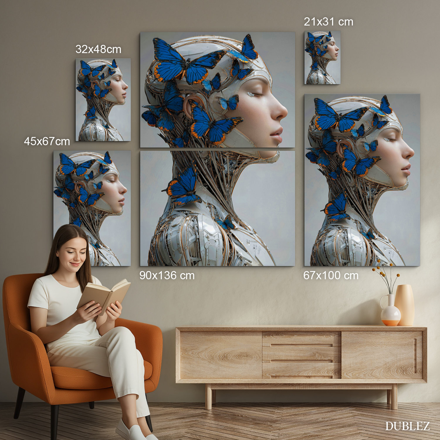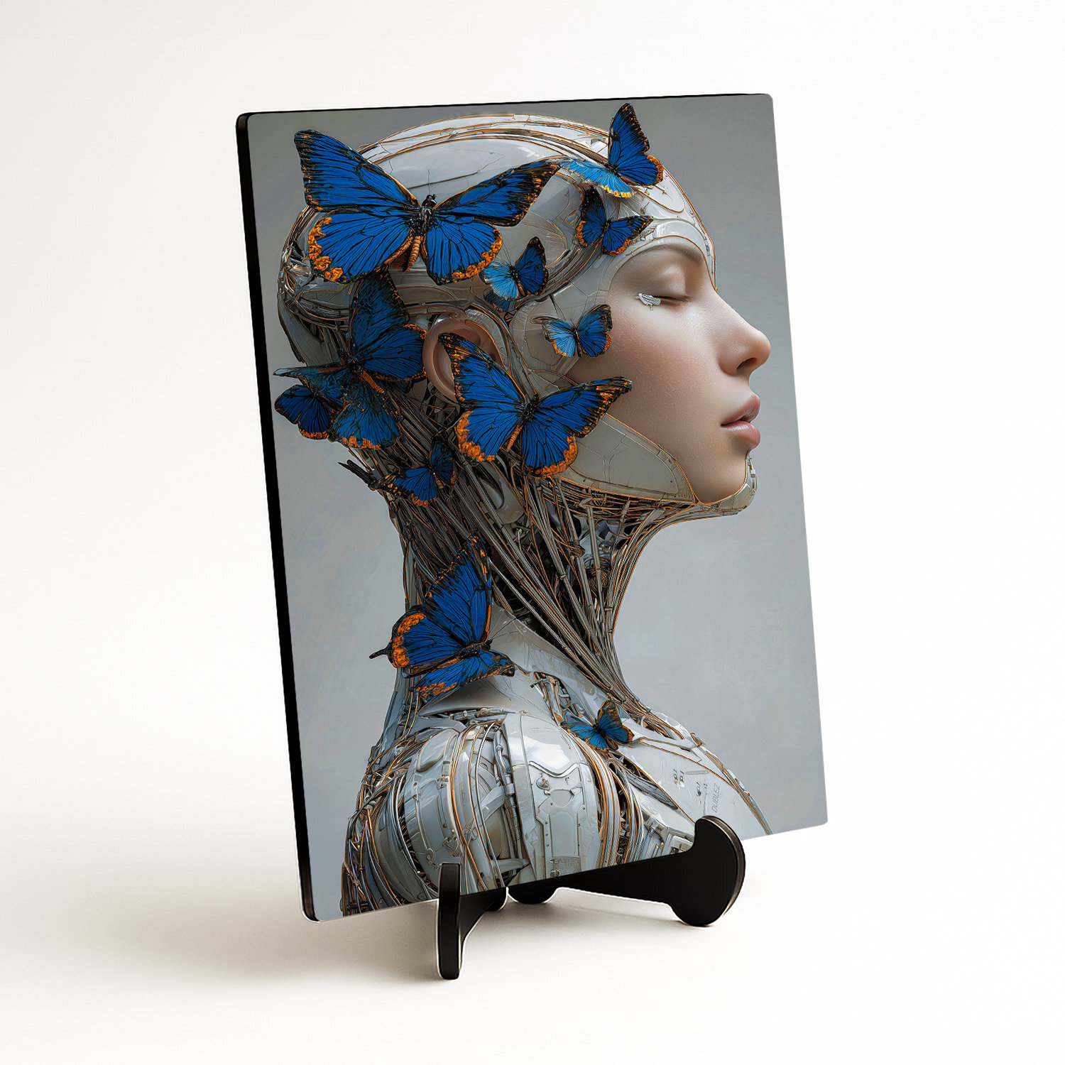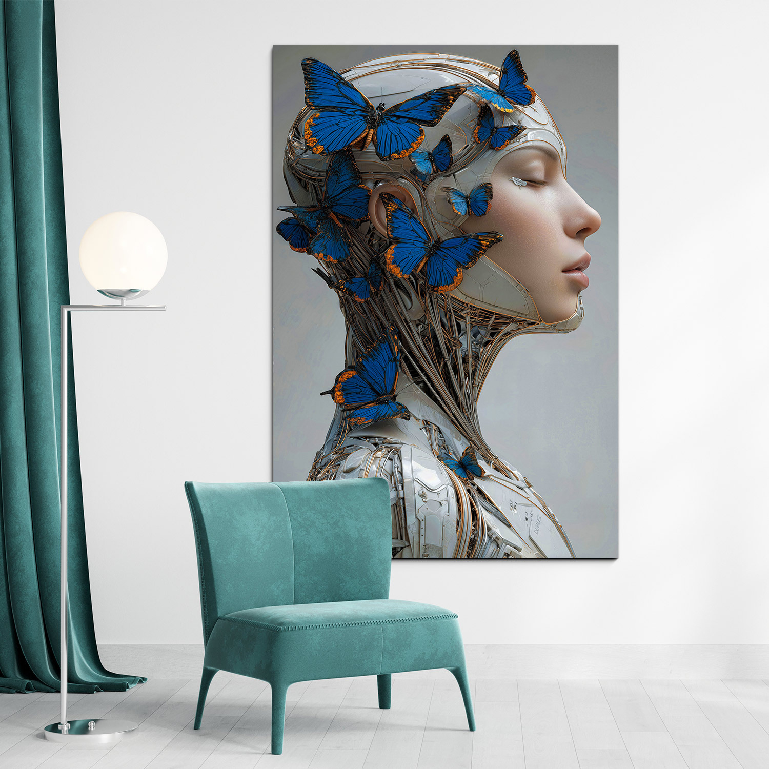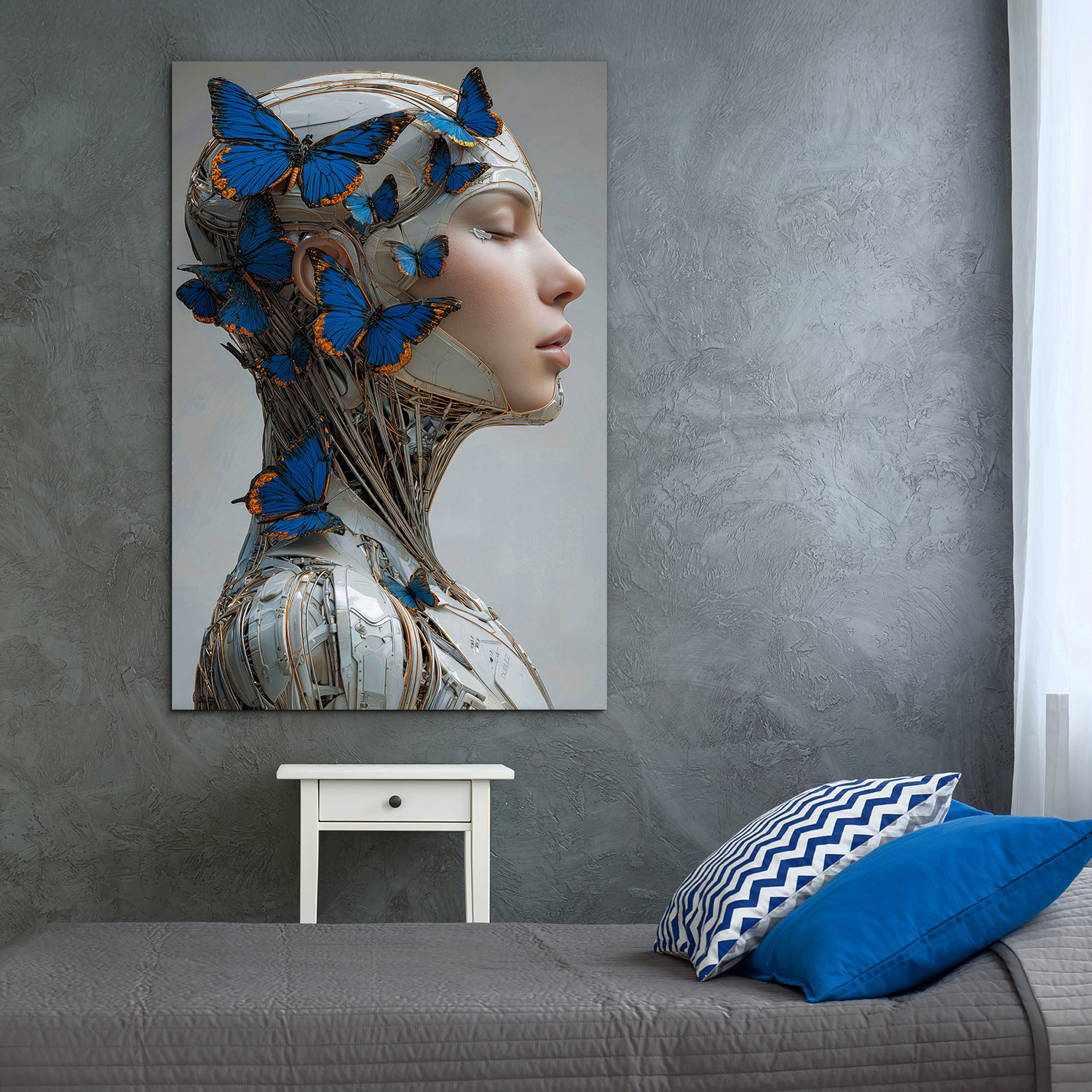 Drevený obraz Kybernetická múza spája jemnosť ženského profilu s futuristickou technológiou a modrými motýľmi. Kontrast chladného kovu a živých krídel vytvára originálny obraz, ktorý pôsobí moderne a zároveň elegantne. Avangardný obraz s čistými líniami skvelo vynikne v spálni aj kancelárii.