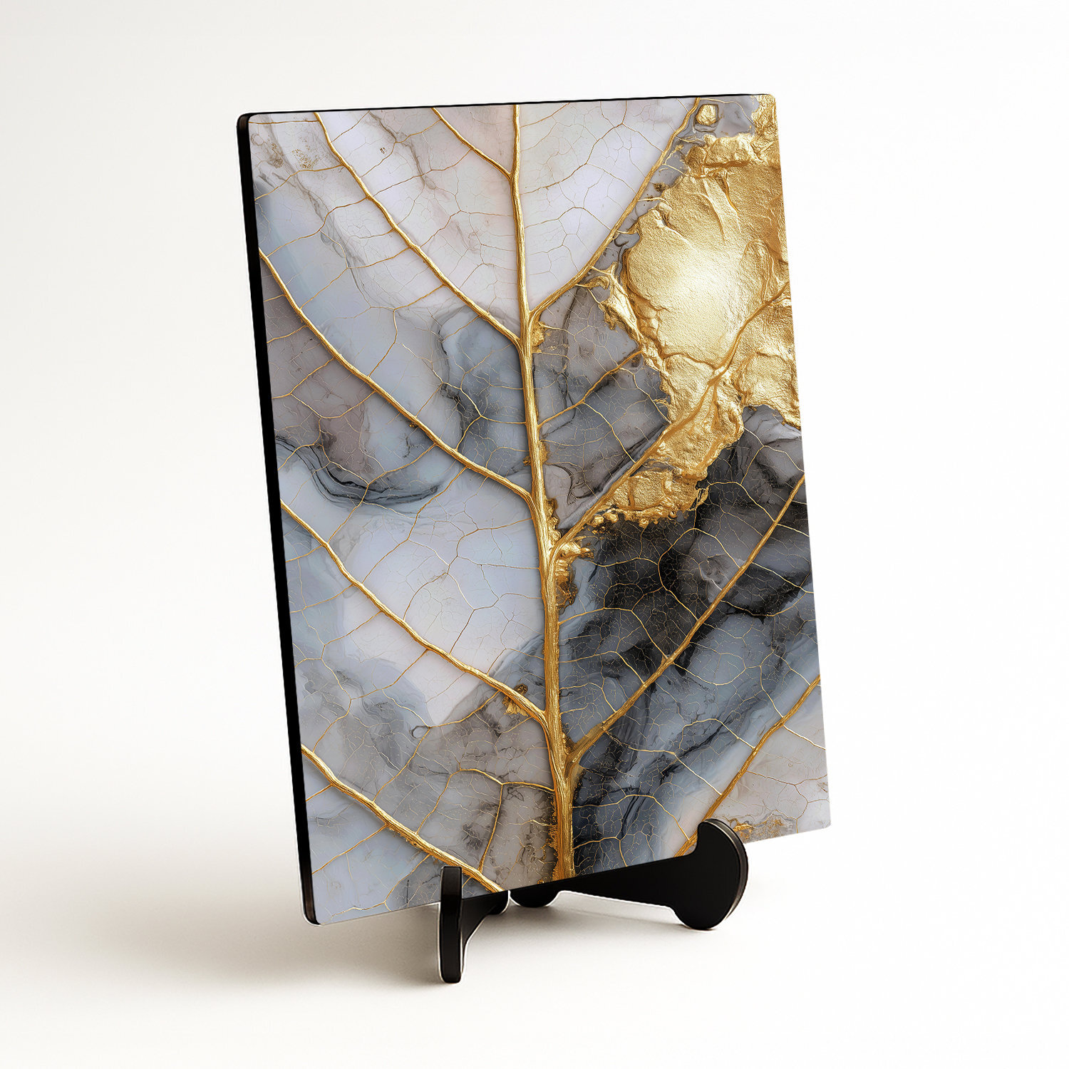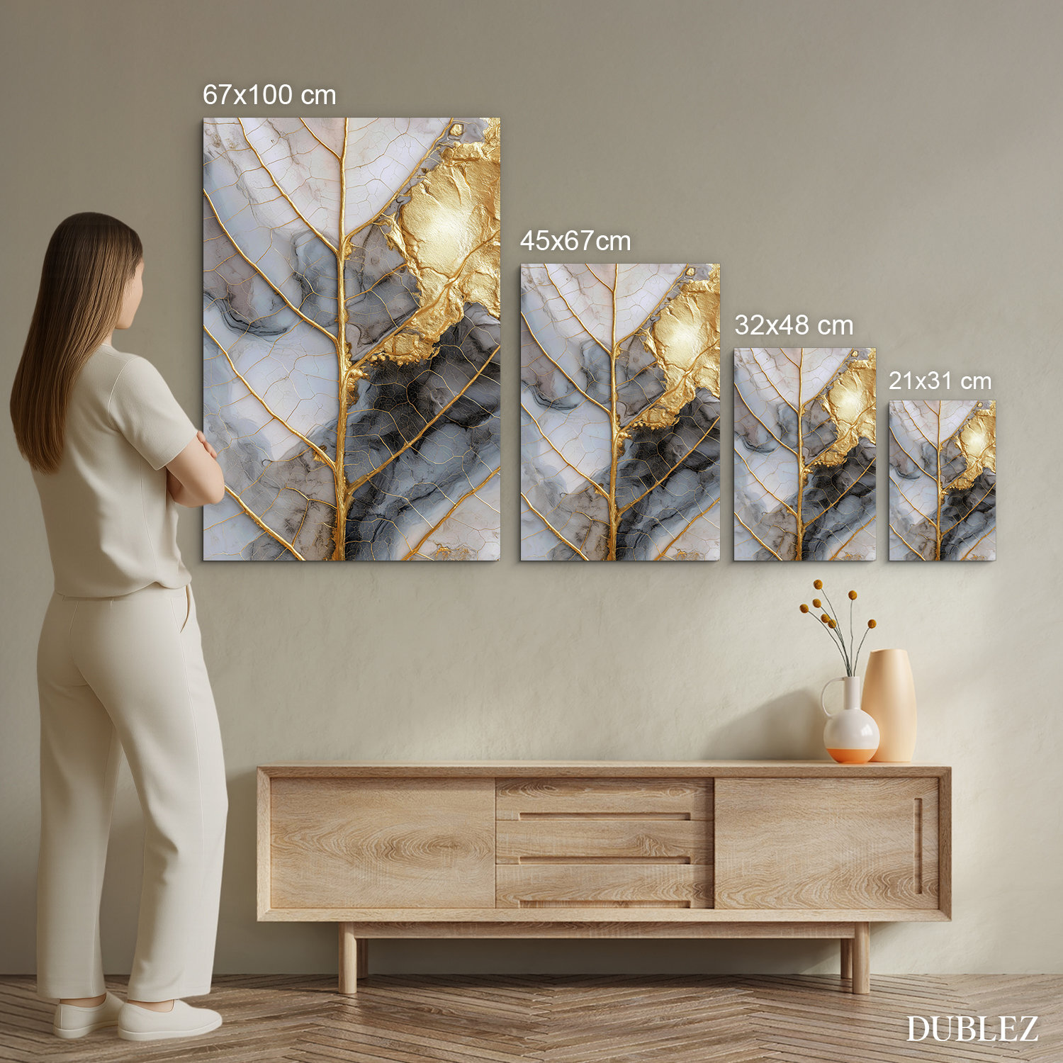 Drevený obraz so zlatým listom je dokonalým spojením luxusu, elegancie a prírody. Jemné zlaté žilky listu vystupujú na mramorovom pozadí. Dizajnový obraz dokonale vynikne v interiéroch zariadených v štýle glamour, modernom, minimalistickom či prírodnom dizajne. Hodí sa do obývačky, spálne, chodby alebo kancelárie. Vhodný aj ako luxusný darček pre ženy so zmyslom pre detail a krásu.