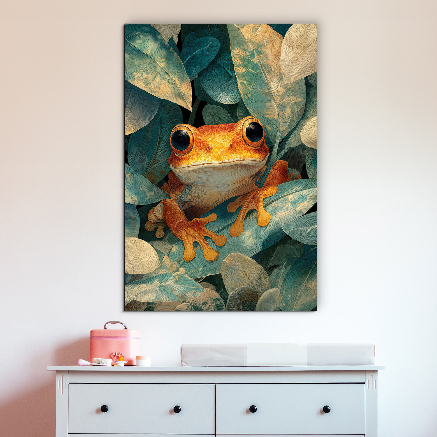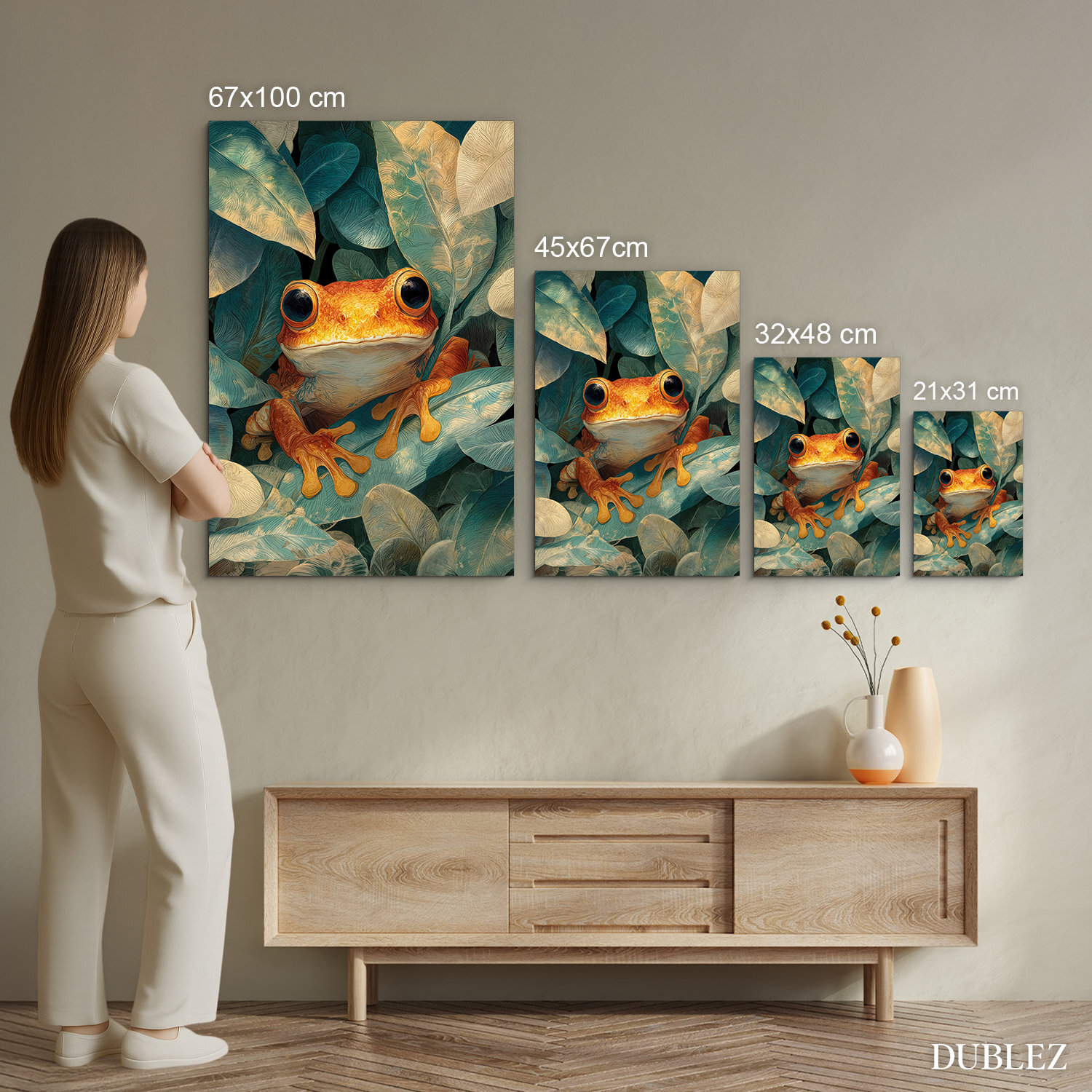 Význam obrazu: Žabka symbolizuje šťastie, premenu a schopnosť prispôsobiť sa. Jej zvedavý pohľad prináša do domova pocit radosti a pripomína, že krása sa skrýva aj v tých najmenších detailoch prírody.