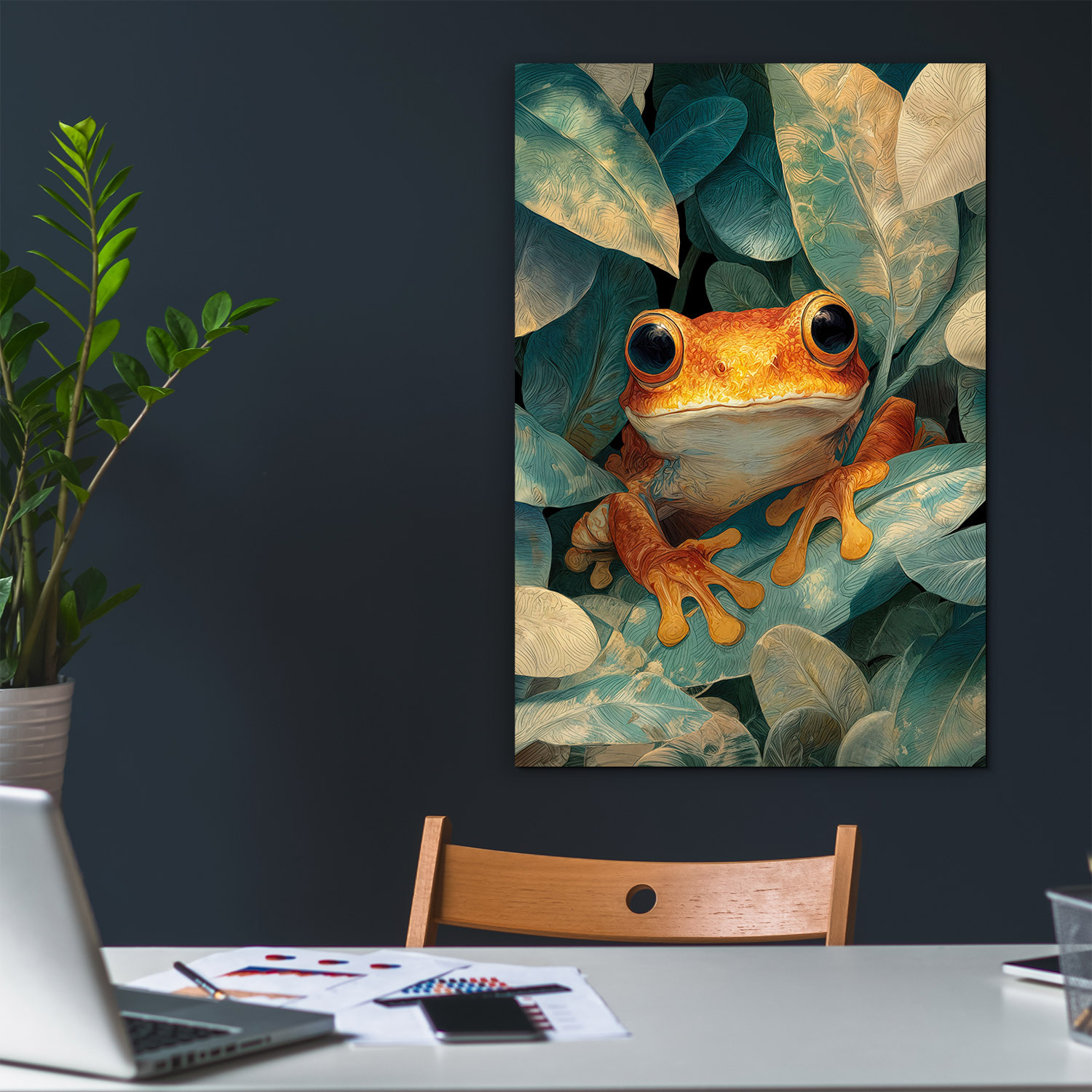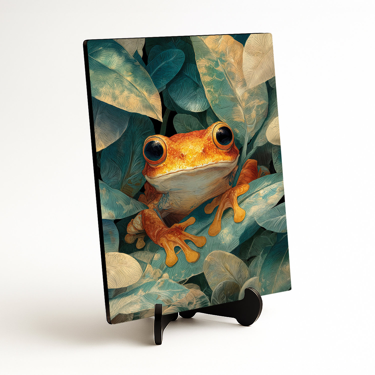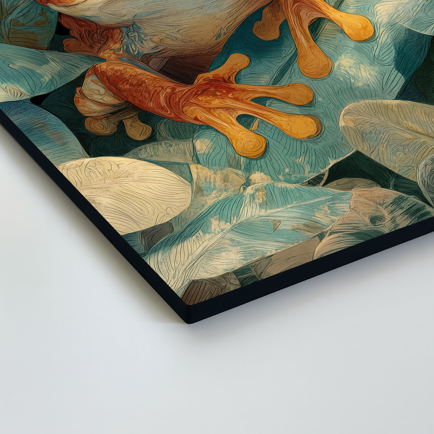 Drevený obraz oranžovej žabky vykukujúcej spomedzi veľkých listov vnesie do priestoru hravosť a energiu divokej prírody. Výrazné oranžové a modré odtiene vytvárajú veselý kontrast, ktorý okamžite upúta pozornosť a vyčarí úsmev. Obraz je ideálnym doplnkom do detskej izby, študentského kútika alebo do predsiene, ktorú chcete oživiť niečím netradičným. Skvele vynikne na bielej stene, kde naplno vyniknú jeho sýte farby a detailné línie listov.