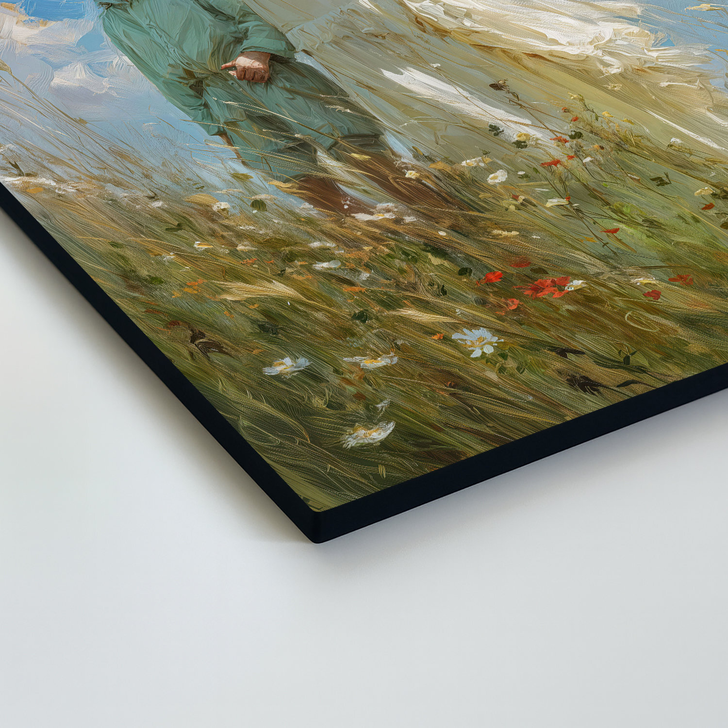 Impresionistický obraz ženy a dieťaťa na rozkvitnutej lúke zachytáva čaro letného okamihu v jemných ťahoch, svetle a pohybe. Romantický obraz s efektom maľby sa perfektne hodí do obývačky, spálne či kuchyne. Poteší každého milovníka klasického umenia, prírody a impresionistického štýlu.