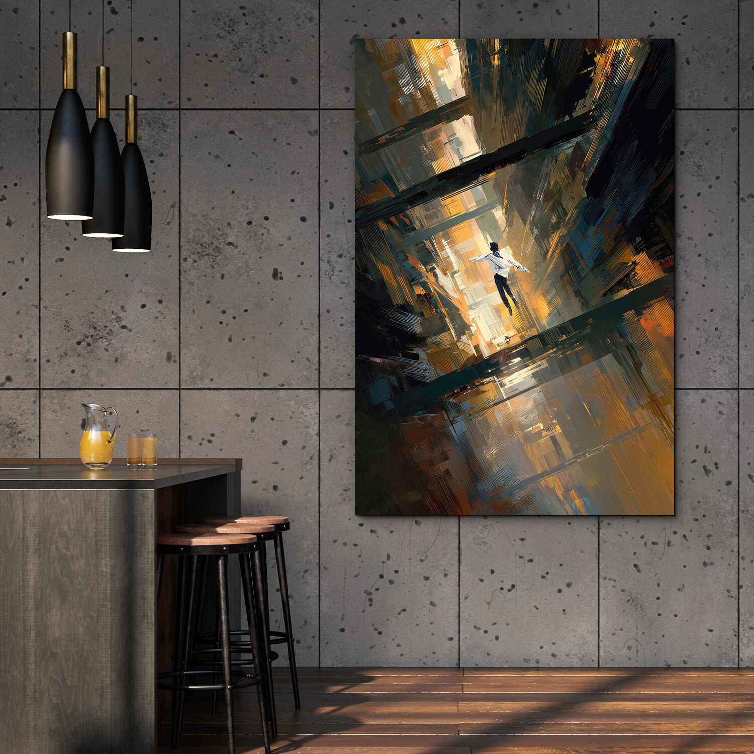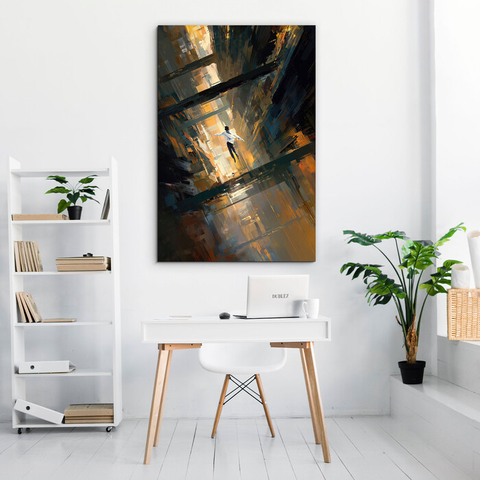 Hľadáte moderný obraz na stenu, ktorý vnesie do bytu slobodu a odvahu? Drevený obraz Pád je unikátne umelecké dielo zachytávajúce postavu nad siluetou veľkomesta. Vďaka expresívnemu štýlu a kombinácii tmavej oceľovej, zlatej a antracitovej farby je tento kúsok dokonalým doplnkom pre industriálny interiér. Či už zariaďujete obývačku v štýle loftu, alebo hľadáte originálny obraz do kancelárie, tento motív okamžite pritiahne pozornosť. Abstraktný obraz na dreve vyniká vysokou kvalitou spracovania a sýtymi farbami, ktoré nevyblednú.