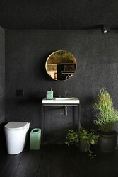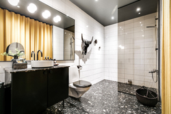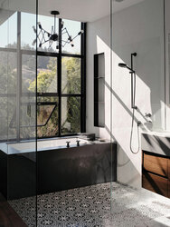 Kúpeľňu volíme jednoduchú. Kovové prvky ako batérie, držiaky alebo osvetlenie volíme kovové a najlepšie v čiernej matnej farbe. Prevažujú neutrálne farby obkladu ako sivá, biela, čierna.