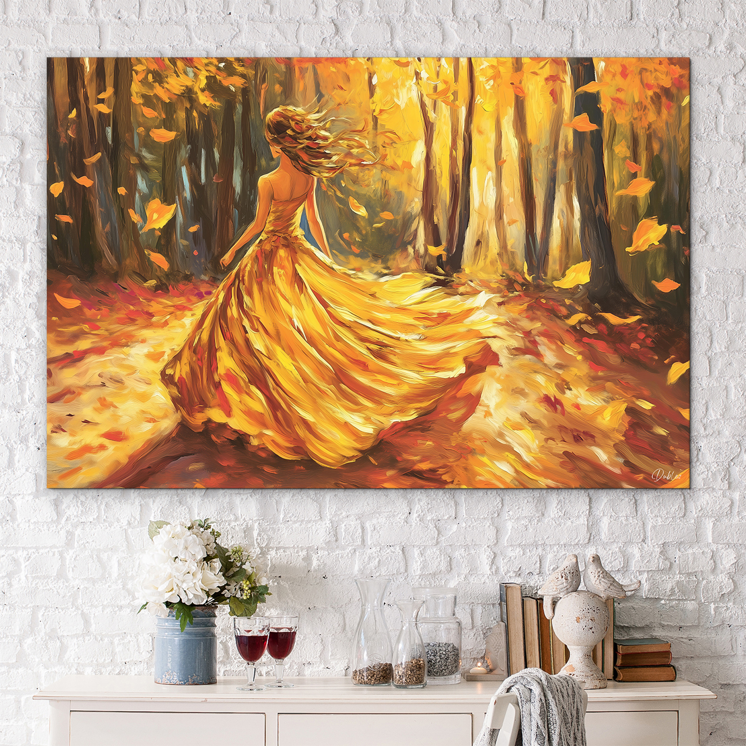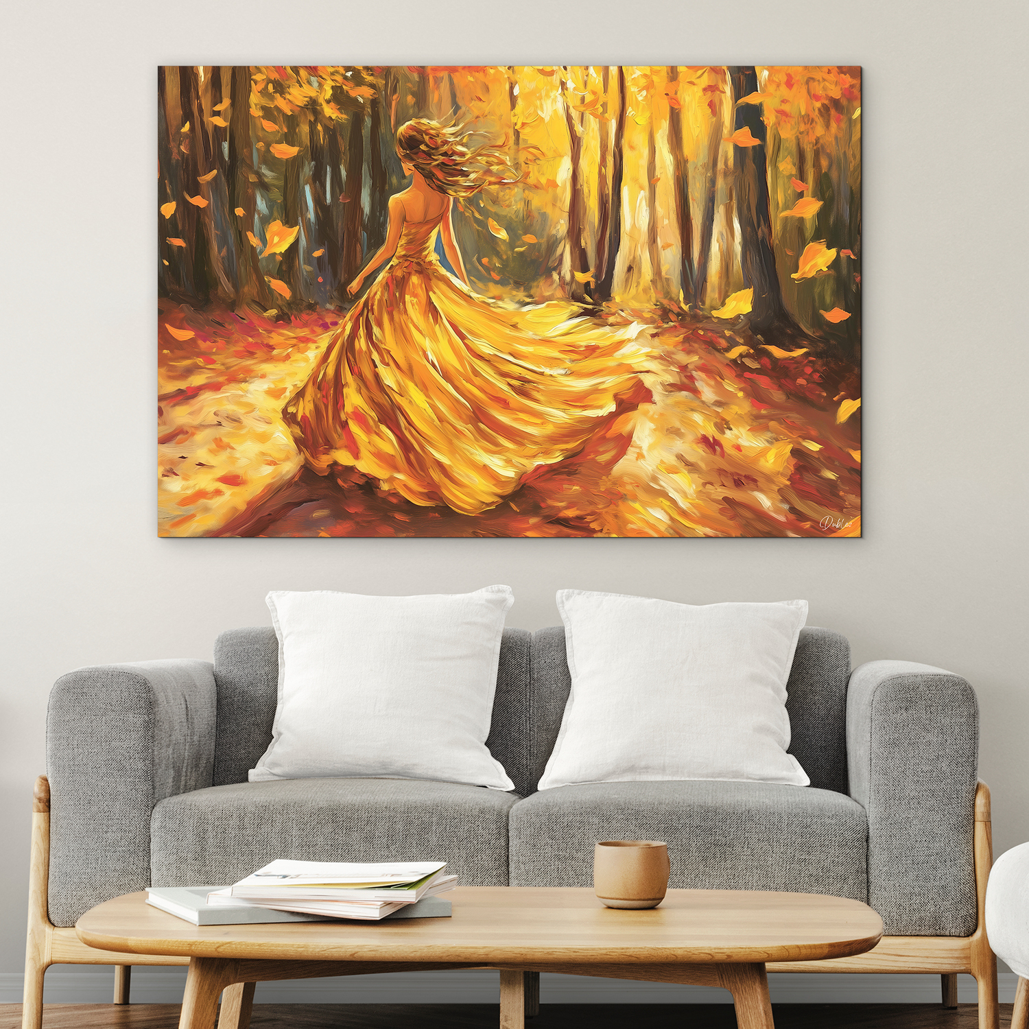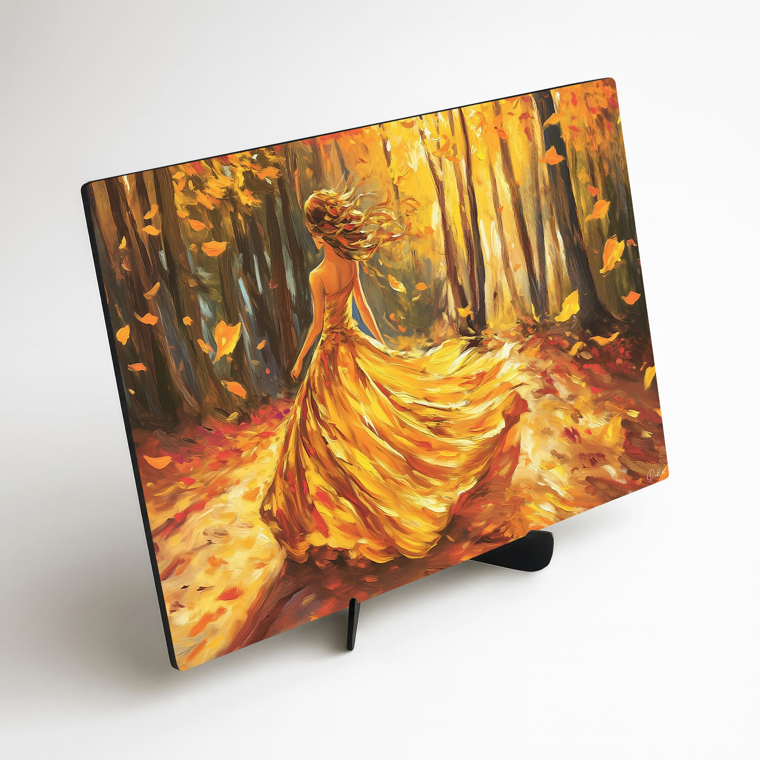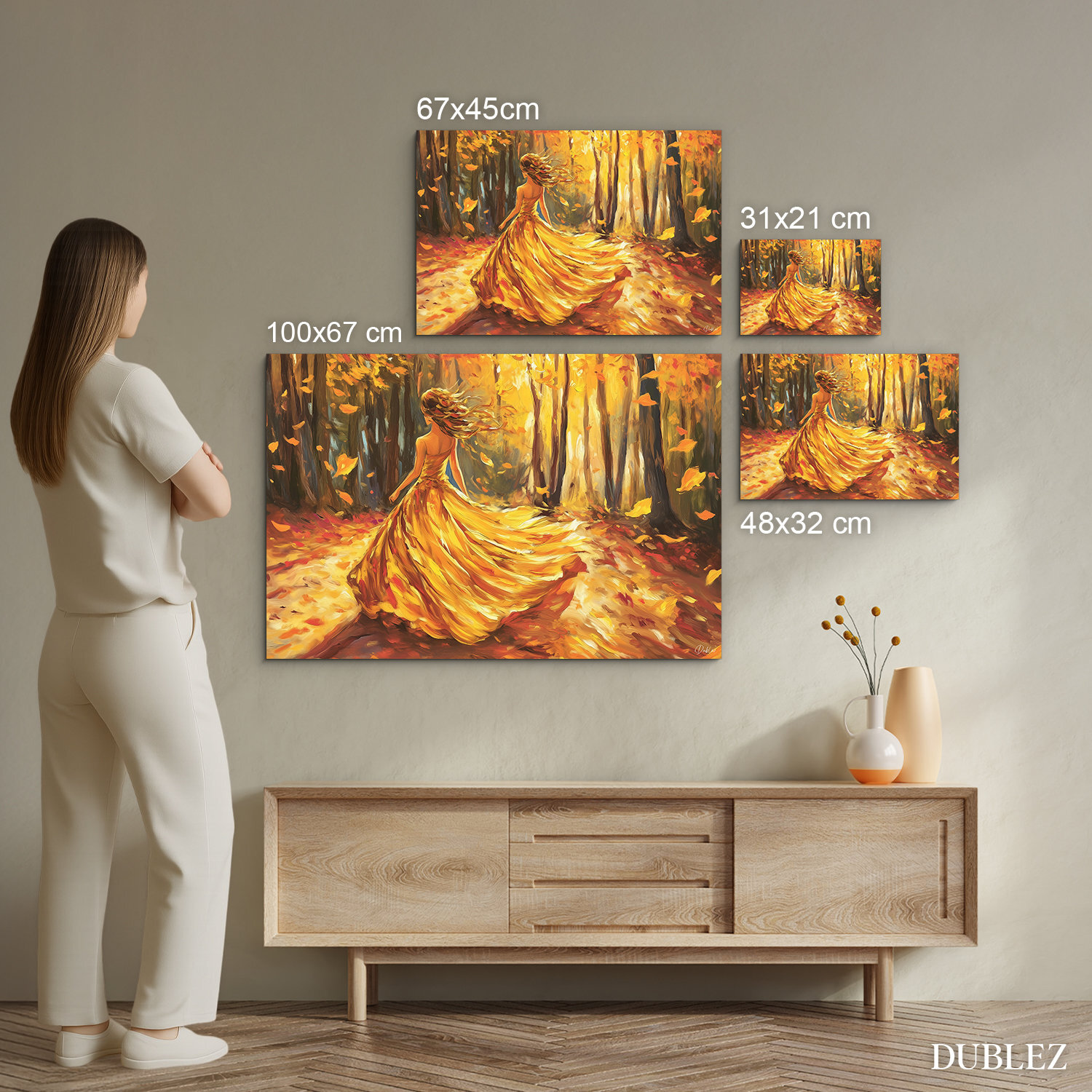Drevený obraz ženy v jesennom lese zobrazuje romantickú atmosféru uprostred prírody. V strede obrazu sa nachádza žena v dlhých zlatých šatách, ktorá tancuje po lesnej cestičke pokrytej lístím. Les je zaliaty svetlom a teplými žlto-oranžovými farbami, uprostred ktorého prechádza Pani jeseň. Drevený obraz sa perfektne skvele hodí do obývačky nad gauč alebo do spálne nad posteľ.