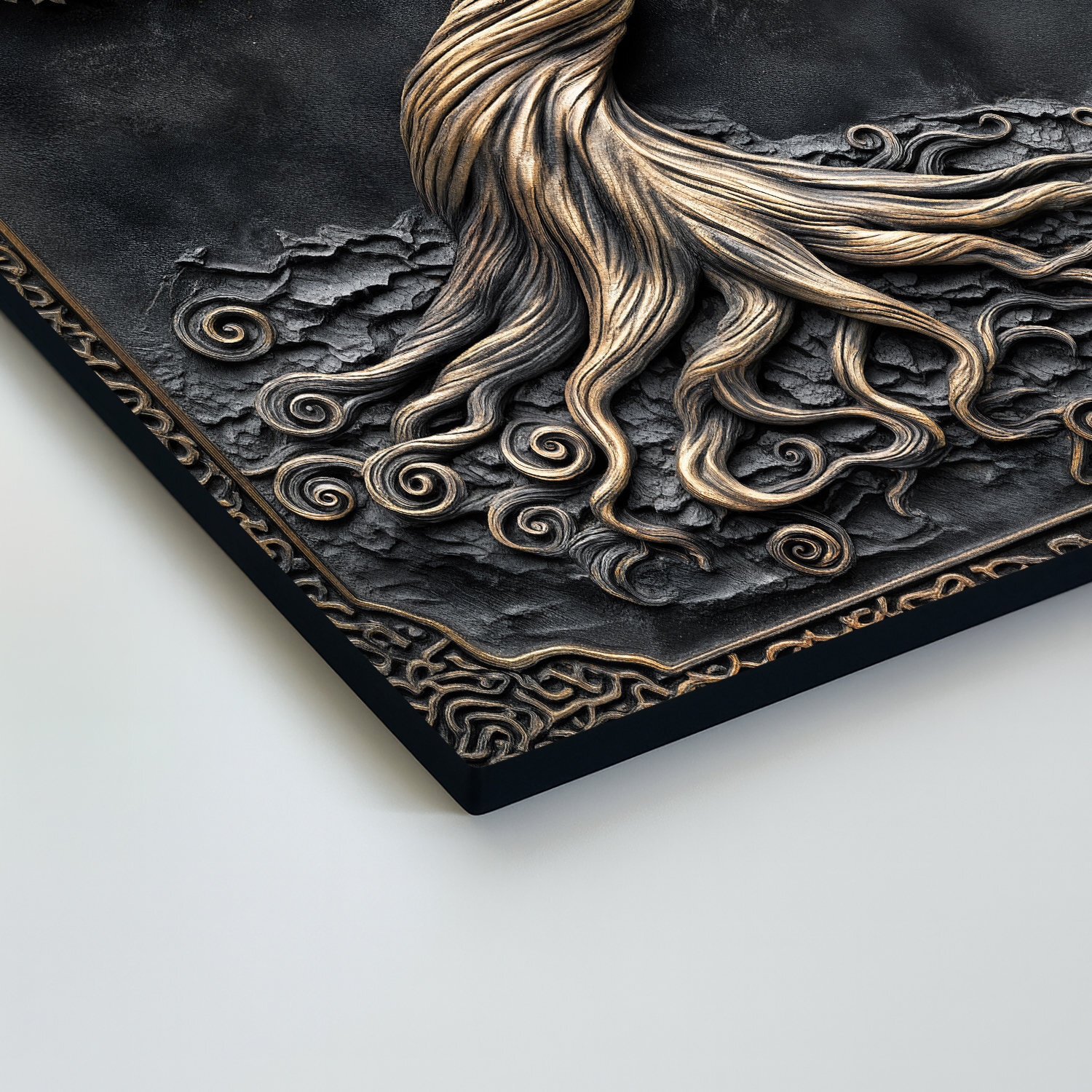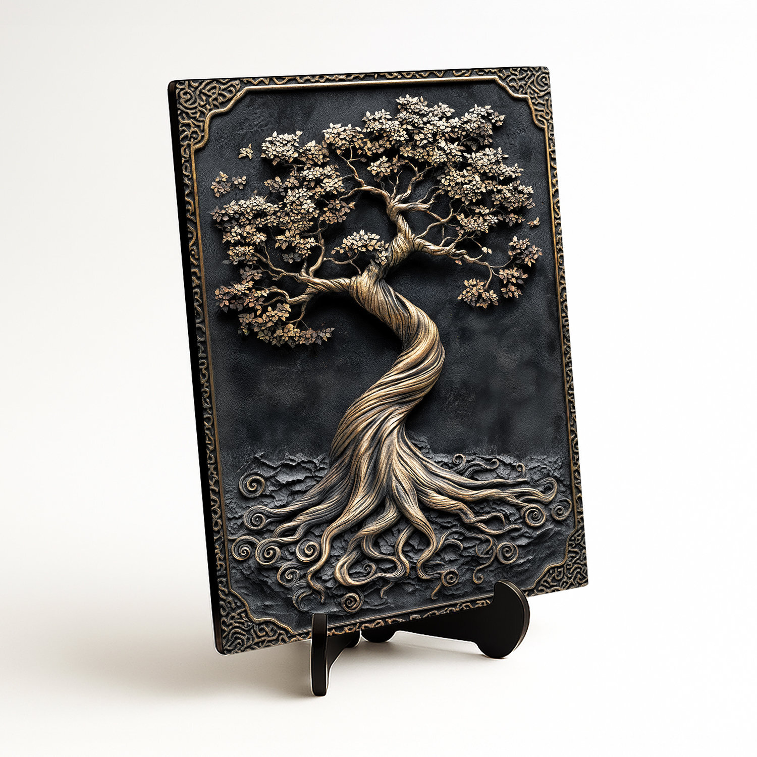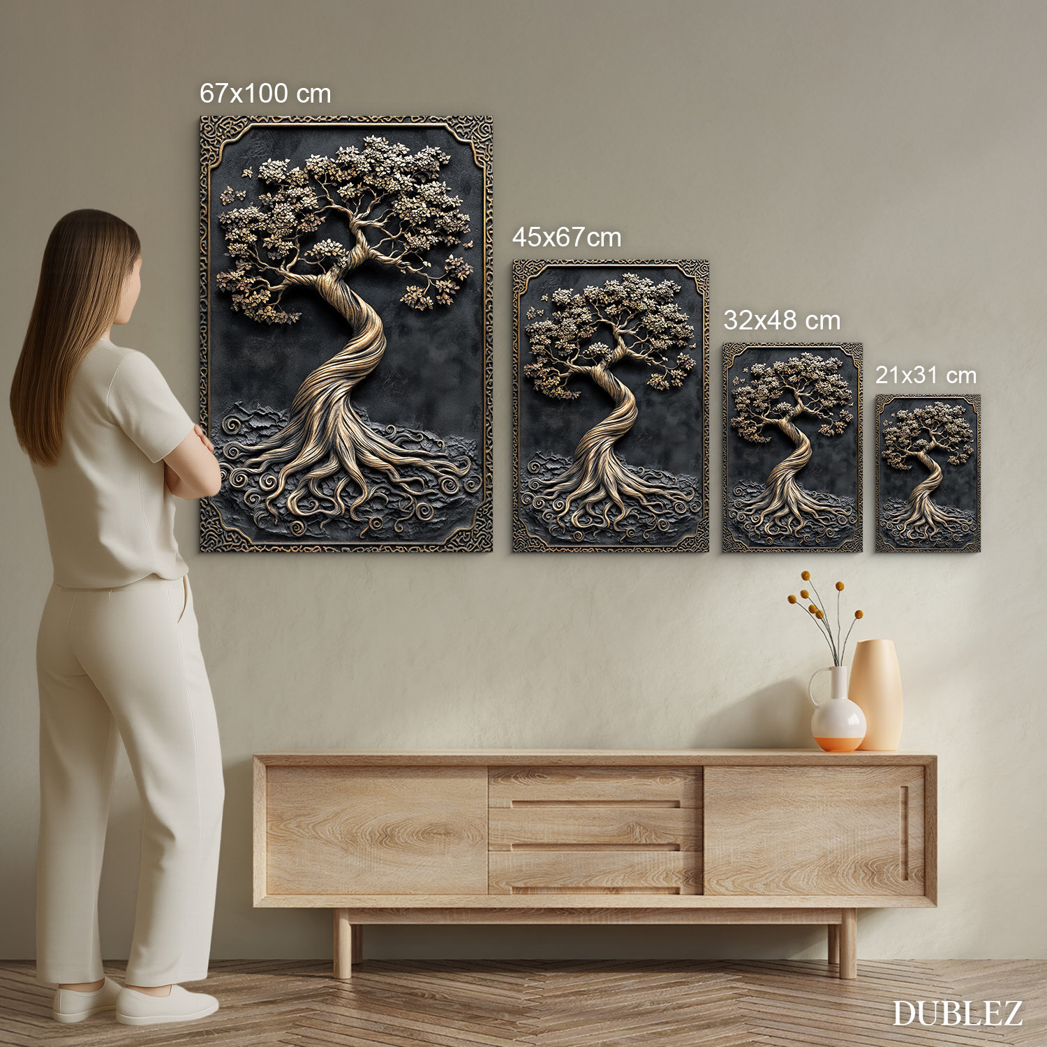Keltský strom života vyniká zakrútenými koreňmi a mohutným kmeňom. Luxusný metalický kontrast medzi tmavým pozadím a bronzovými detailmi. Drevený obraz sa výborne hodí do obývačky, kancelárie alebo chodby, kde umocní pokoj a zároveň zaujme svojou symbolikou. Vhodný aj ako originálny darček pre muža.