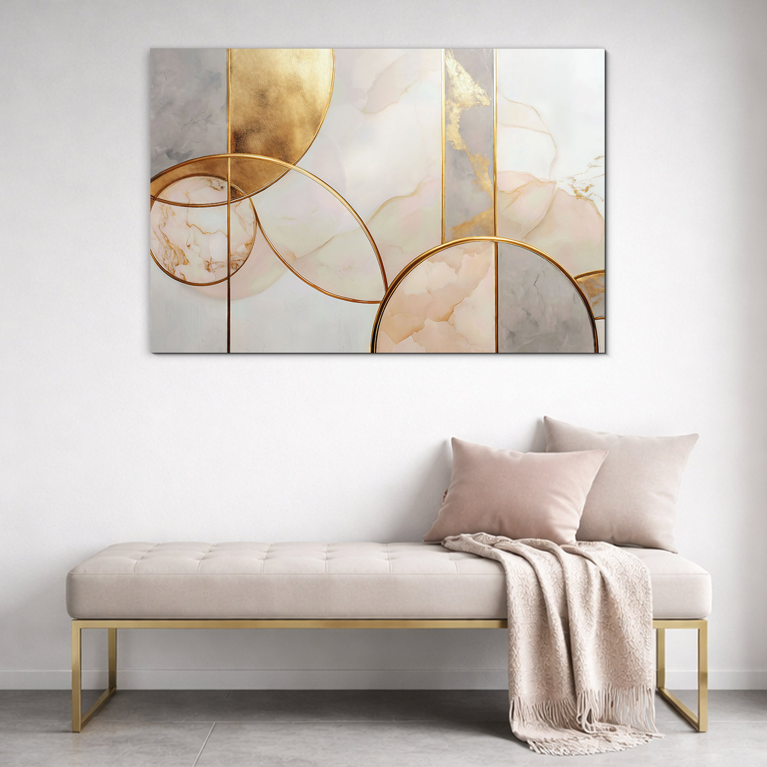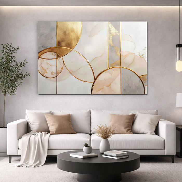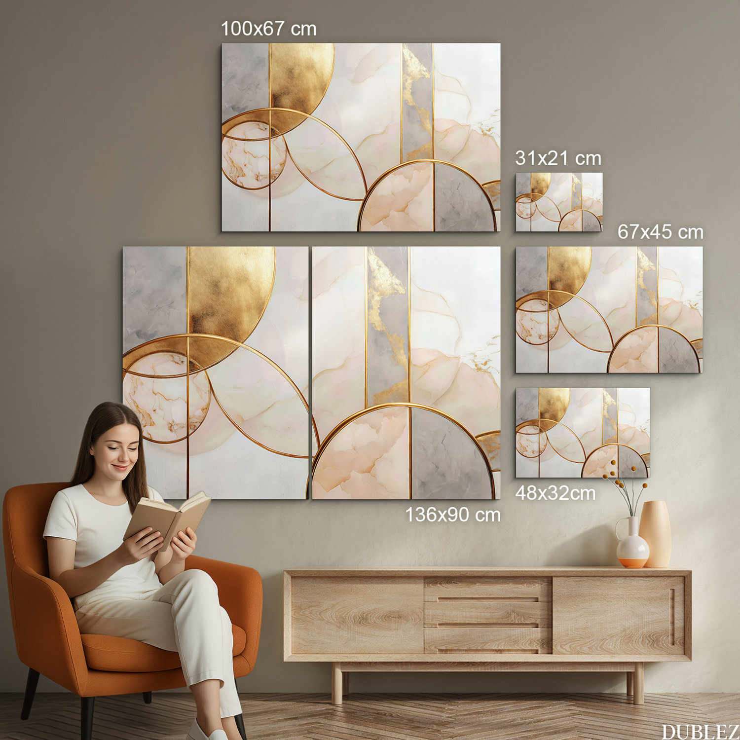 Moderný doplnok, zlaté detaily a jemná elegancia sa spájajú v tomto exkluzívnom obraze. Krásny obraz do obývačky kombinuje mramor v odtieňoch krémovej a sivej s výraznými zlatými kruhmi a líniami. Je to ideálny kúsok pre milovníkov luxusného minimalizmu, ktorý sa skvele hodí nad pohovku v obývačke, do spálne alebo reprezentatívnej chodby