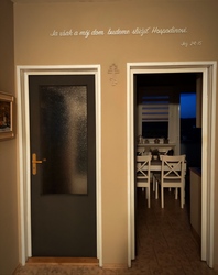 - Po nalepení všetkých častí citátu v šablóne môžete opatrne šablónu odlepiť zo steny. Odporúčame postupovať opatrne, aby ste predišli poškodeniu omietky.