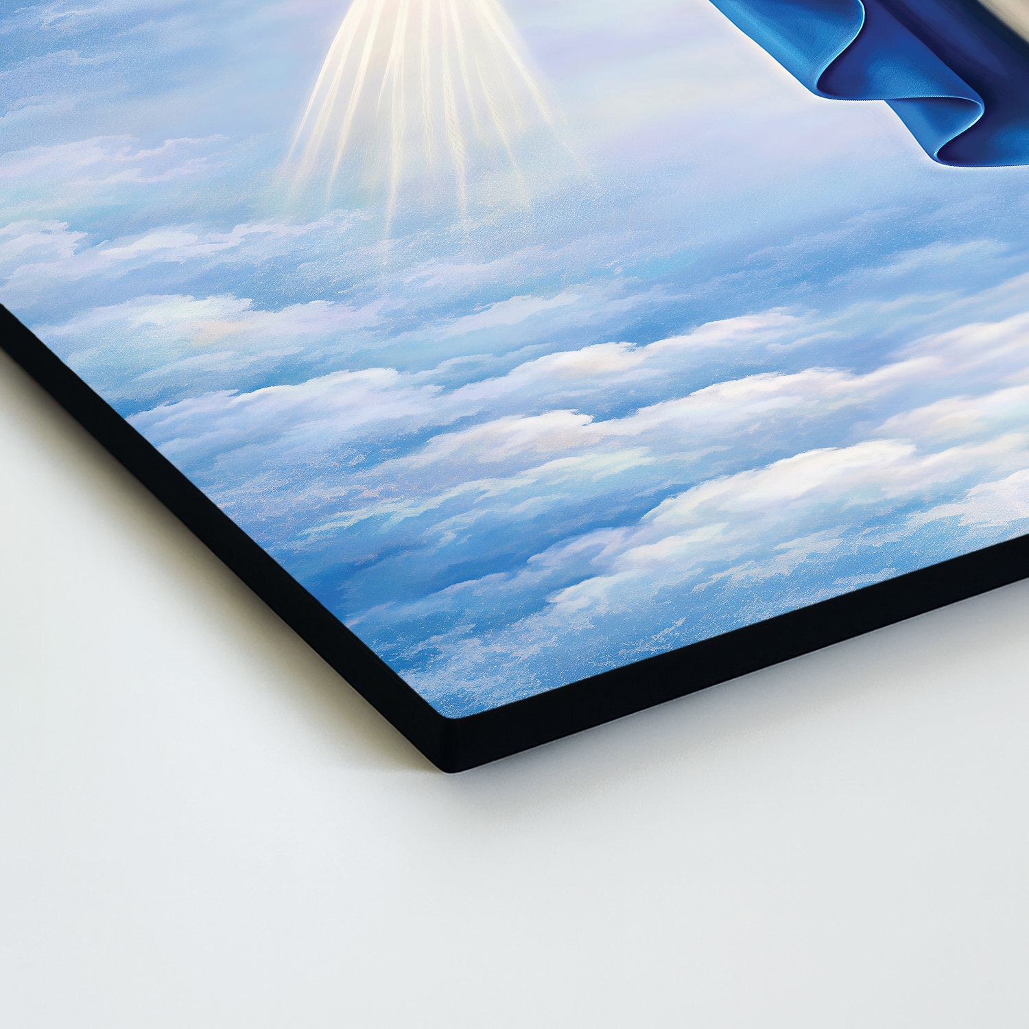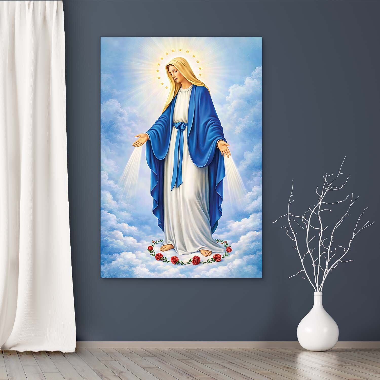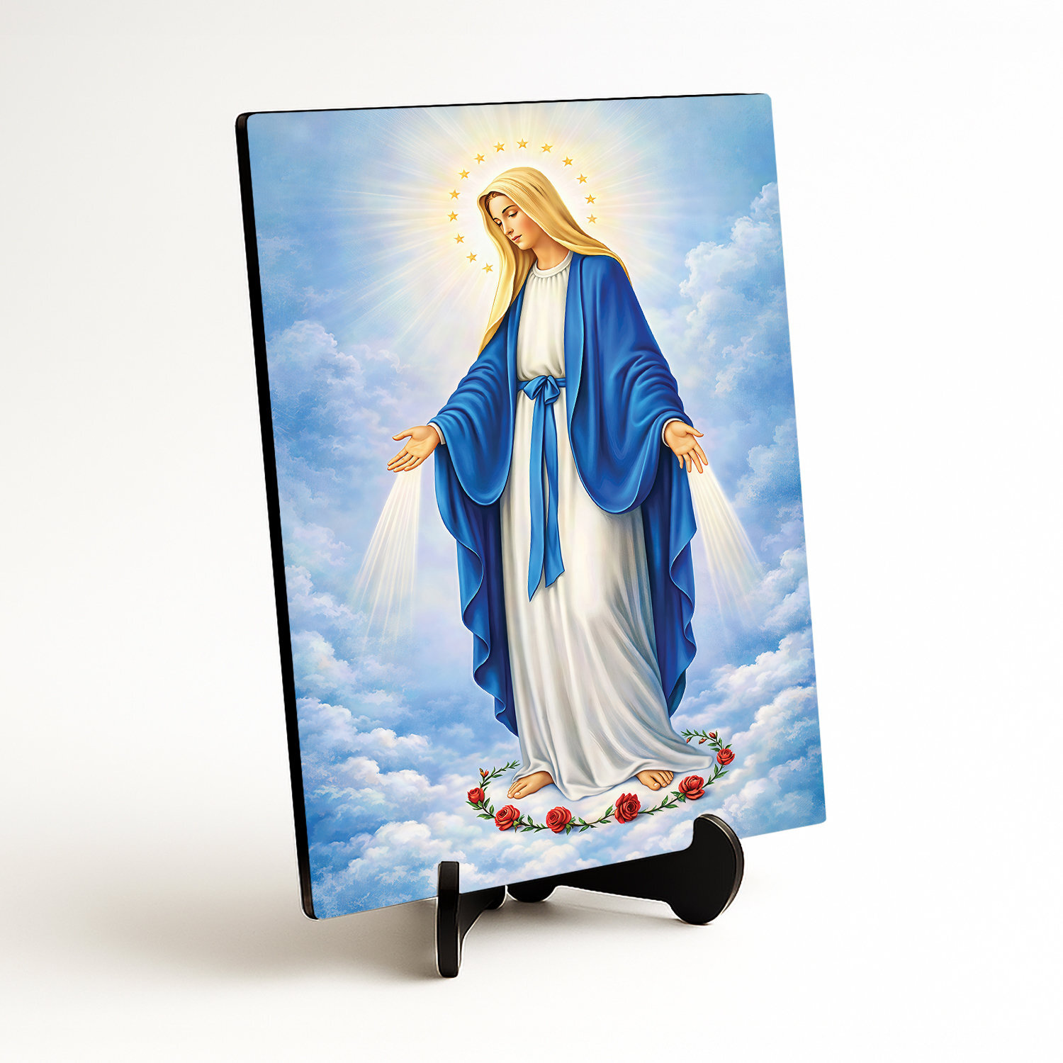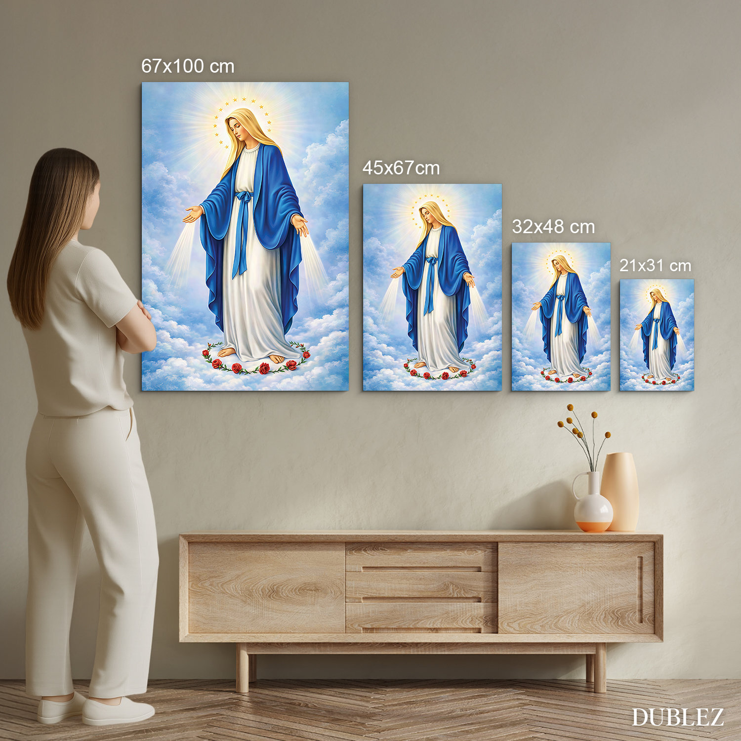 Nástenný obraz - Panna Mária Milostivá prináša do domova nebeský pokoj, svetlo a pocit nekonečnej ochrany. Postava Panny Márie, odiata v žiarivo bielom rúchu a blankytne modrom plášti, stojí uprostred jemných oblakov, pričom z jej dlaní vychádzajú lúče milosti. Svätý obraz na prírodnom dreve vďaka špičkovej UV tlači vyniká čistotou farieb a jemnosťou detailov, od dvanástich hviezd okolo jej hlavy až po veniec červených ruží pri jej nohách. Je to ideálny darček k prvému svätému prijímaniu, birmovke, narodeniu dieťaťa alebo ako prejav úcty a lásky pre starých rodičov.