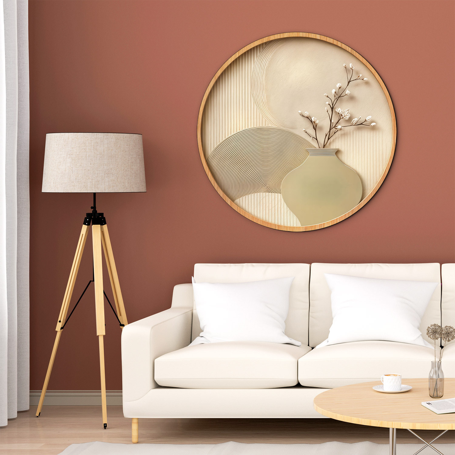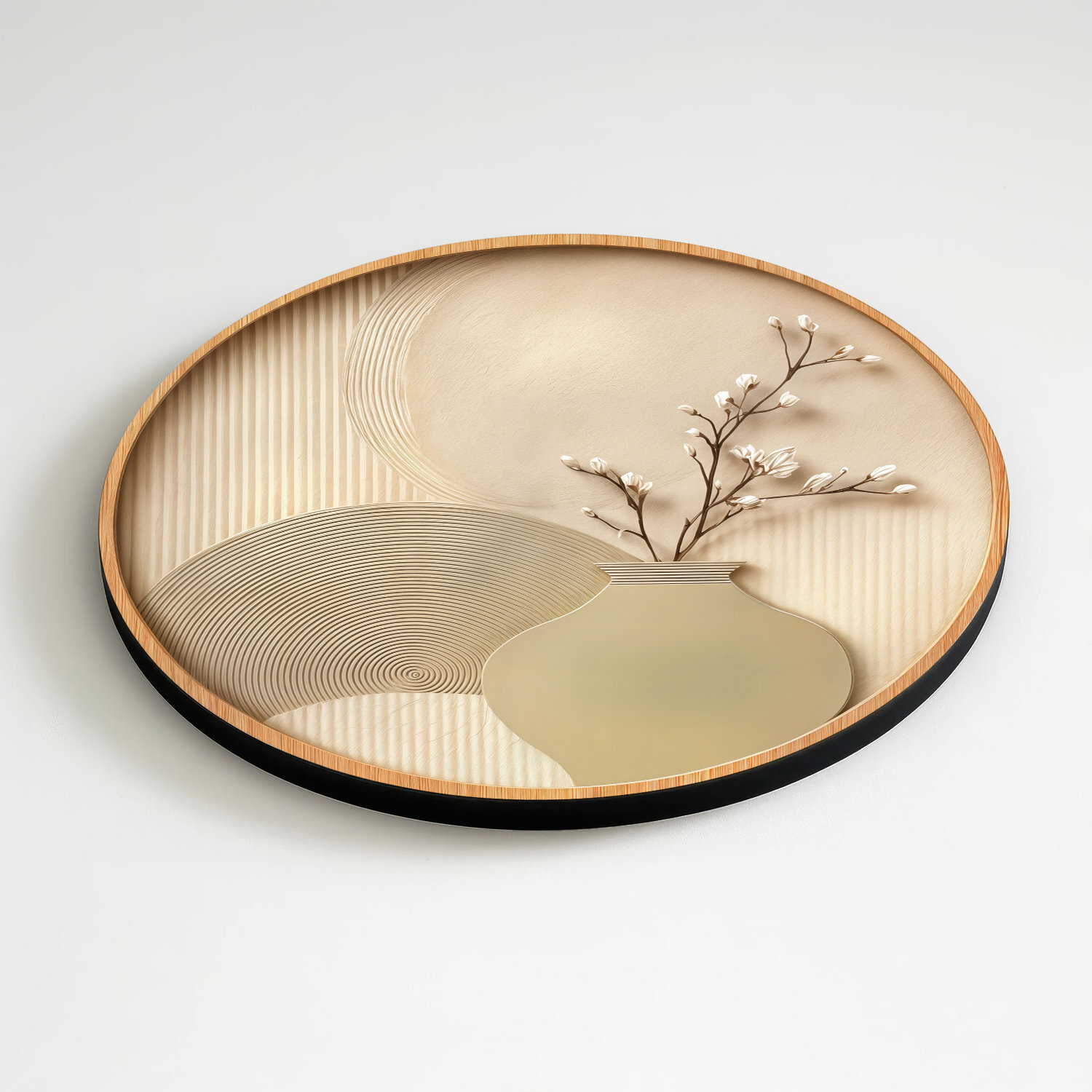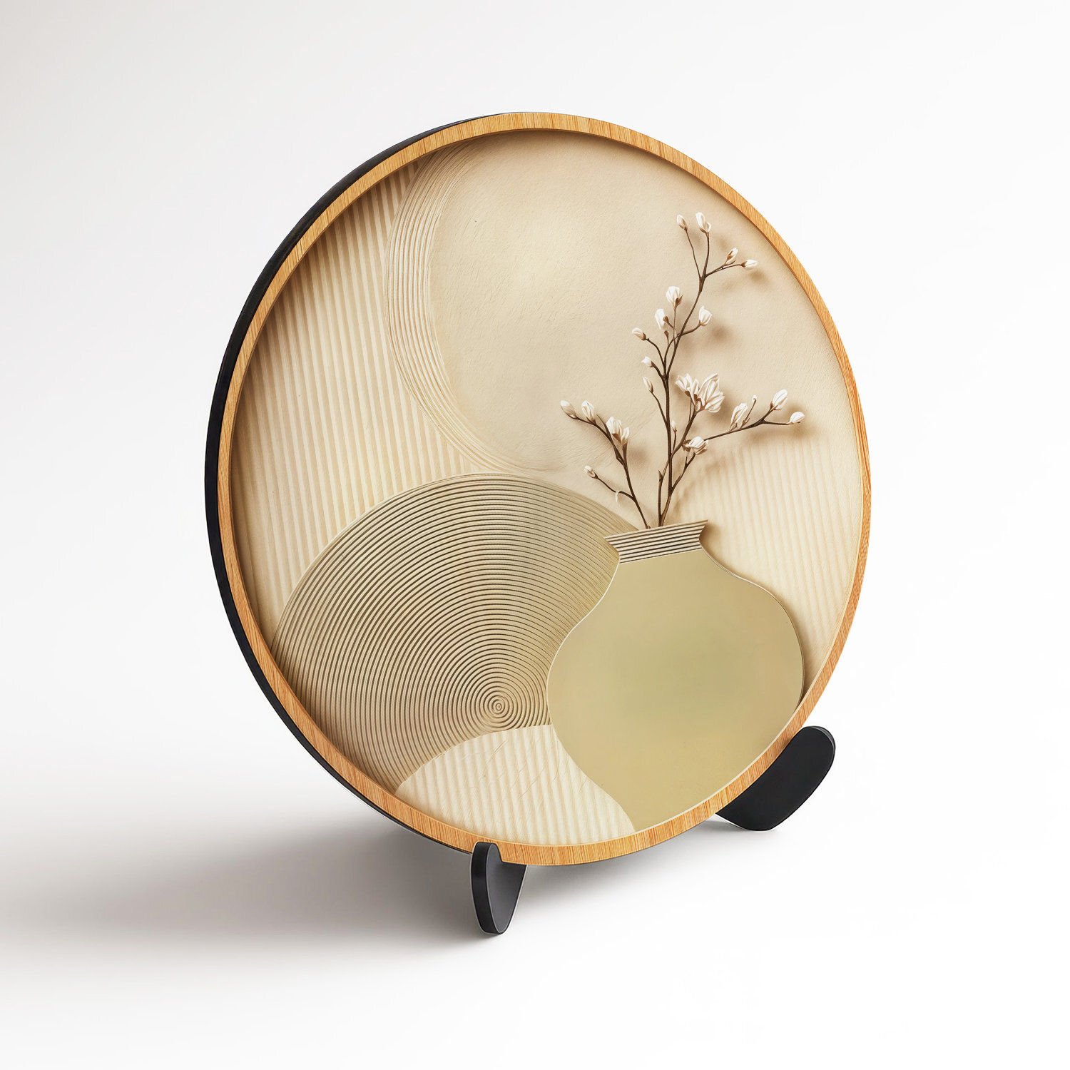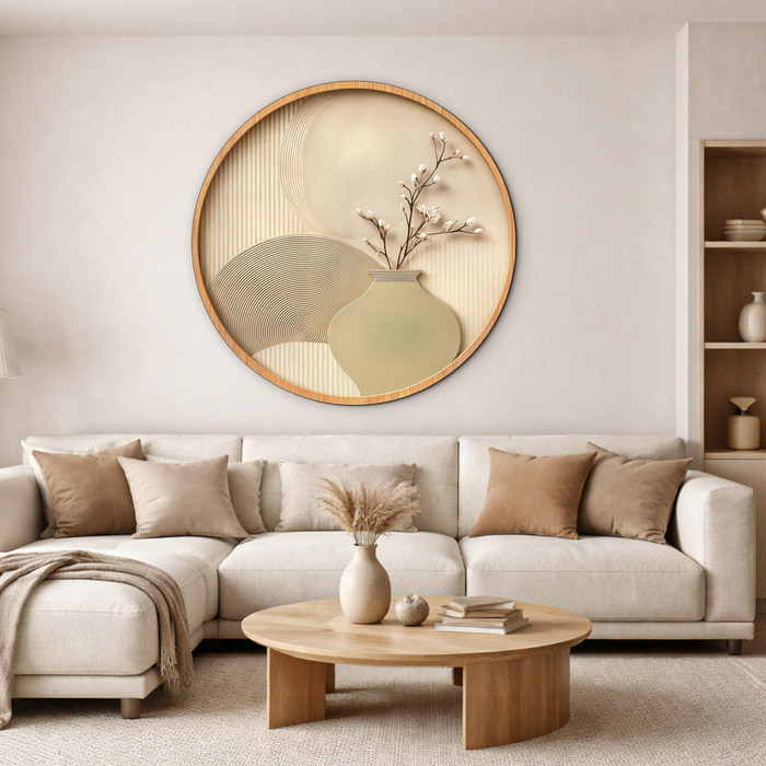 Minimalistický kruhový obraz je dokonalým vyjadrením pokoja a modernej bohémskej estetiky. Jemné pieskové textúry s precíznymi geometrickými líniami, ktoré pripomínajú zenové záhrady. Elegantná váza s rozkvitnutou vetvičkou vnáša do interiéru organickú jemnosť a pocit prírodnej harmónie. Drevený obraz vynikne najmä v svetlo ladených obývačkách, spálňach v štýle Japandi alebo v moderných kanceláriách, kde chcete vytvoriť upokojujúcu atmosféru.