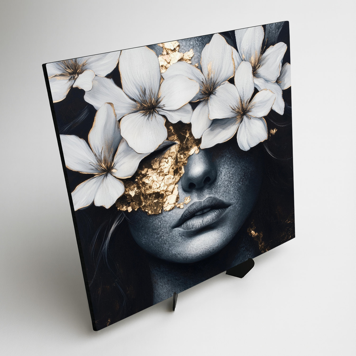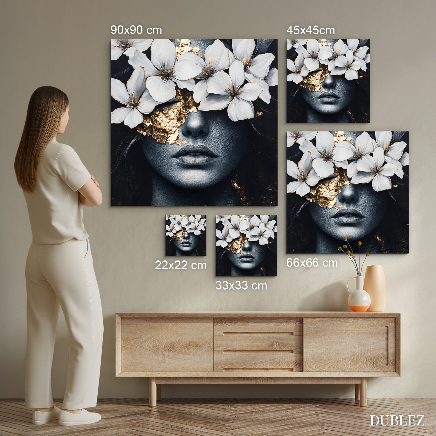 Luxusný obraz ženy so zlatými detailmi a bielymi kvetmi je jedinečným umeleckým doplnkom, ktorý premení váš interiér na galériu. Minimalistické čiernobiele tóny so zlatým prvkom, ktorý dodáva dielu noblesu a moderný glamour efekt. Drevený obraz sa perfektne hodí do obývačky, spálne či štýlovej kancelárie a ľahko sa kombinuje s tmavým aj svetlým zariadením.