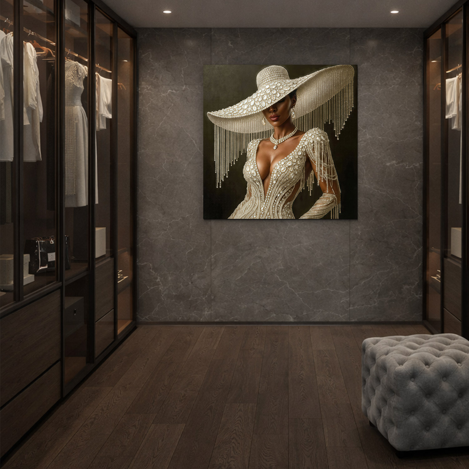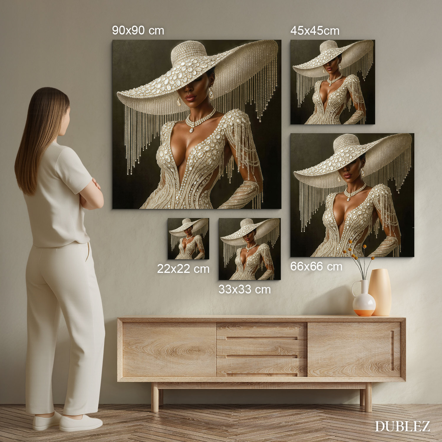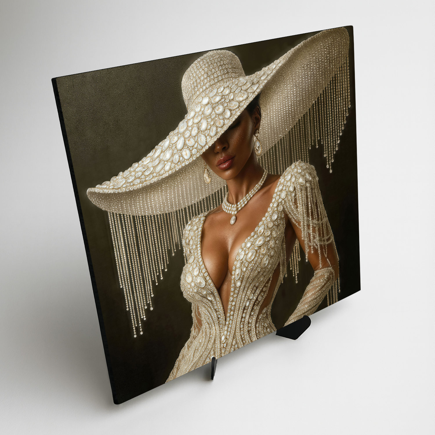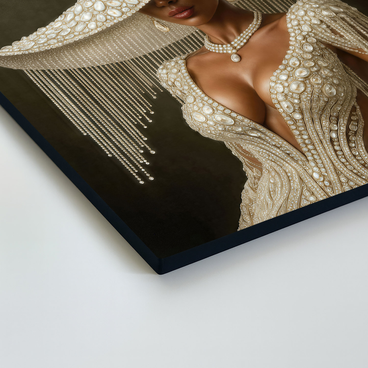 Luxusný glamour obraz ženy v perlovo zdobených šatách prináša do interiéru eleganciu, zmyselnosť a nádych mimoriadneho štýlu. Výrazné detaily, precízna kompozícia a kontrast medzi svetlom a tieňom robia z tohto obrazu skutočný zážitok. Ideálny do moderných, elegantných alebo minimalistických priestorov, napríklad do obývačky, šatníka, spálne alebo módneho ateliéru. Vďaka svojmu štýlu osloví predovšetkým ženy so zmyslom pre krásu, dizajn a noblesu.