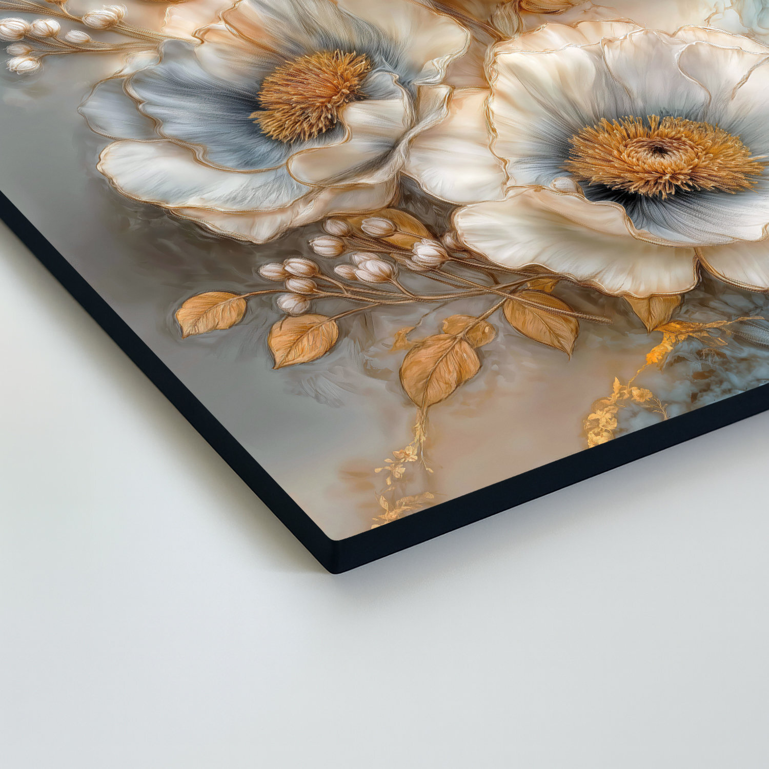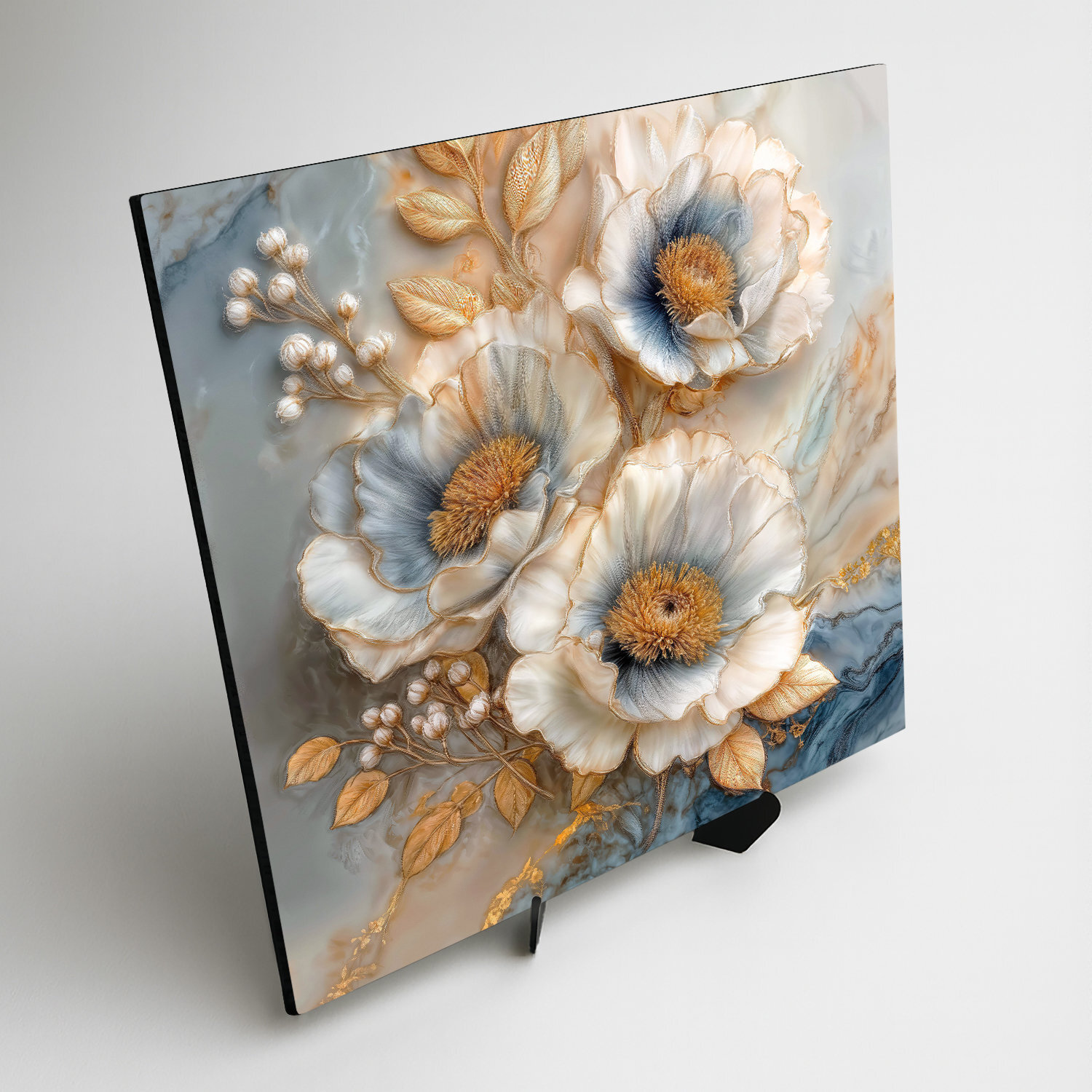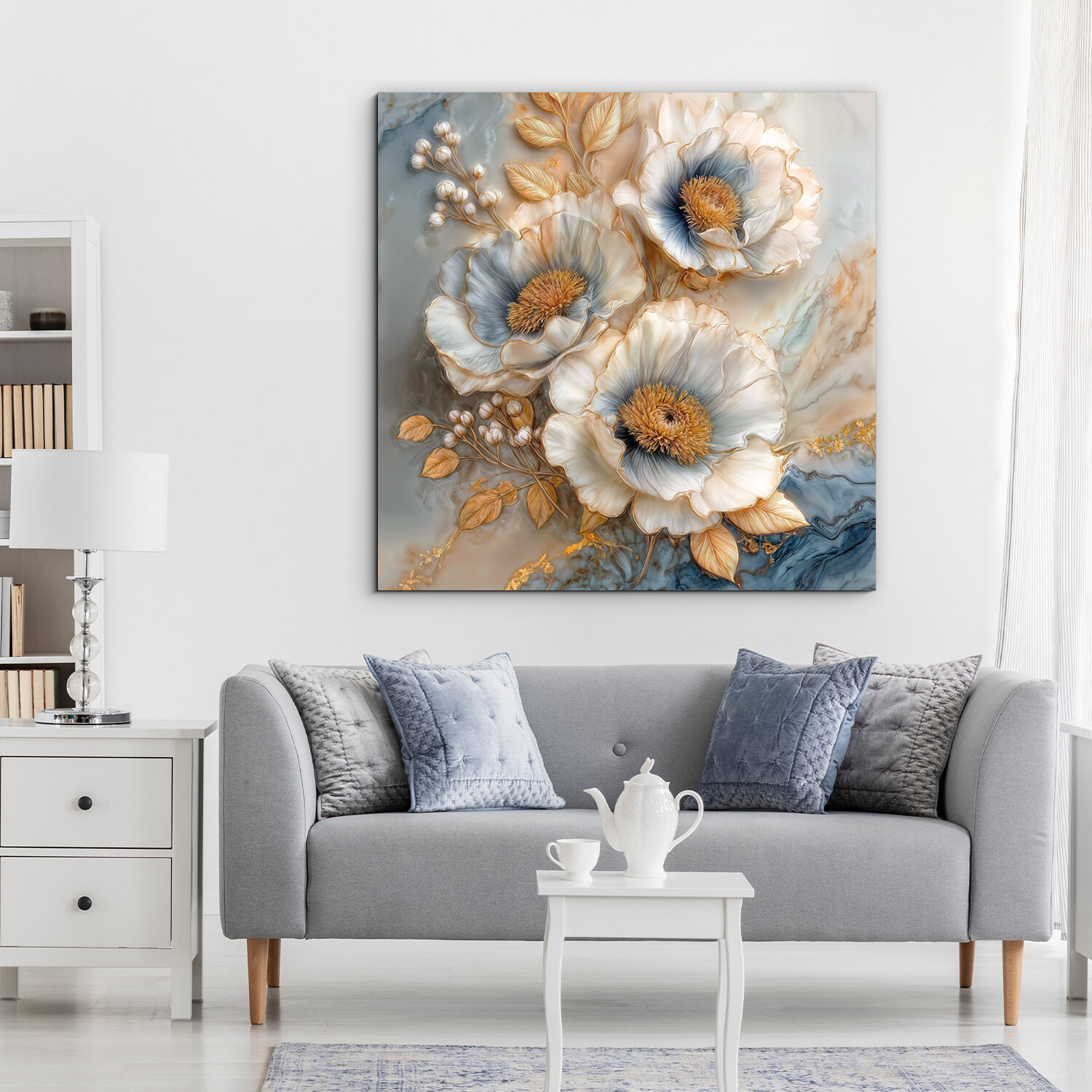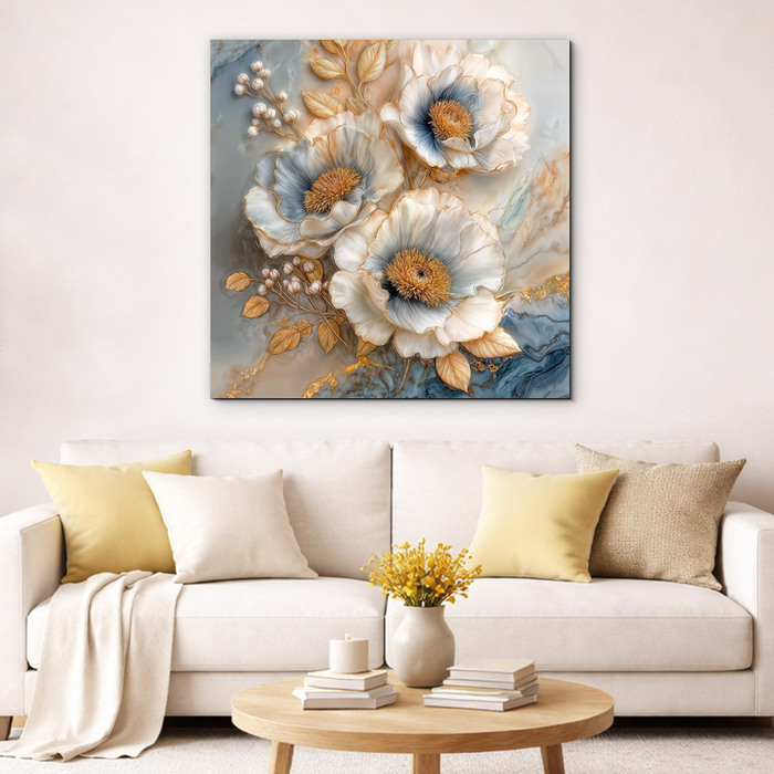 Elegantný obraz spája nehu kvetov s luxusom mramorového dizajnu a zlatých detailov. Tri rozkvitnuté kvety v jemných bielo-modrých tónoch sú doplnené o zlatisté listy a drobné púčiky, ktoré vystupujú z abstraktného pozadia. Je ideálnou voľbou ako dominantná dekorácia nad svetlú sedačku v obývačke, do štýlovej spálne alebo do moderných priestorov zariadených v glamour či minimalistickom štýle.