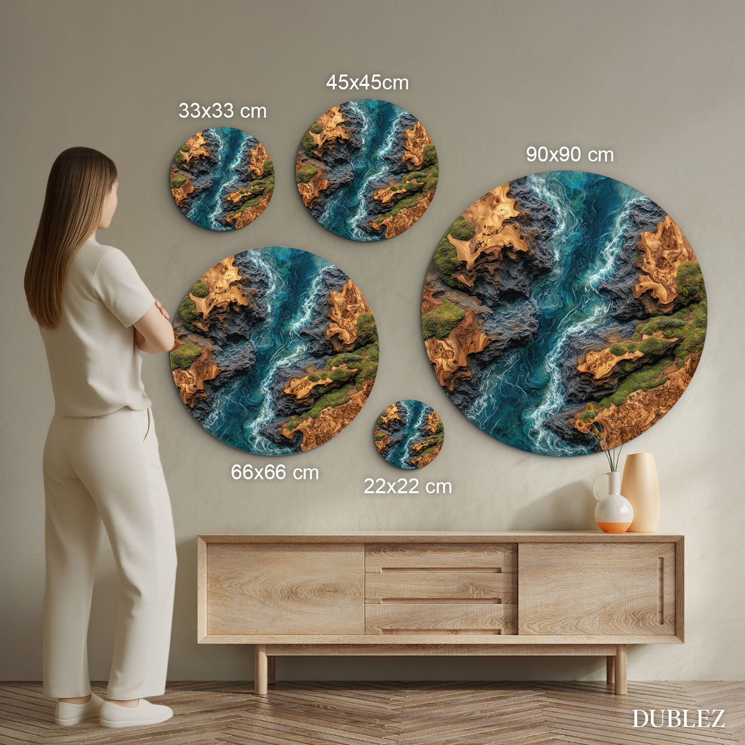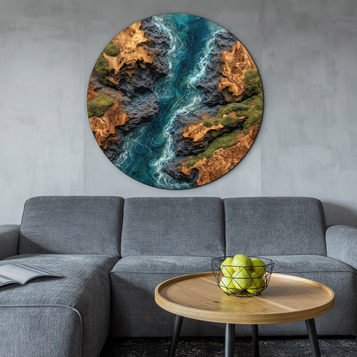 Luxusný kruhový obraz – Element vody je moderný obraz na stenu s realistickou imitáciou epoxidovej rieky v dreve. Tyrkysový „epoxidový“ efekt verne napodobňuje živicu rozliatu medzi prírodnou kresbou dreva, doplnenú detailom skál a machu. Obraz je vytlačený pomocou kvalitnej UV tlače priamo na drevo, čo zaručuje ostré detaily, sýte farby a dlhodobú stálosť bez vyblednutia. Vynikne najmä nad sedačkou v obývačke, v pracovni, kancelárii alebo v spálni. Skvelo zapadne do moderného, industriálneho, loftového či prírodného interiéru.