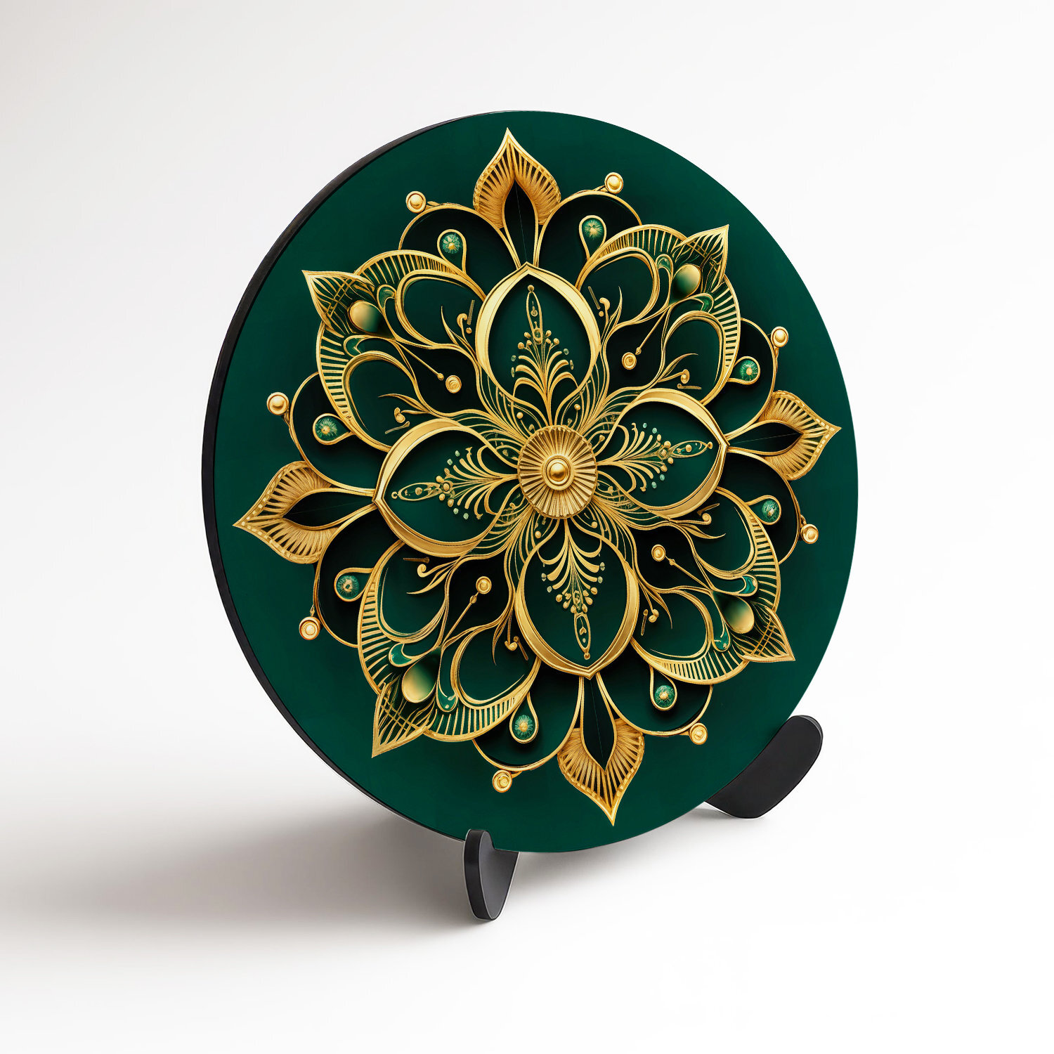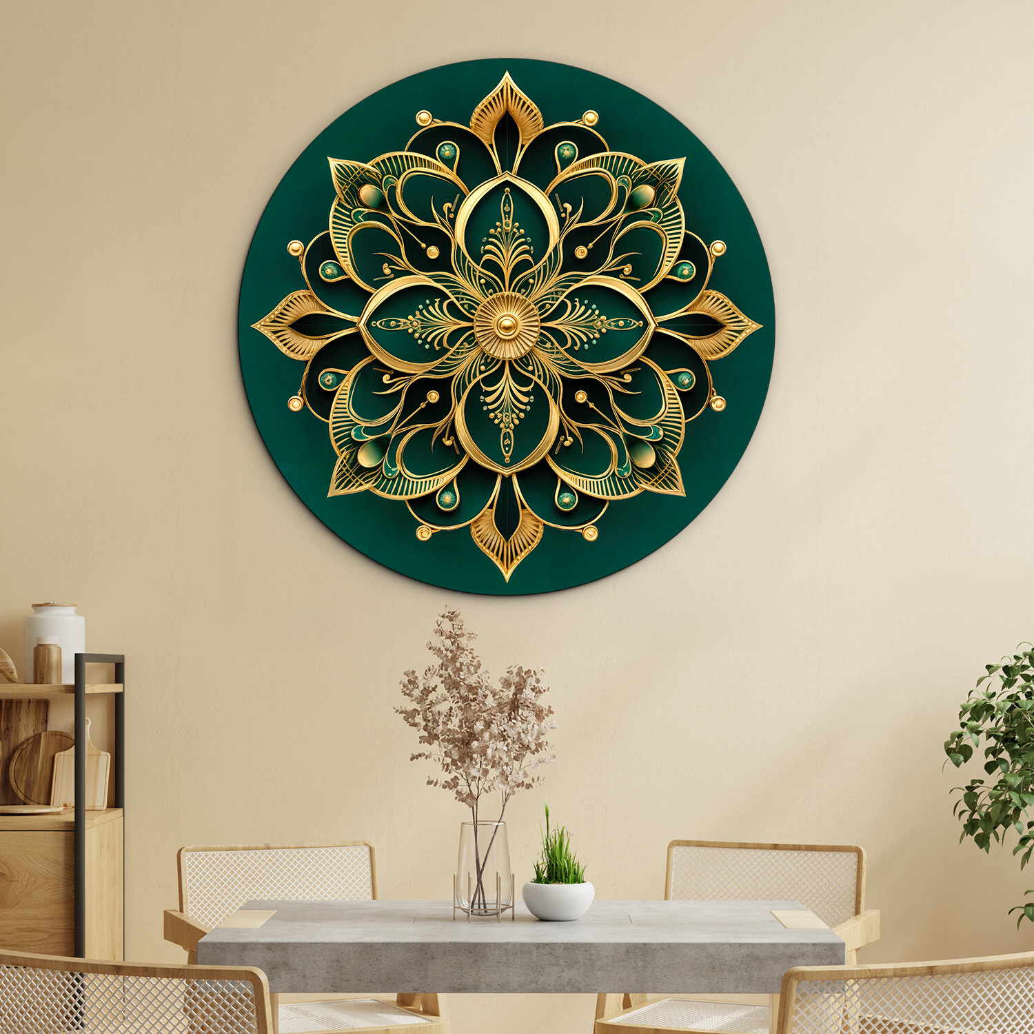 Luxusná mandala, ktorá očarí na prvý pohľad. Drevená okrúhla mandala v zeleno-zlatom prevedení kombinuje duchovný symbol s moderným dizajnom. Detailné ornamenty a žiarivé farby dodávajú obrazu eleganciu a štýl. Skvele sa hodí do obývačky, jedálne, spálne alebo kancelárie.