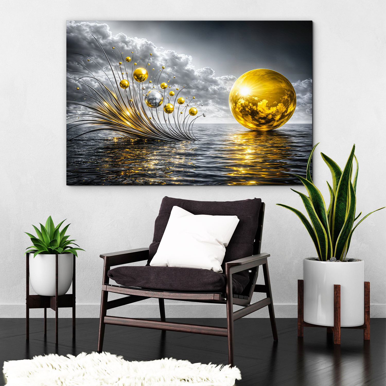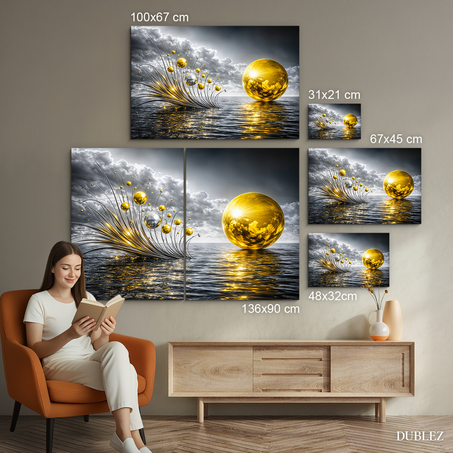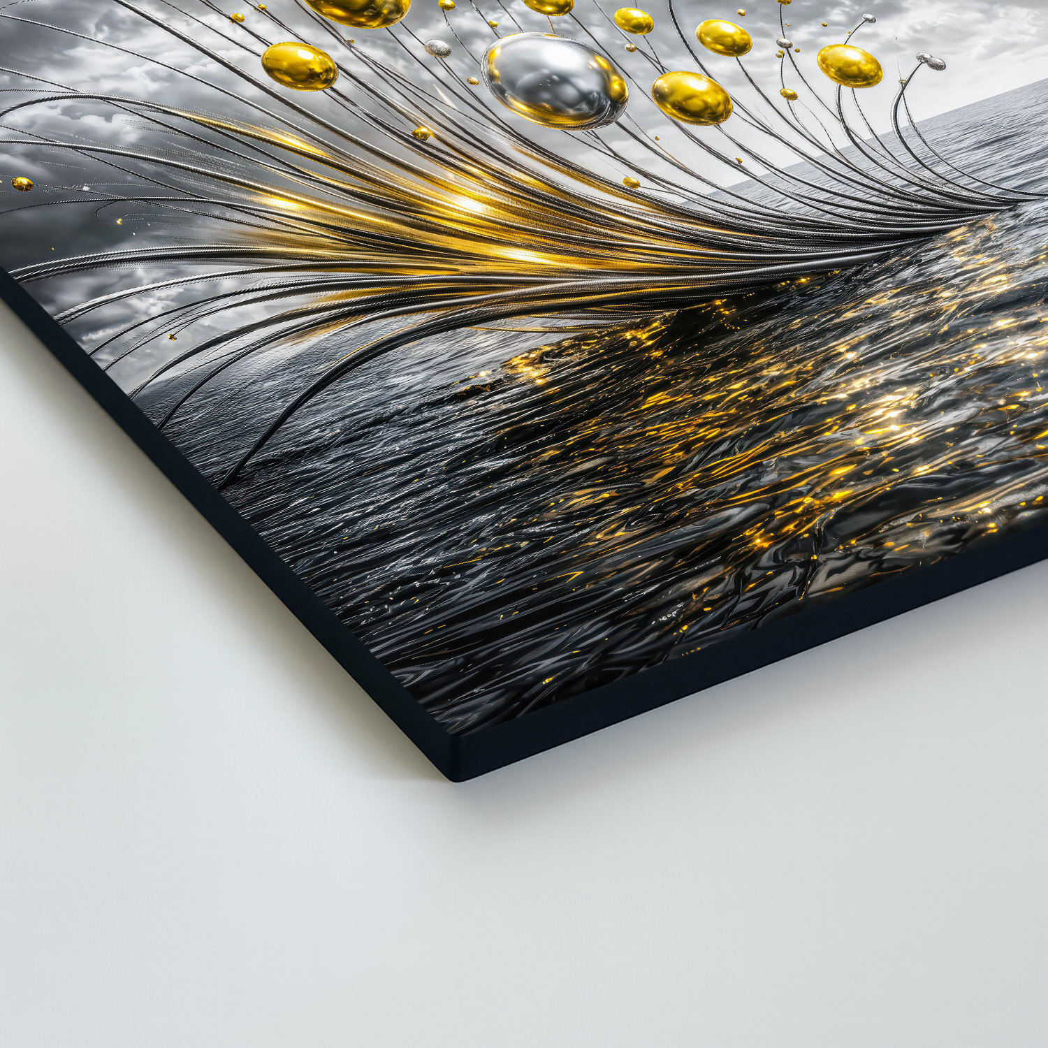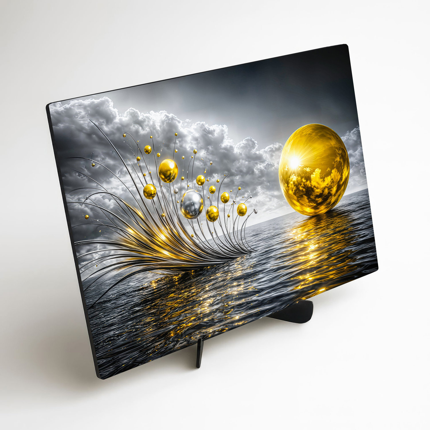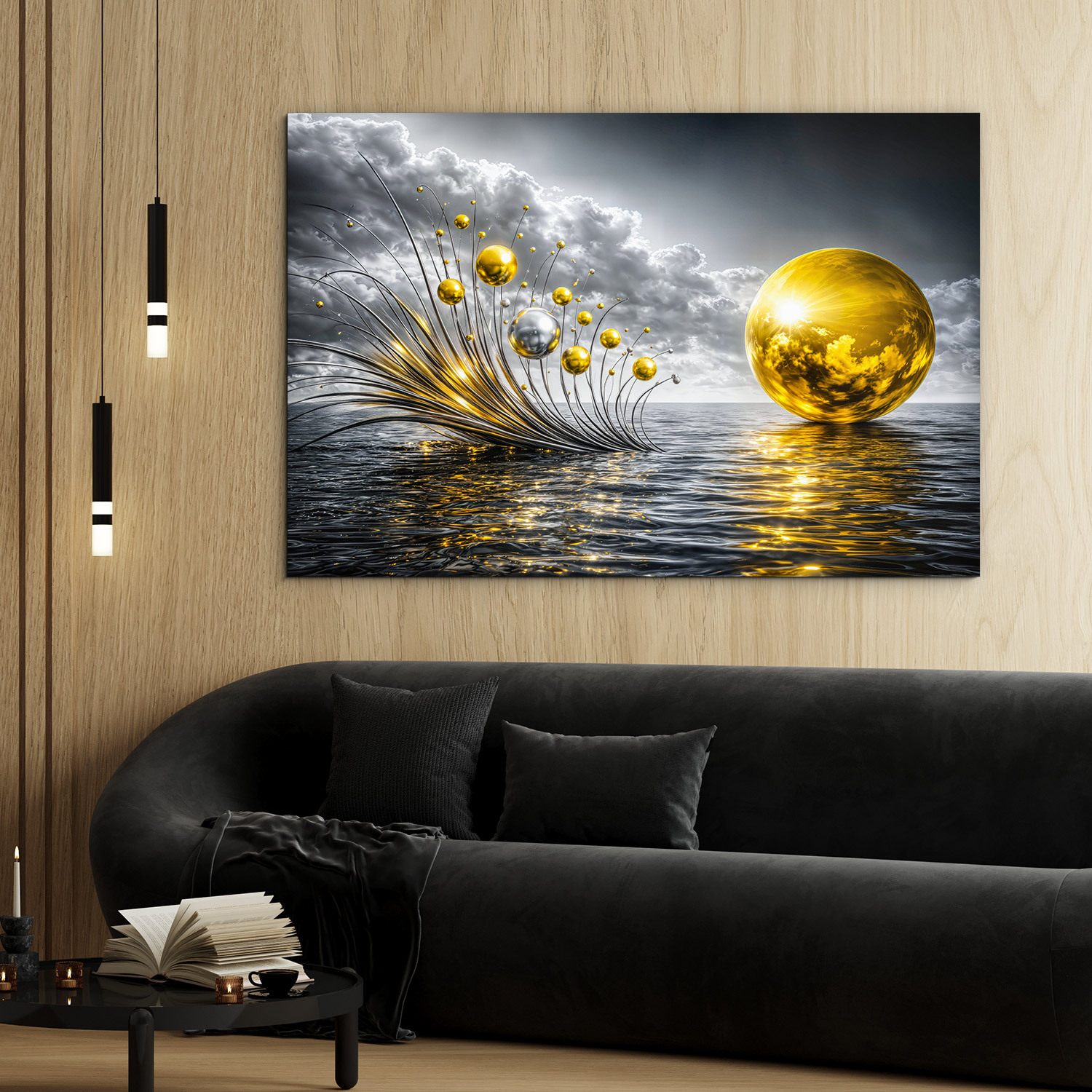 Drevený obraz so zlatými sférami nad vodnou hladinou prináša do interiéru luxus, eleganciu a prémiový vzhľad. Zlaté a strieborné odlesky, kovové prvky, dramatická obloha a hladina mora okamžite pritiahnu pozornosť a dodajú miestnosti exkluzívny nádych. Drevený obraz krásne vynikne v obývačke, kuchyni aj kancelárii. Skvele sa hodí do moderného, glamour, luxusného aj elegantného interiéru a zároveň poteší ako originálny darček pre milovníkov abstraktného umenia.
