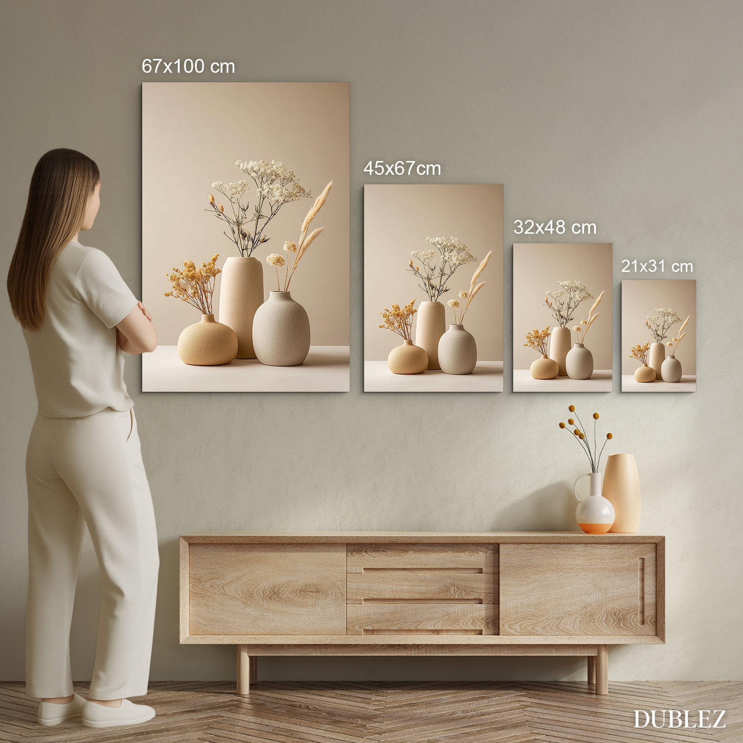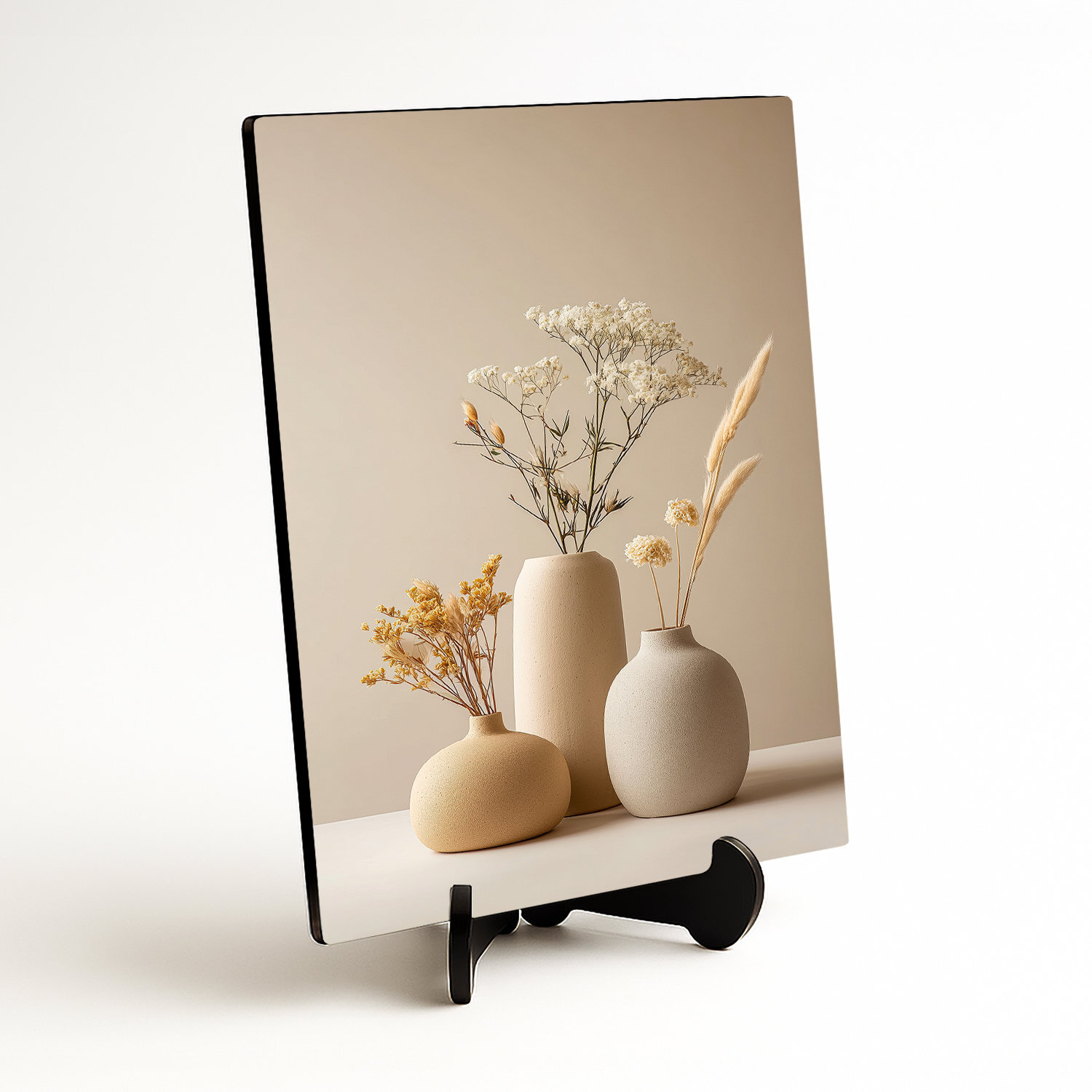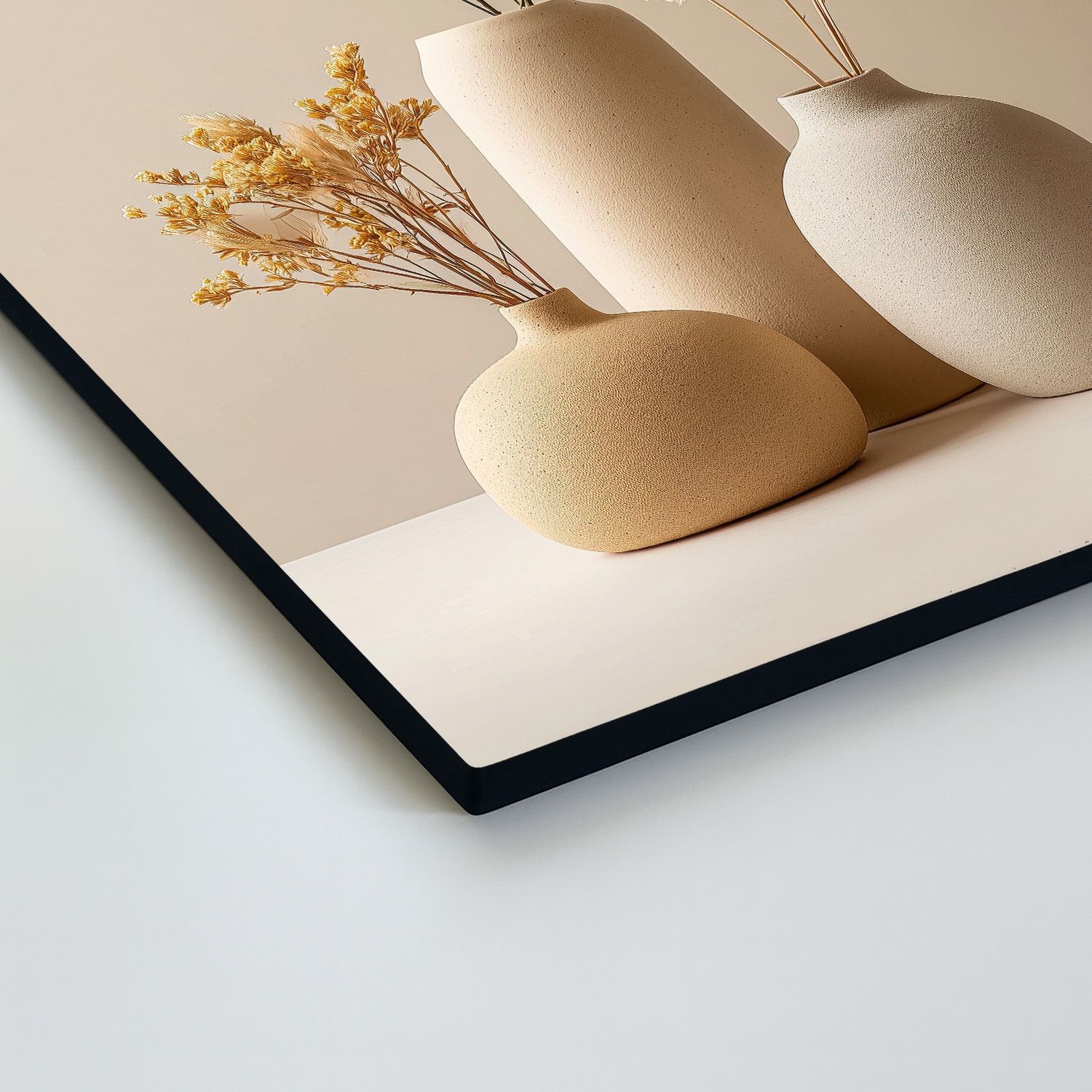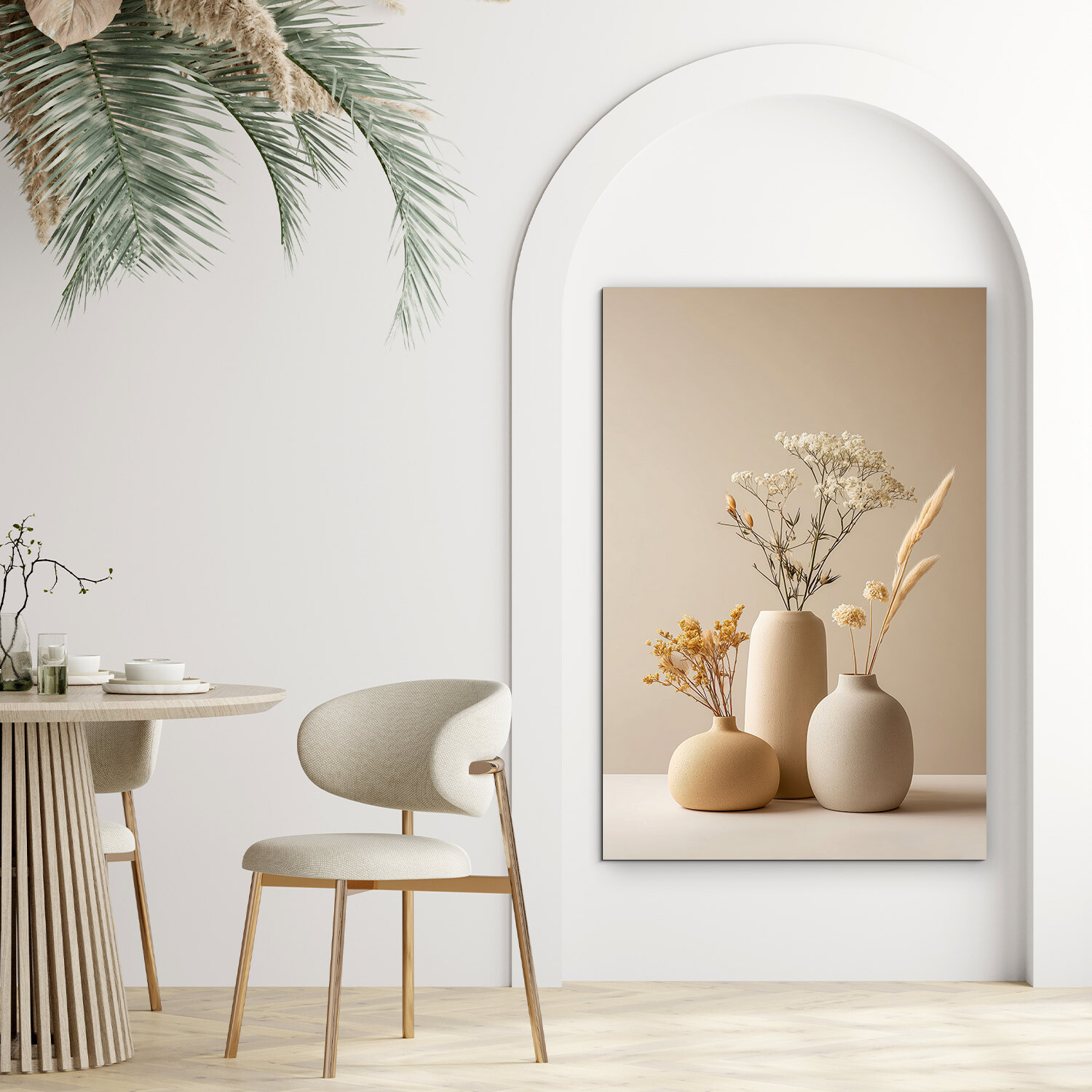 Drevený obraz s minimalistickým zátiším prináša do interiéru pokoj a čistotu. Tri keramické vázy v jemných béžových odtieňoch dopĺňajú sušené kvety a trávy. Neutrálna paleta použitých farieb sa ľahko kombinuje s drevom, kameňom aj svetlými stenami, takže obraz na stenu krásne zapadne do moderného bytu aj útulnej domácnosti. Skvele vynikne v chodbe, nad komodou v obývačke alebo v spálni.