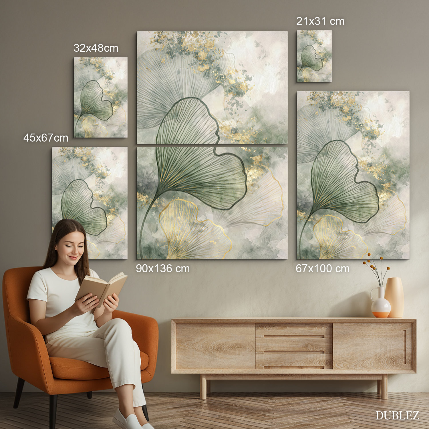 Drevený obraz ginkgo prináša čistú líniu listov smerujúcich nahor, čím dodáva interiéru ľahkosť a vzdušnosť. Dizajn využíva zlaté kontúry a prekrývajúce sa zelené plochy na bledom podklade. Minimalistický obraz ginkgo je ideálnou voľbou do úzkych chodieb alebo spální, kde pôsobí elegantne a nerušivo.