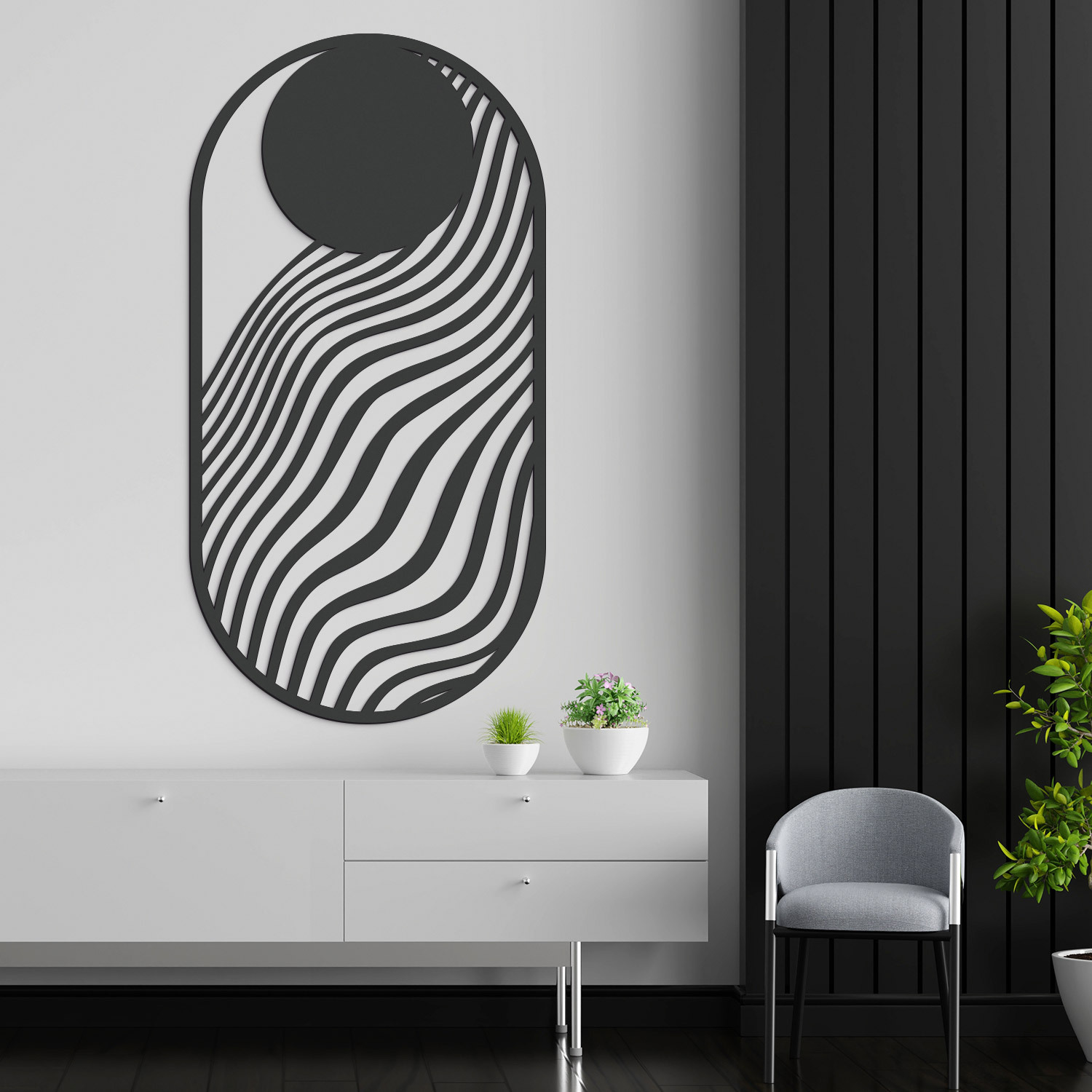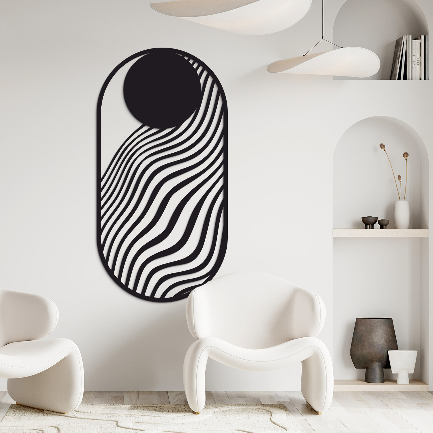 Moderný geometrický obraz na stenu vyniká čistými líniami a minimalistickým dizajnom. Pôsobí elegantne, nadčasovo a zároveň opticky zväčšuje priestor. Vďaka svojmu tvaru a jemnej dynamike prúdiacich línií sa skvele hodí do obývačky, kancelárie či chodby. Je to aj originálny darček pre milovníkov moderného a minimalistického interiéru.