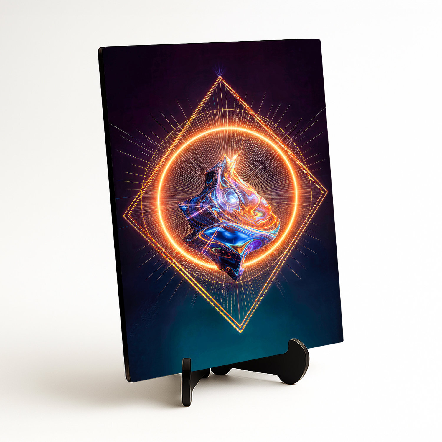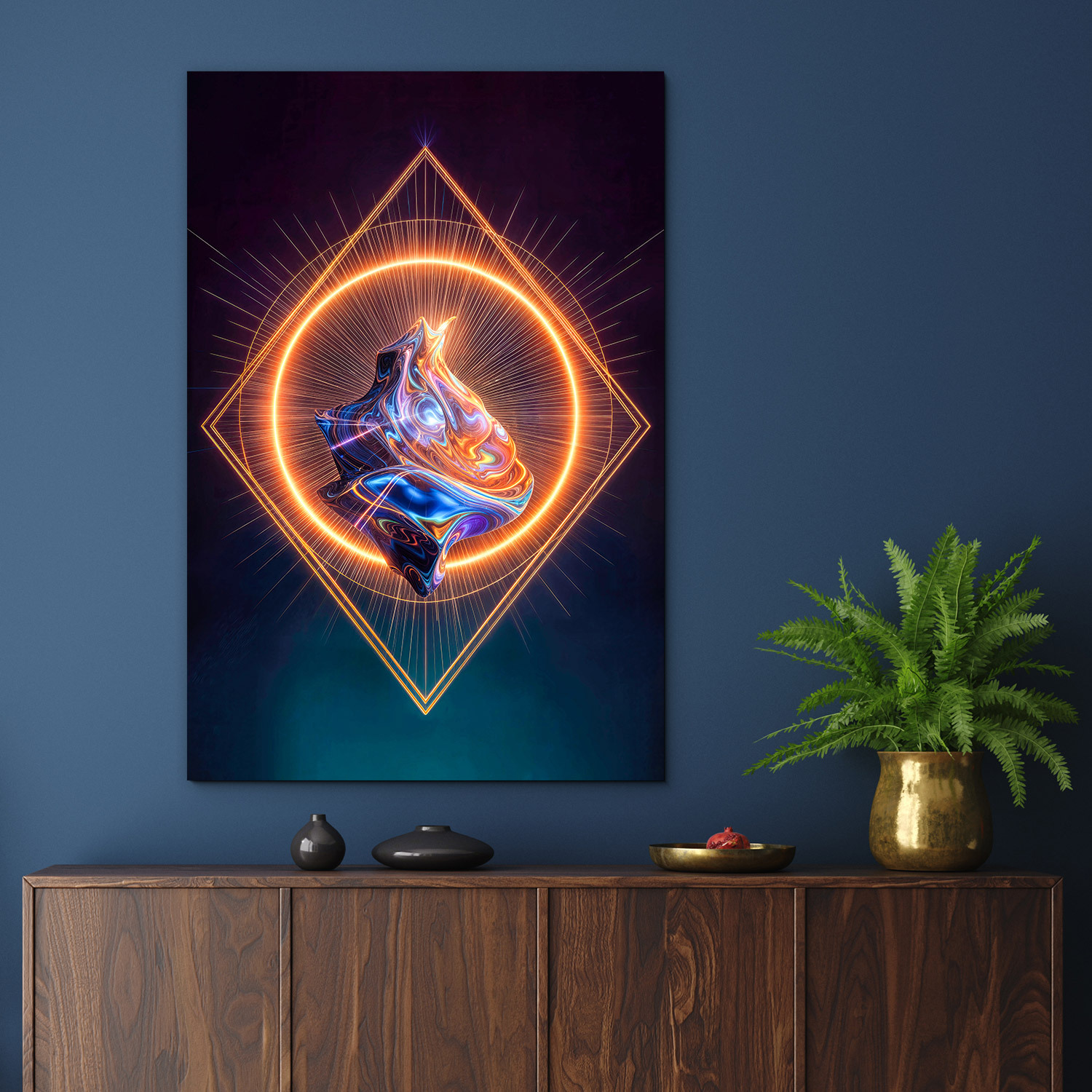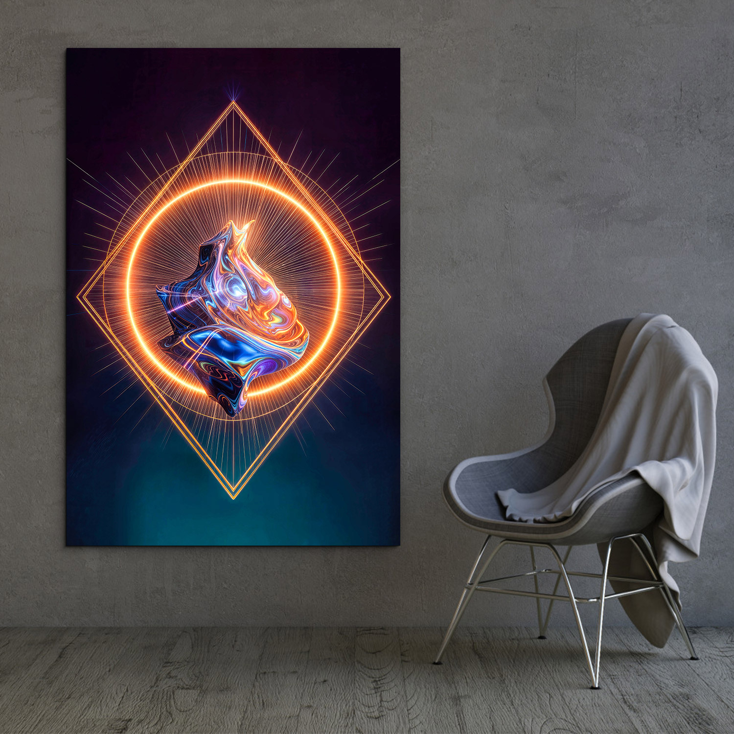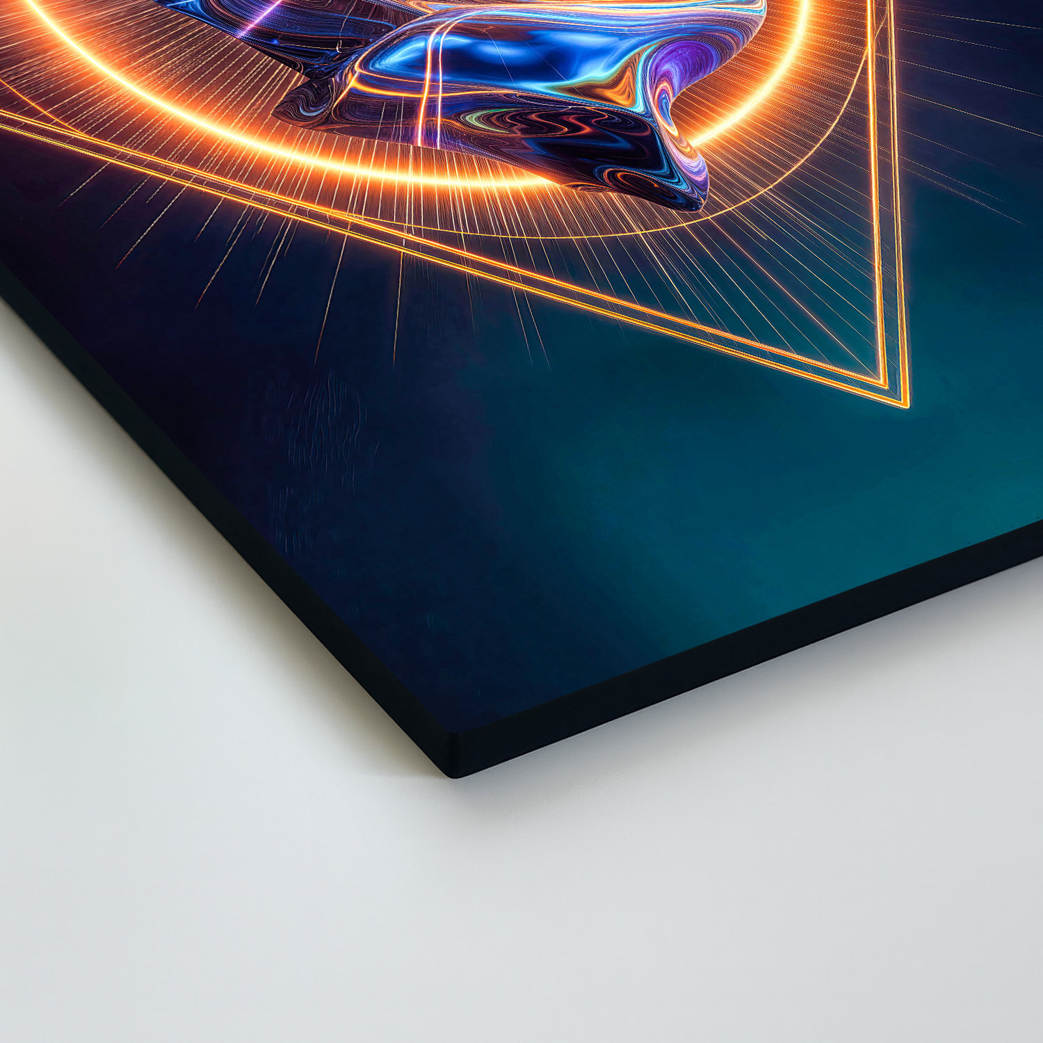 Moderný obraz s výraznou neónovou geometriou a abstraktným farebným jadrom zaujme na prvý pohľad svojím futuristickým spracovaním. Žiarivý kruh, precízne línie a centrálne jadro vytvárajú obraz, ktorý pôsobí moderne, energicky a originálne. Skvelo vynikne v industriálnom, minimalistickom aj futuristicky ladenom interiéri a poteší každého, kto obľubuje abstraktné umenie, technický dizajn a výrazné dekorácie.
