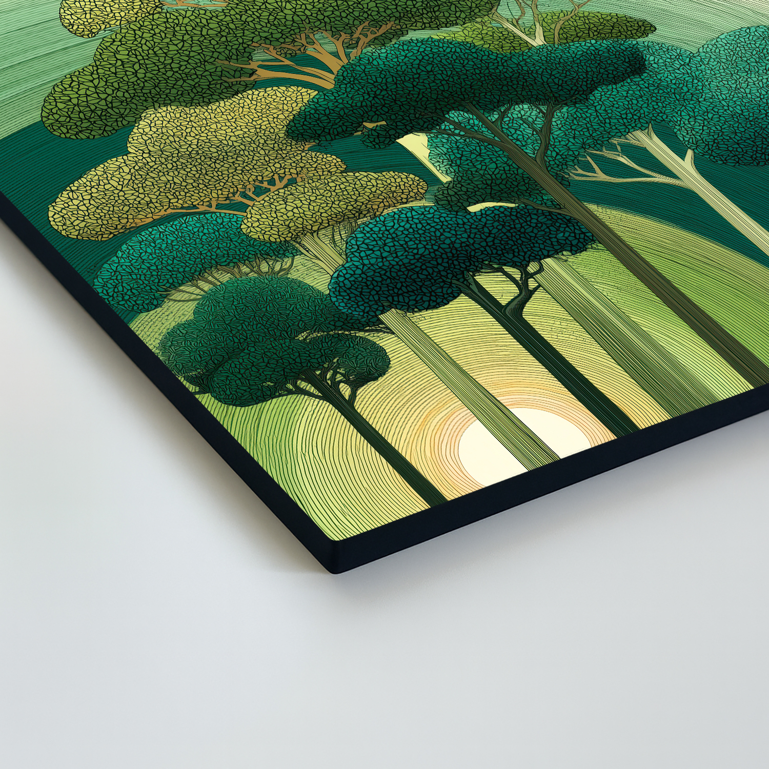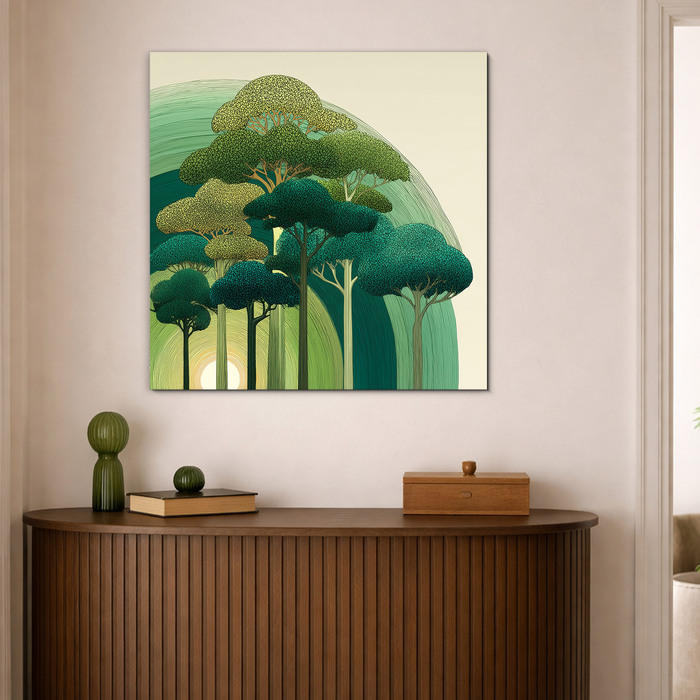 Vneste do svojho domova pokoj hlbokého lesa v modernom, minimalistickom štýle. Umelecký obraz Dotyk lesa nie je len obyčajnou dekoráciou, ale dokonalým doplnkom do každého interiéru. Kombinácia sýtych smaragdových a machových odtieňov s precíznymi kruhovými líniami vytvára harmonický celok, ktorý dýcha čistotou.