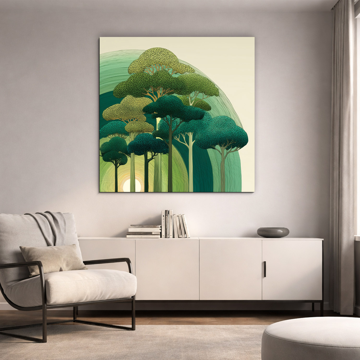 Význam obrazu: Vrstvenie korún stromov v kruhových prstencoch symbolizuje kolobeh života a nekonečnú energiu rastu. Geometrické pozadie evokujúce východ slnka prináša do priestoru svetlo a poriadok.
