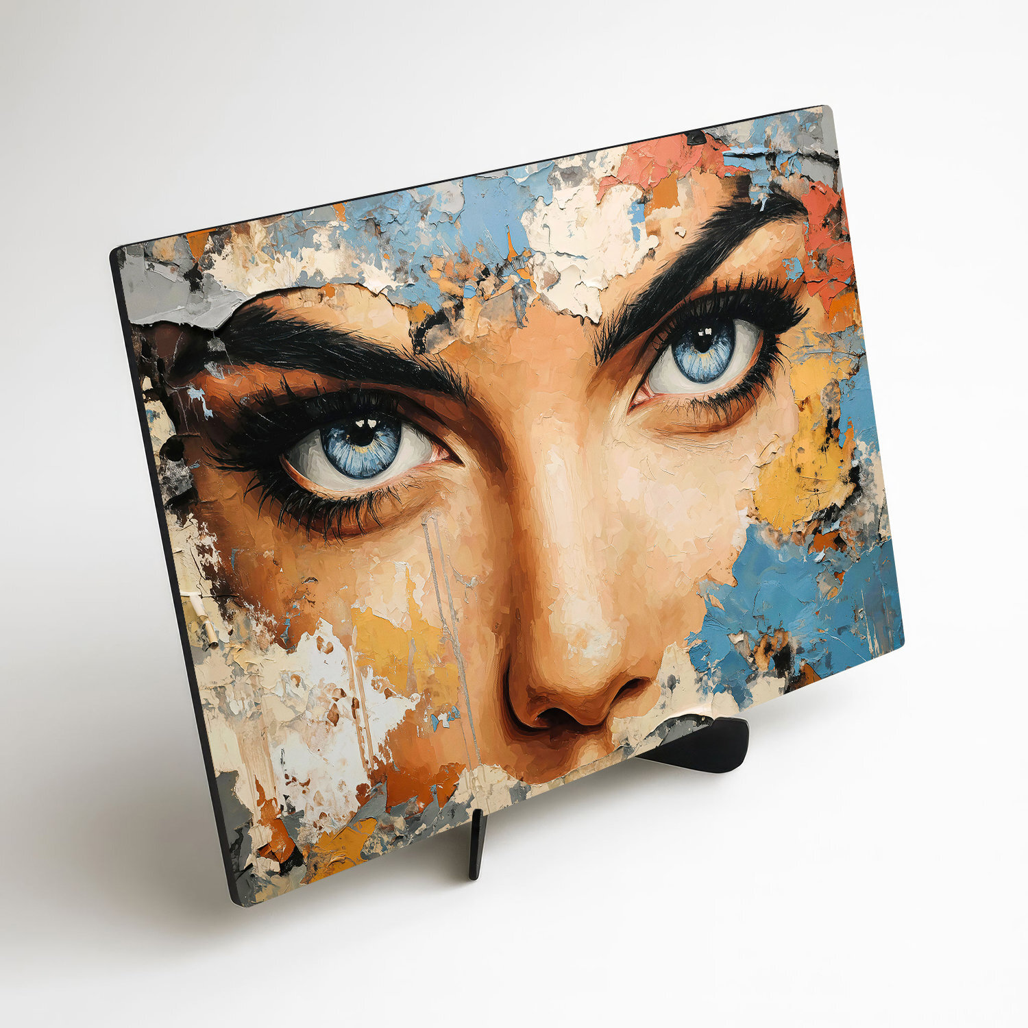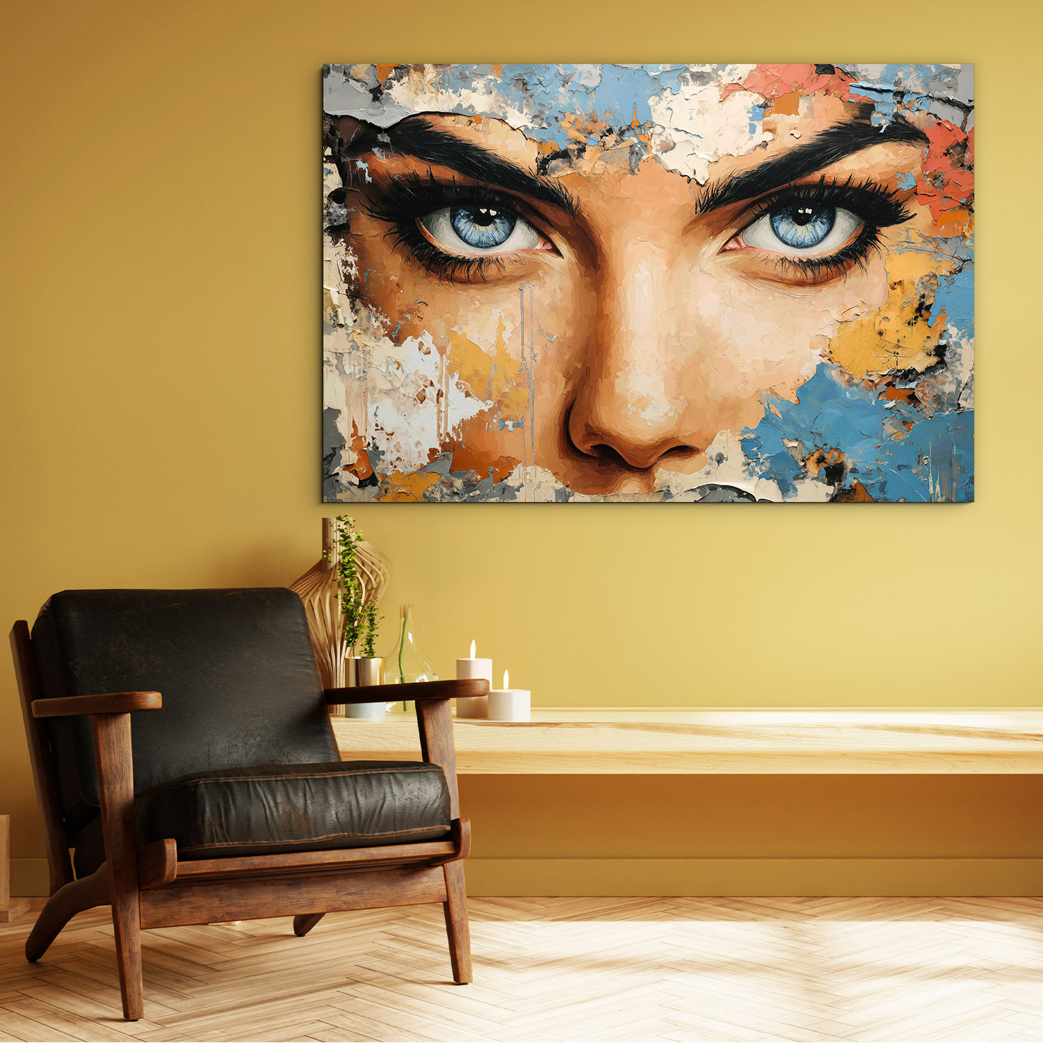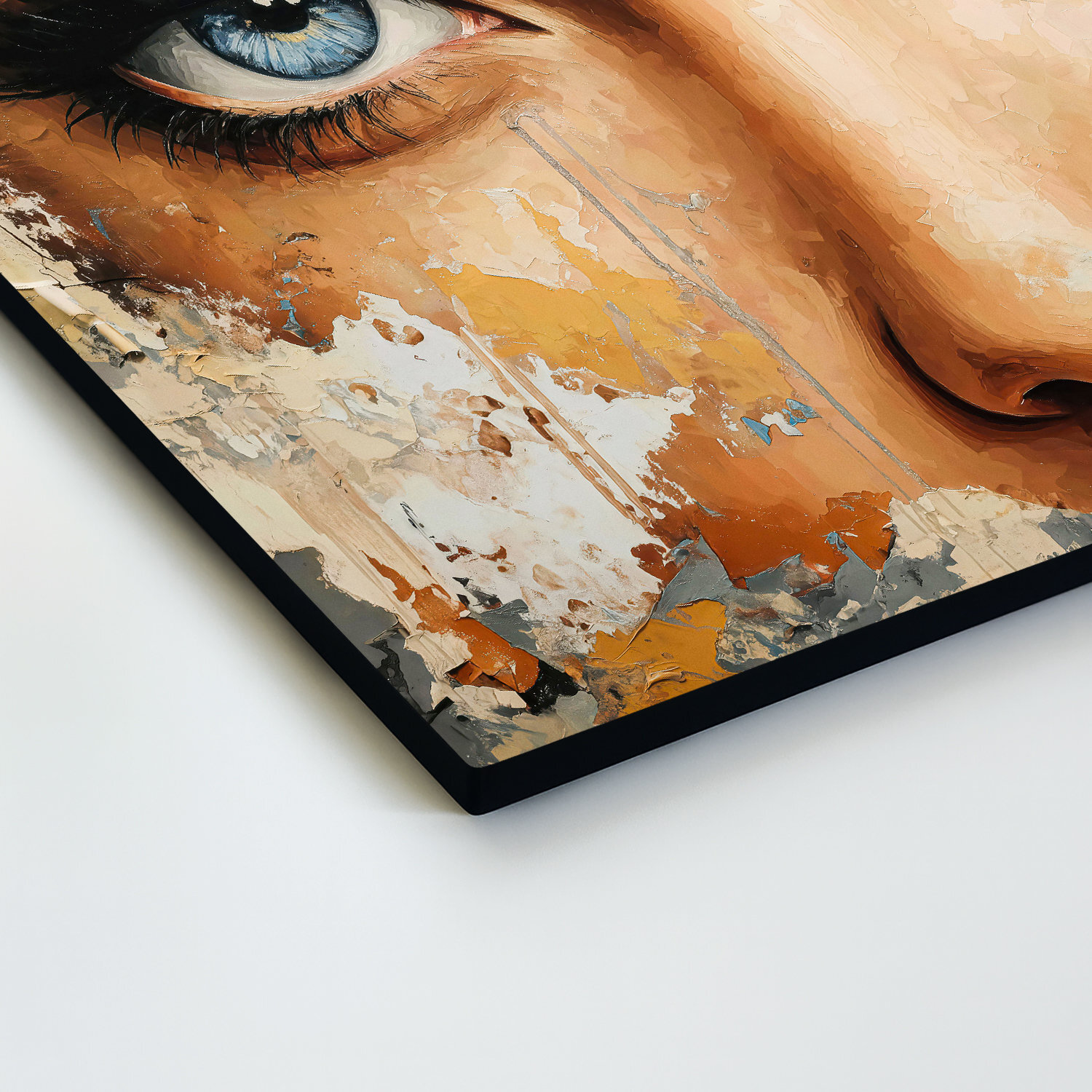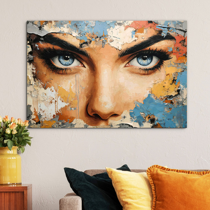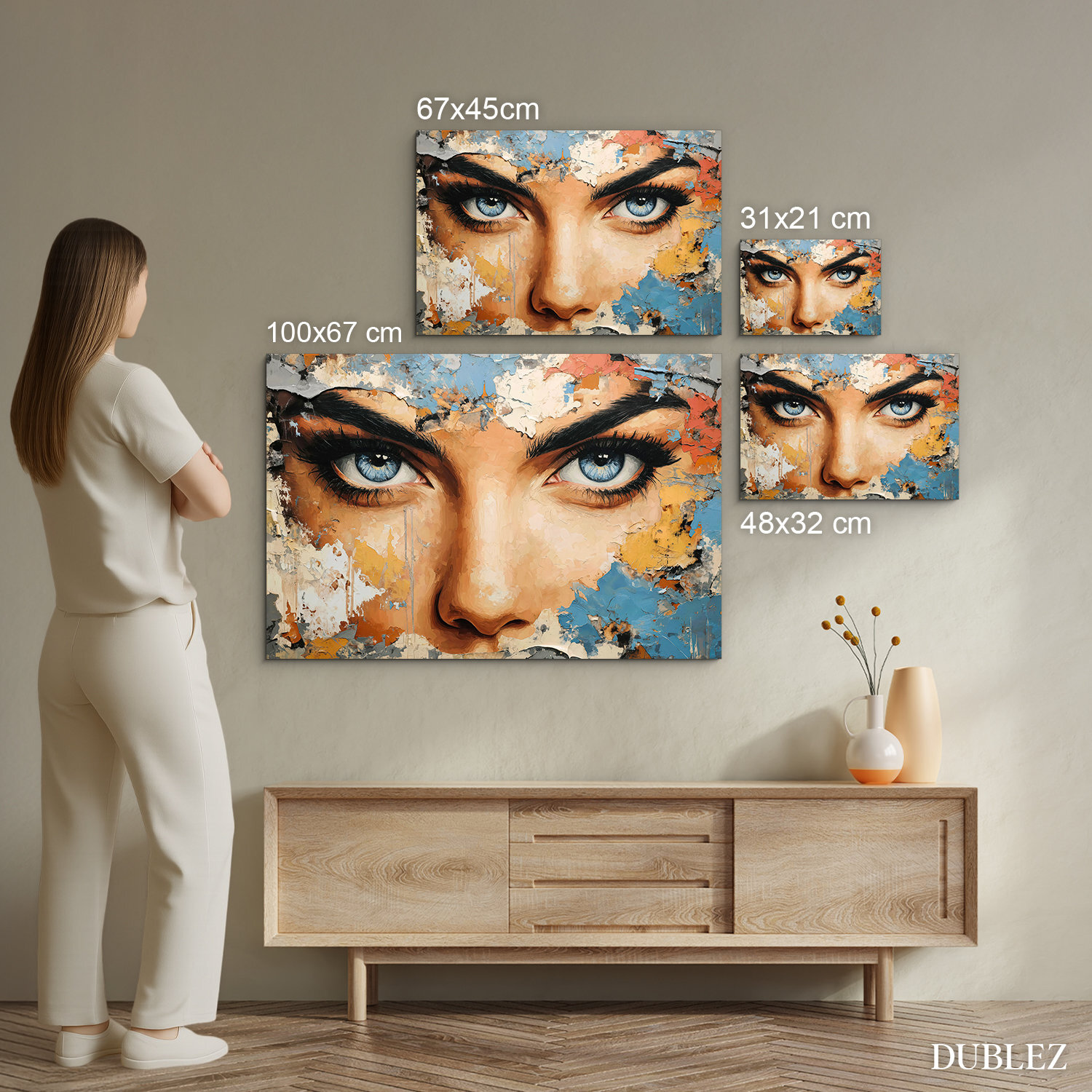 Nástenný obraz zachytáva intenzívny pohľad modrých očí vystupujúci z abstraktnej textúry. Portrét je zasadený do kompozície s prvkami street artu, kde sa miešajú sýte odtiene modrej, okrovej a tehlovej farby s efektom odlupujúcej sa omietky. Svojím surovým a zároveň hlbokým charakterom okamžite mení atmosféru priestoru, pričom sa výborne hodí do industriálnych interiérov, loftov alebo moderných obývacích izieb.