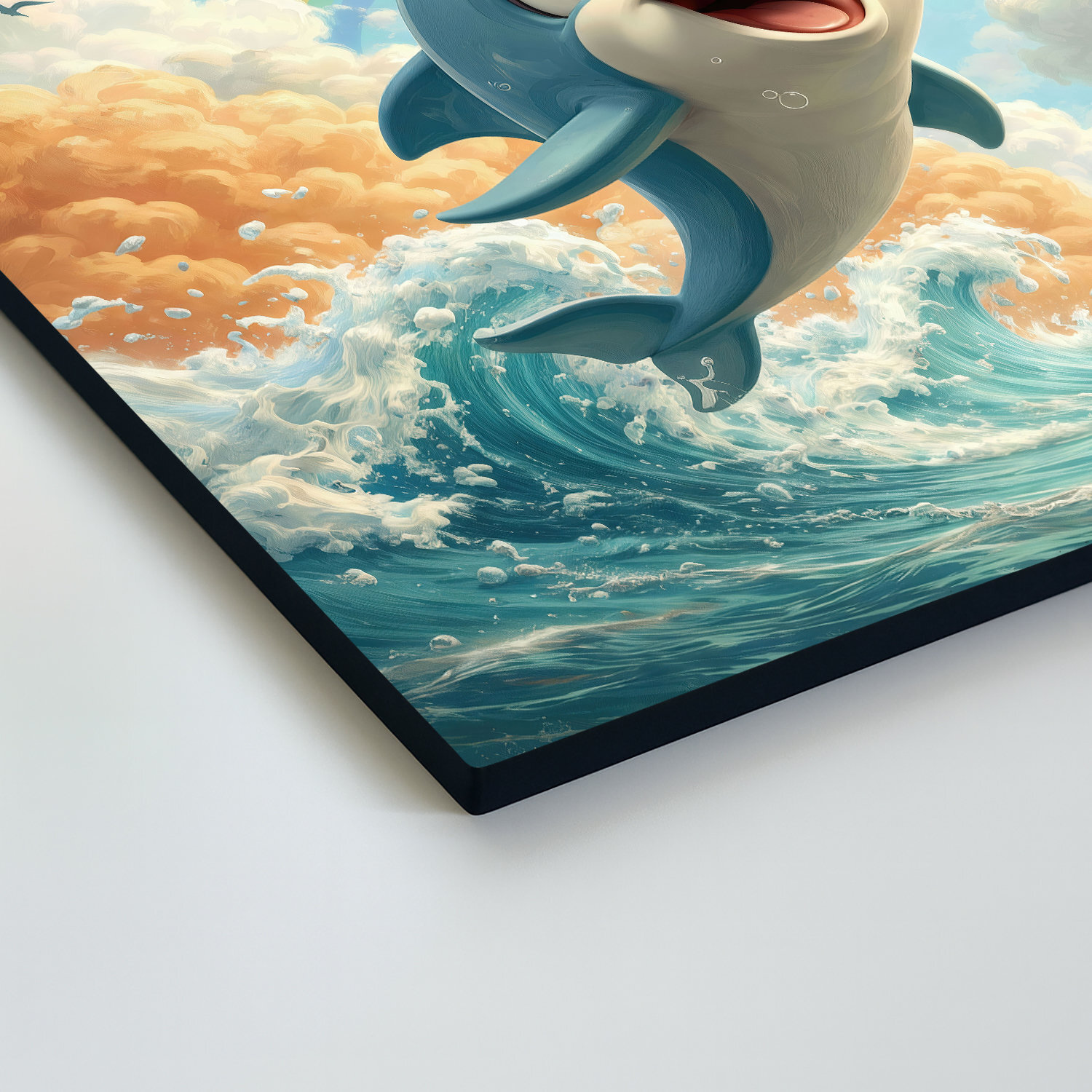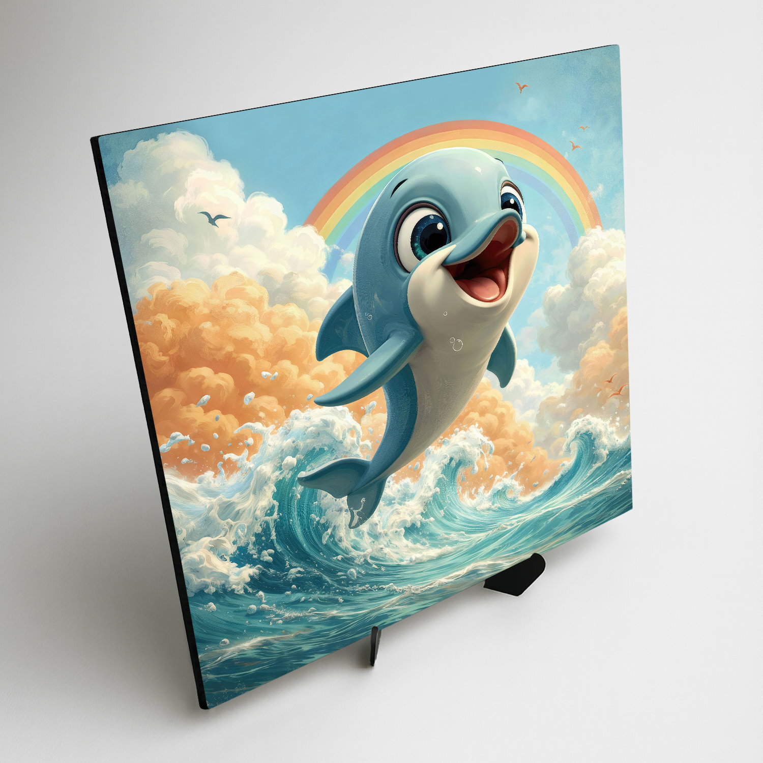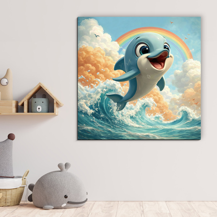 Obraz do detskej izby s veselým delfínom prinesie do priestoru radosť, energiu a hravú morskú atmosféru. Usmiaty delfín skáčuci cez vlny pod farebnou dúhou pôsobí optimisticky a podporuje detskú fantáziu aj pozitívnu náladu. Drevený obraz pre deti je ideálny do chlapčenskej aj dievčenskej izby, kde podporí tvorivú atmosféru pri hre aj oddychu.