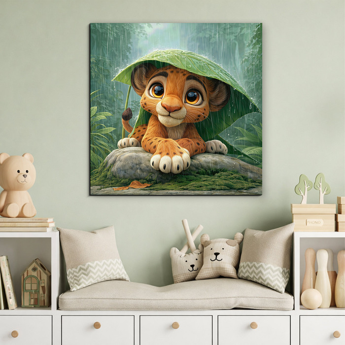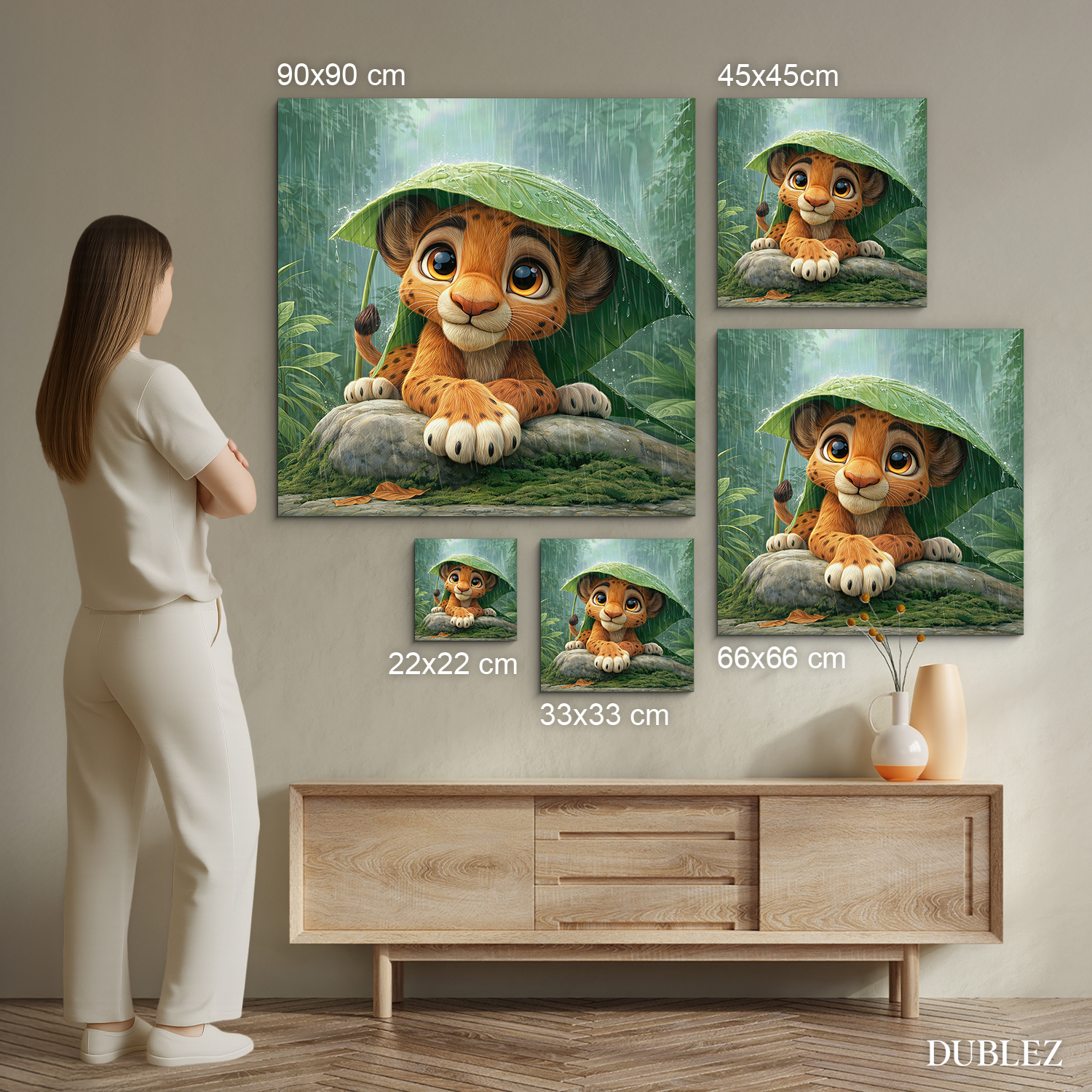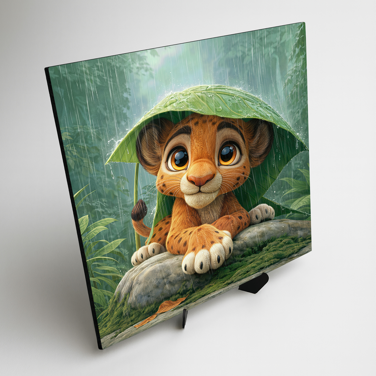 Detský obraz zachytáva malé levíča, ktoré sa počas tropického dažďa ukrýva pod veľkým zeleným listom. Drevený obraz levíka dokonale ladí s moderným detským nábytkom. Ak hľadáte štýlový a trvácny doplnok na stenu, tento malý kráľ zvierat je výnimočnou voľbou, ktorá podnieti detskú fantáziu a premení každú izbu na čarovné miesto.