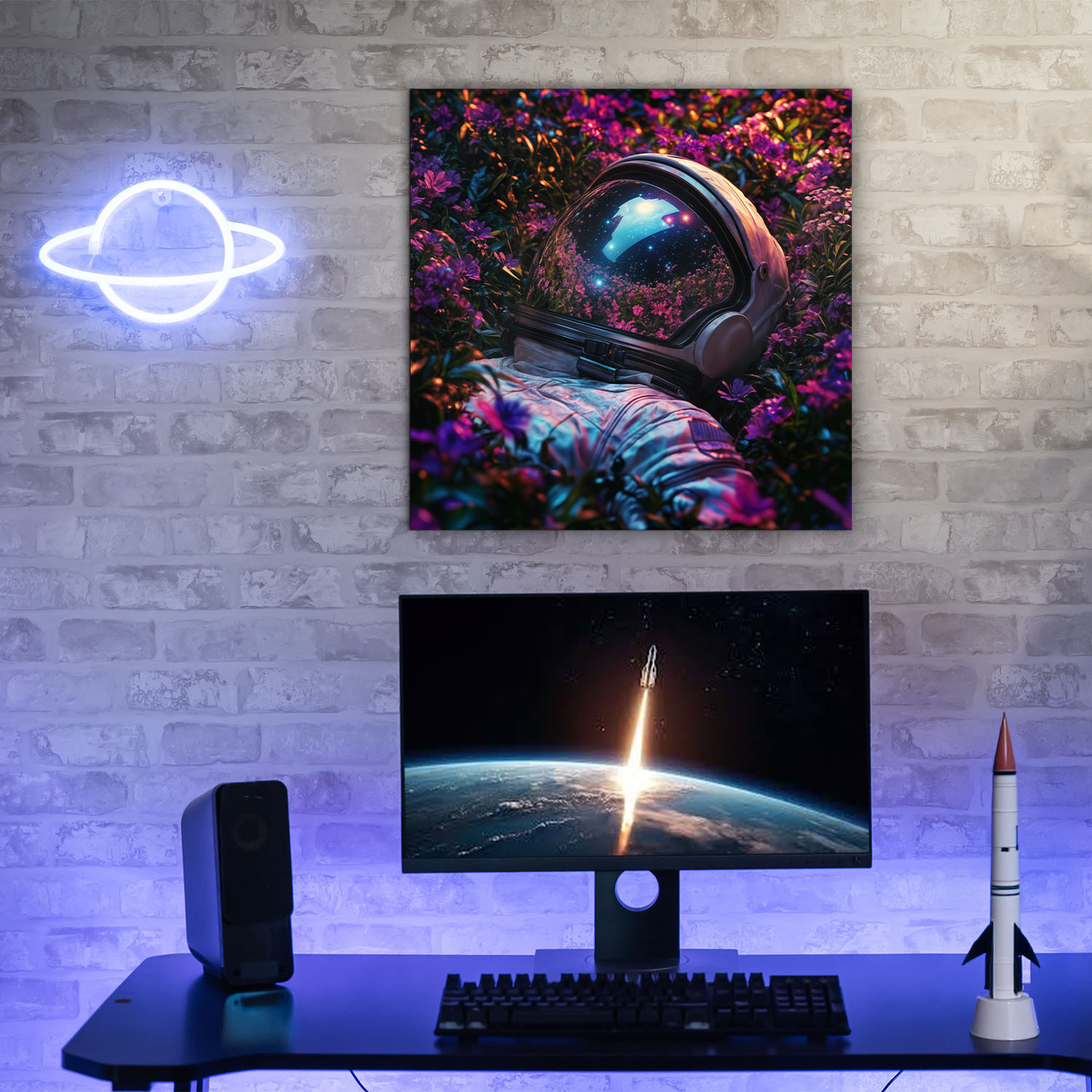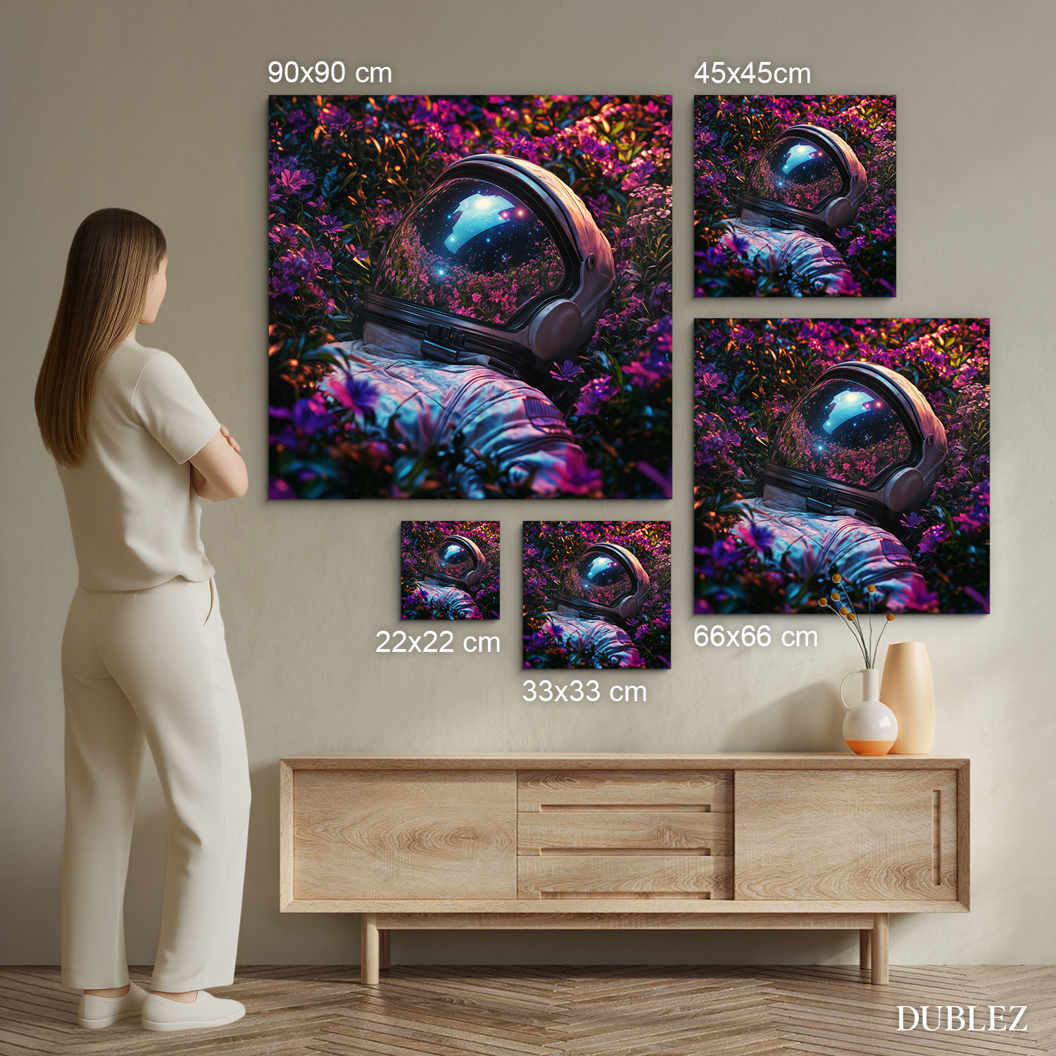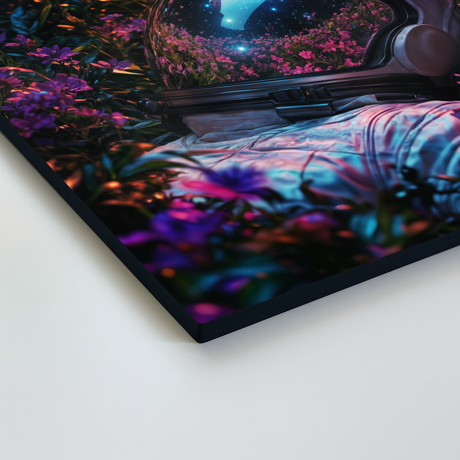 Drevený obraz astronauta v rozkvitnutej záhrade spája krásu prírody s tajomstvom vesmíru. Ideálny doplnok do moderných interiérov, obývačky, kancelárie či chodby. Vďaka žiarivým farbám okamžite pritiahne pozornosť. Obraz je tiež vhodným darčekom pre milovníkov vesmíru, snívania a umeleckých dekorácií.