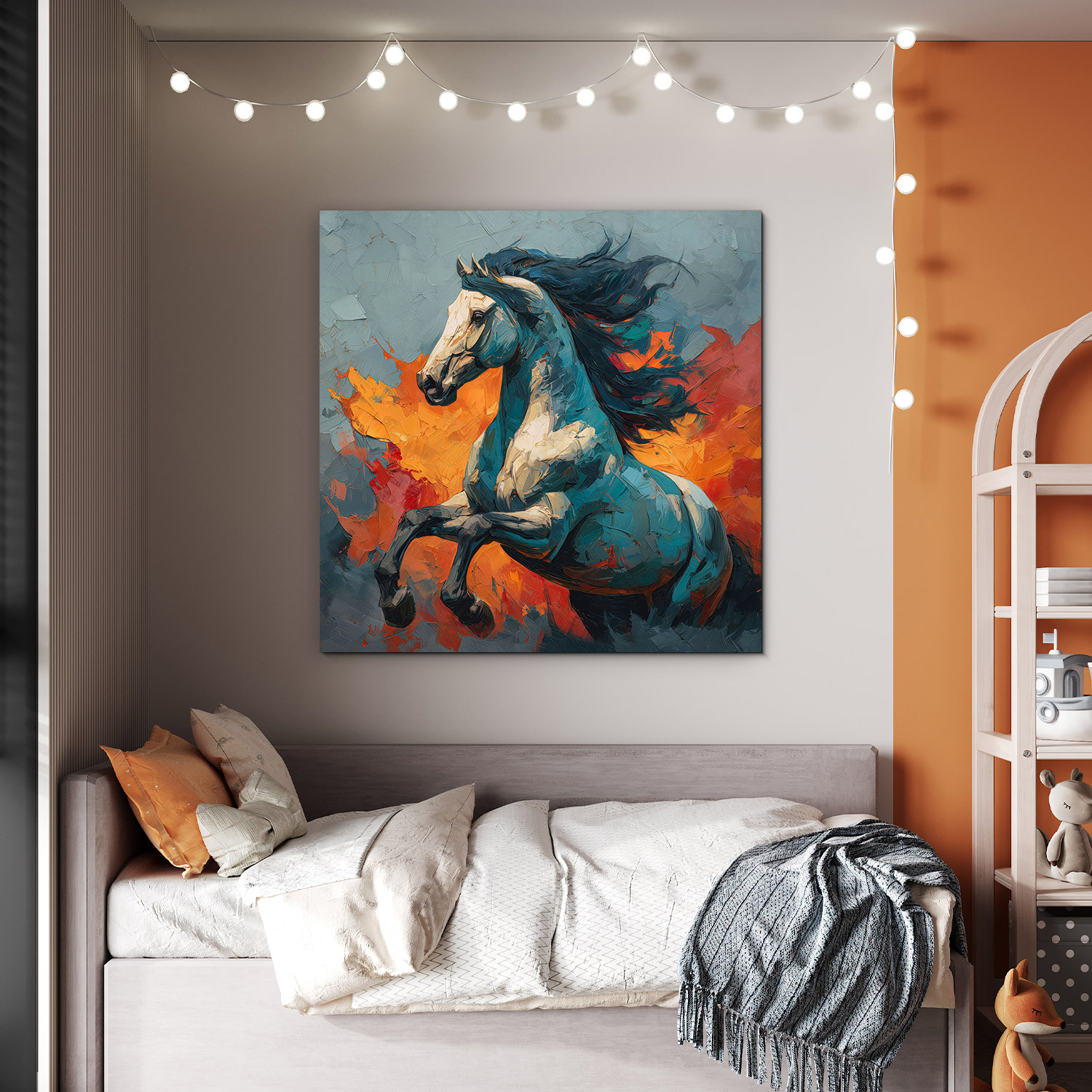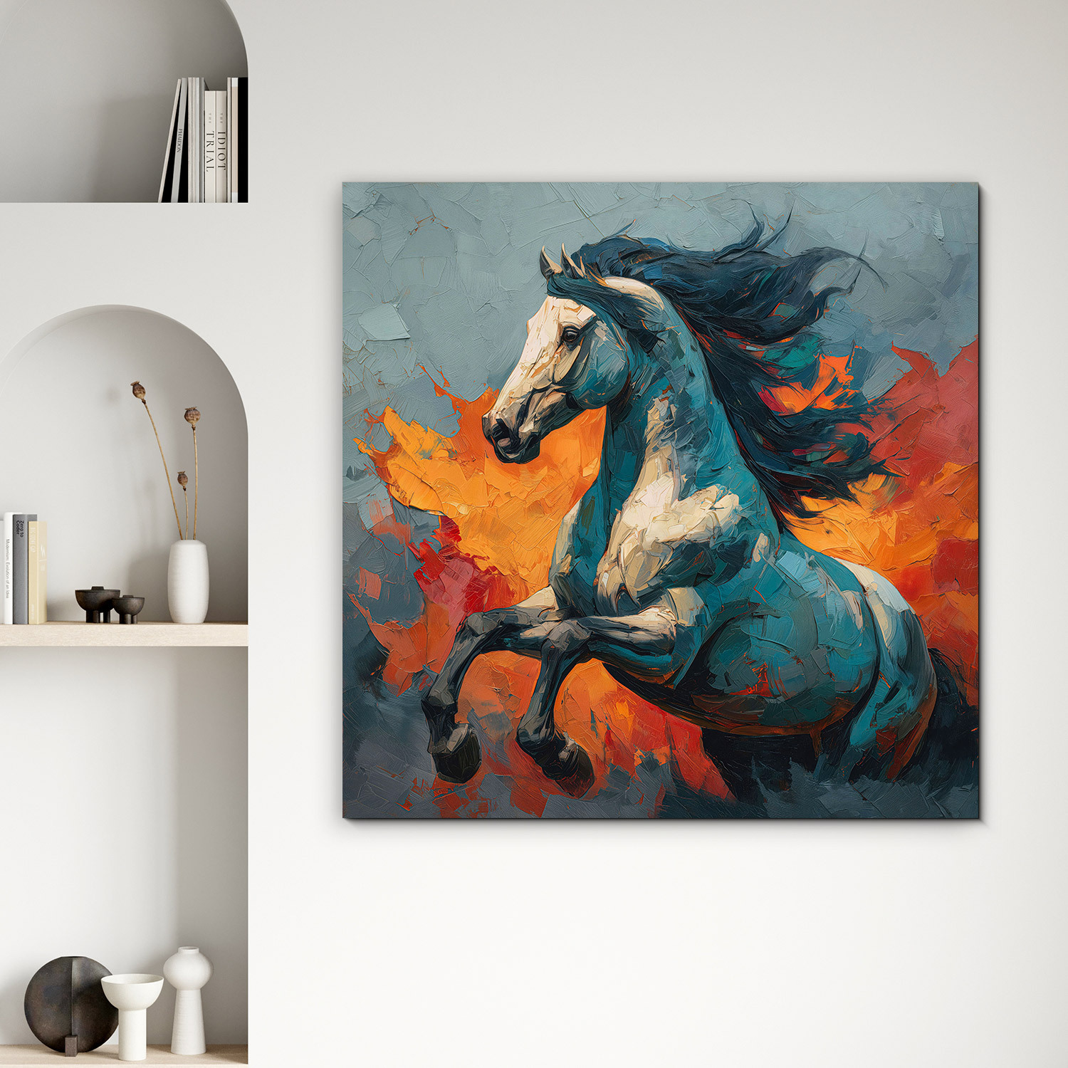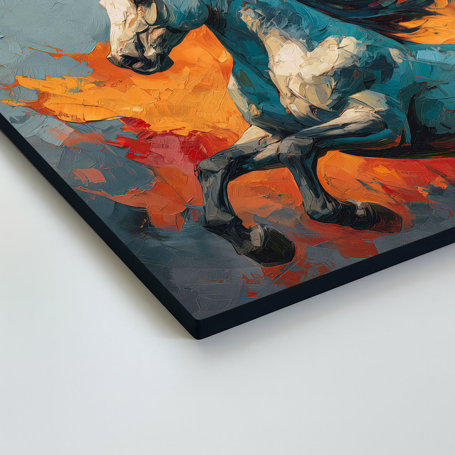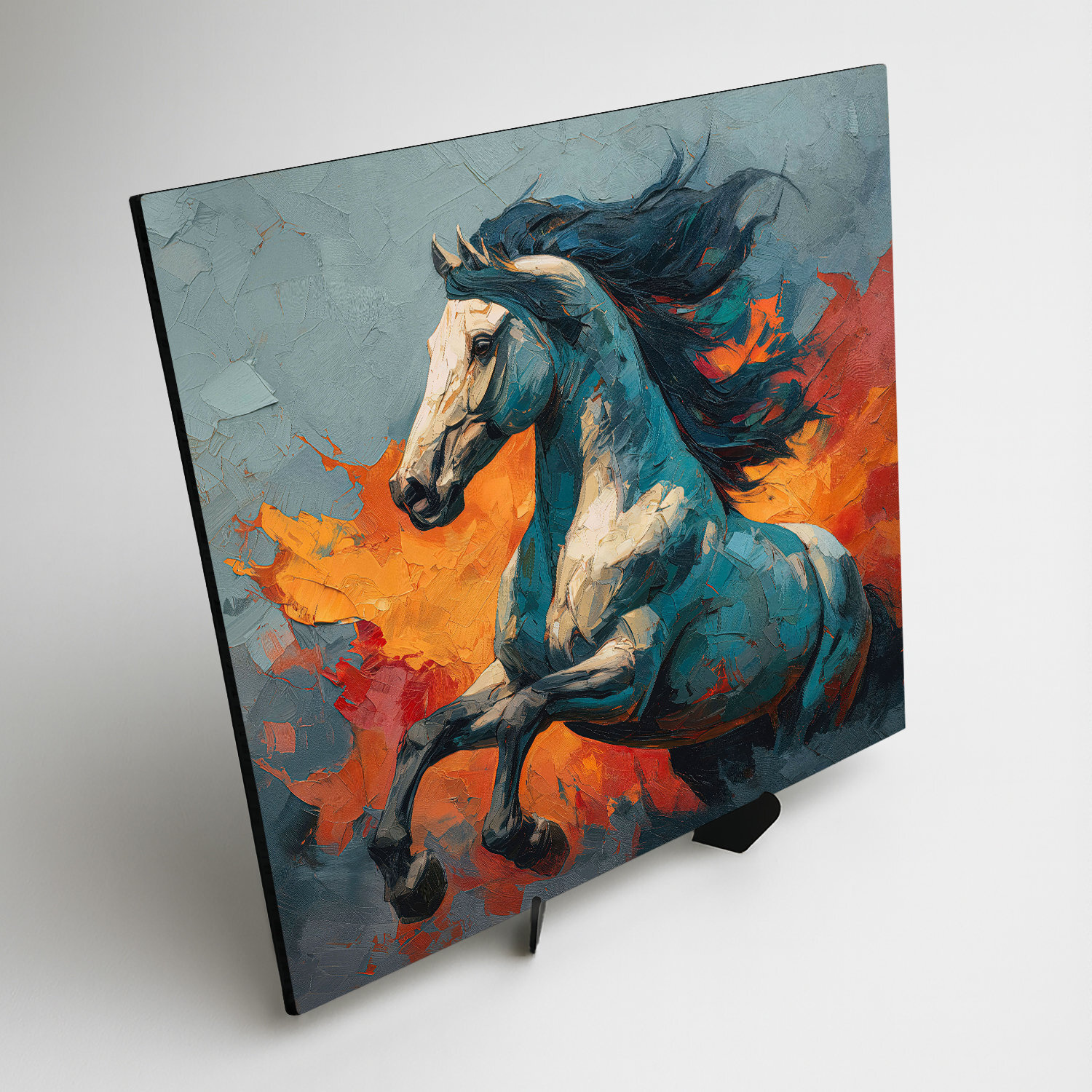 Drevený obraz koňa v modrých a oranžových farbách vnesie do interiéru energiu, slobodu a nespútanú silu. Umelecké spracovanie pripomína maľbu špachtľou, čo dodáva obrazu hĺbku a moderný dizajn. Obraz je výrazný doplnok do obývačky či kancelárie, kde vynikne svojou farebnosťou.