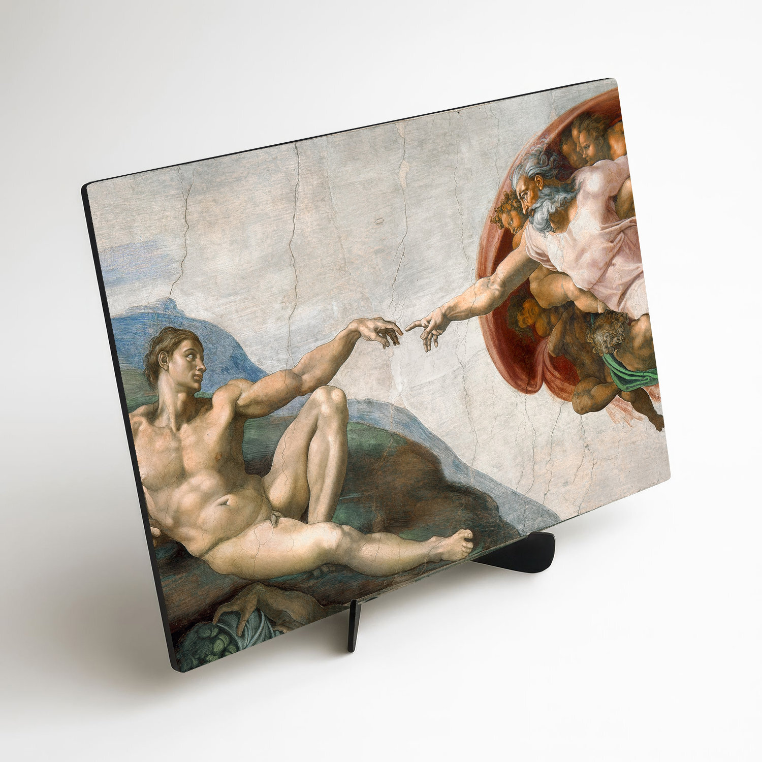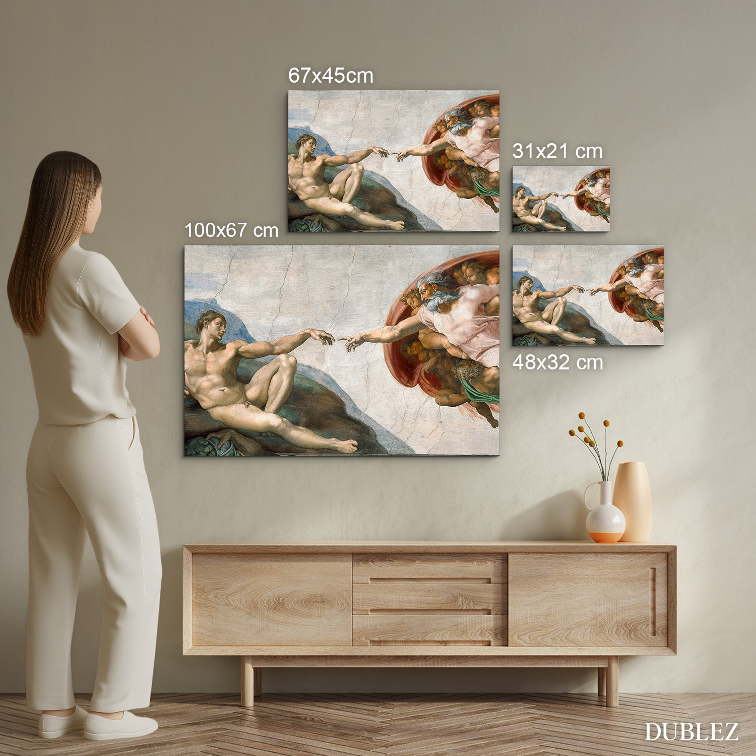 Drevený obraz od Michelangela - Stvorenie Adama je reprodukciou slávnej fresky zo Sixtínskej kaplnky, kde Boh podáva život prvému človeku Adamovi. Motív vytlačený prémiovými farbami zachytáva presnú anatómiu postáv a renesančný realizmus. Jemná textúra fresky a zemité farby pôsobia nadčasovo a vyniknú v akomkoľvek interiéri.