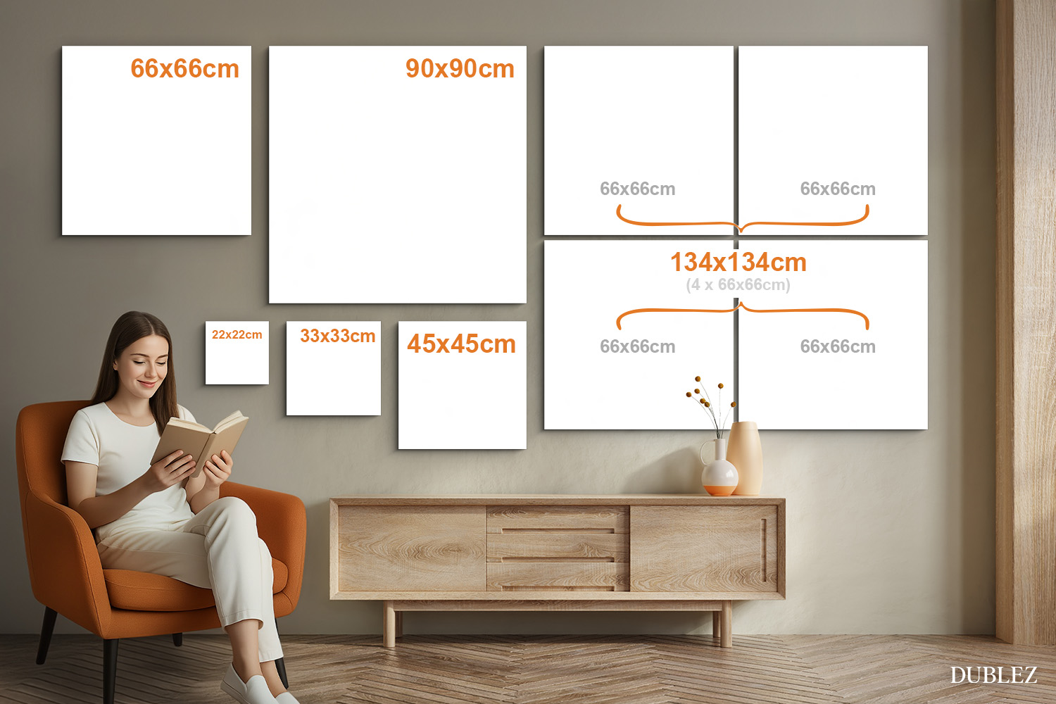 - 134x134 cm - Obraz je rozdelený na 4 časti (rozmer jednej časti je 66x66 cm - viď galéria produktu). Rozmer 134x134 cm je rozmer po zavesení na stenu s 2 cm medzerou medzi jednotlivými dielmi. Medzery medzi jednotlivými dielmi je možné ľubovoľne nastaviť a tým dosiahnuť aj väčšiu veľkosť.