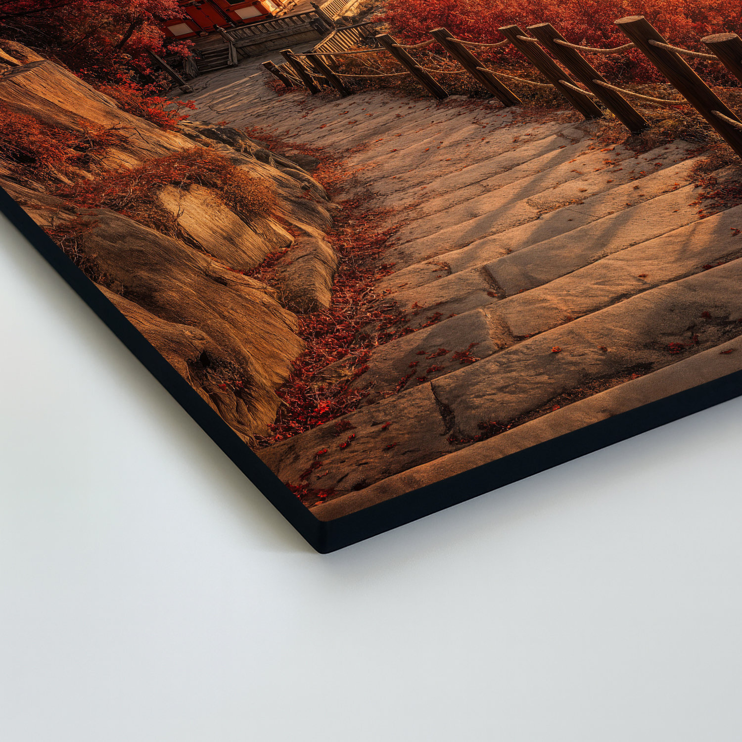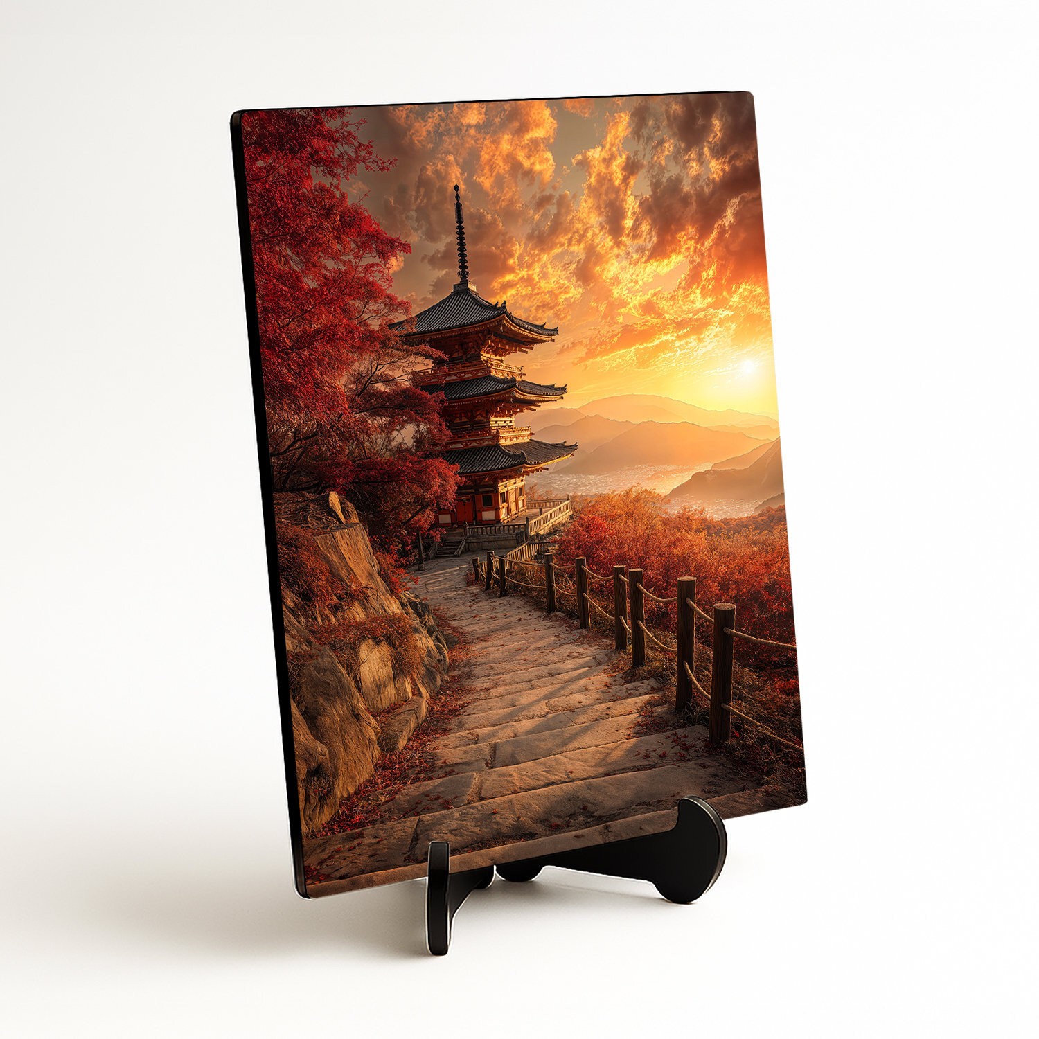 Farebný obraz japonskej pagody v jesennej krajine pri západe slnka. Orientálny motív s nádhernými farbami – červené javory, teplé svetlo a kamenný chodník. Drevený obraz vhodný do obývačky, spálne aj kancelárie. Ideálny pre milovníkov Ázie, prírody a meditácie. Štýlový doplnok k modernému aj boho interiéru. Tip na darček pre cestovateľov alebo milovníkov Japonska.