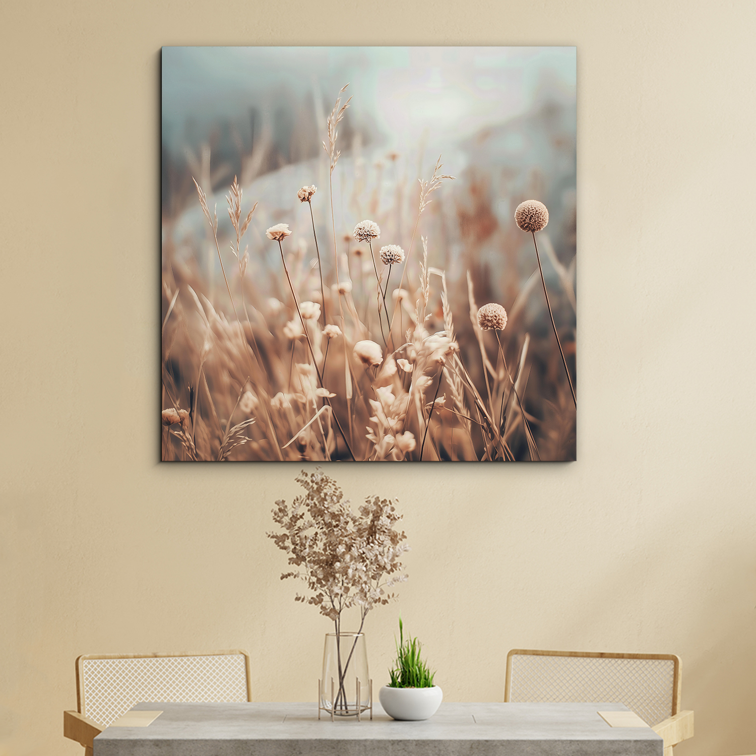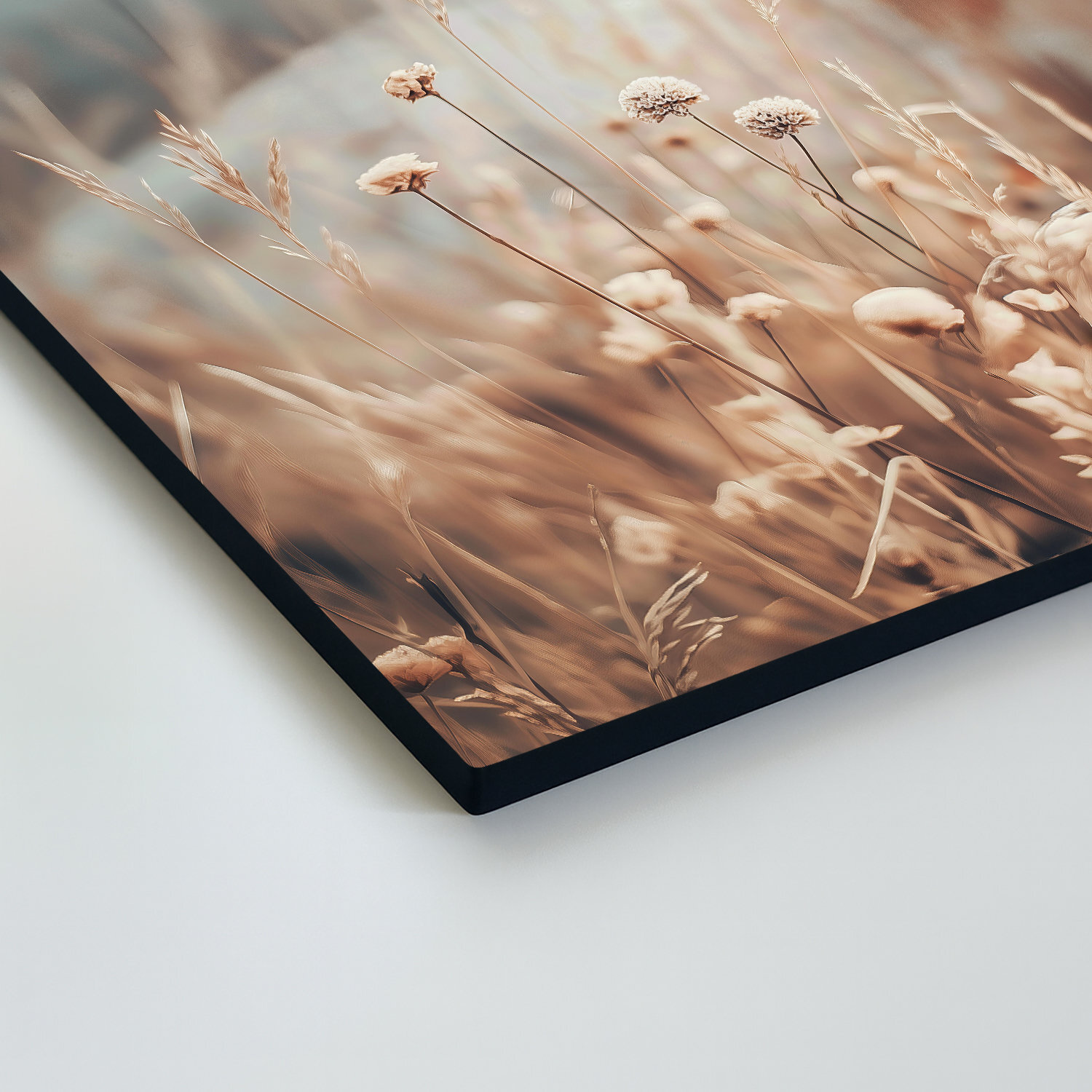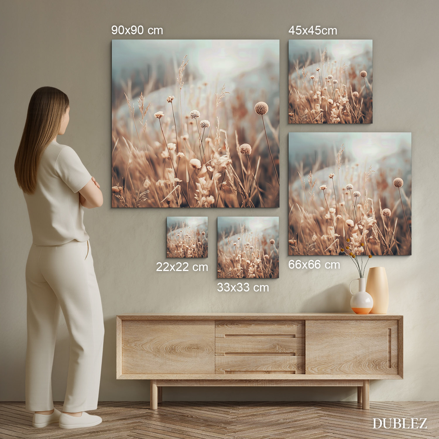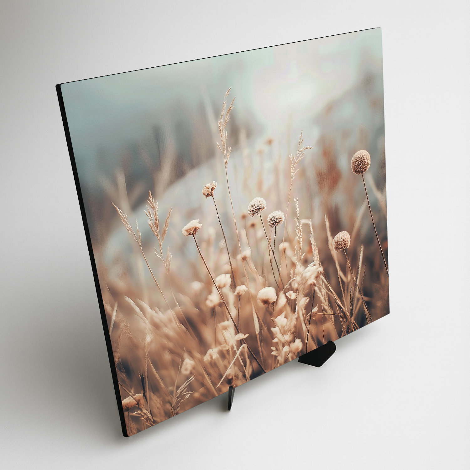 Drevený obraz s jemnými poľnými kvetmi prináša do interiéru dotyk prírody. Jemné béžové a pieskové farby pôsobia harmonicky a ladia s interiérom v rôznych štýloch. Obraz zachytáva drobné suché kvety a steblá trávy, ktoré sa mierne nakláňajú vo vetre. Skvele sa hodí do spálne, kancelárie, chodby alebo na chatu.