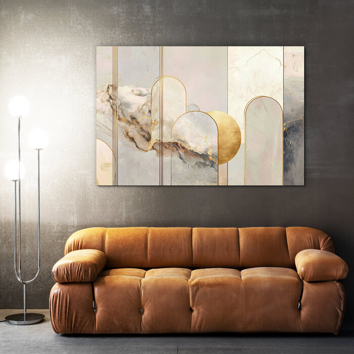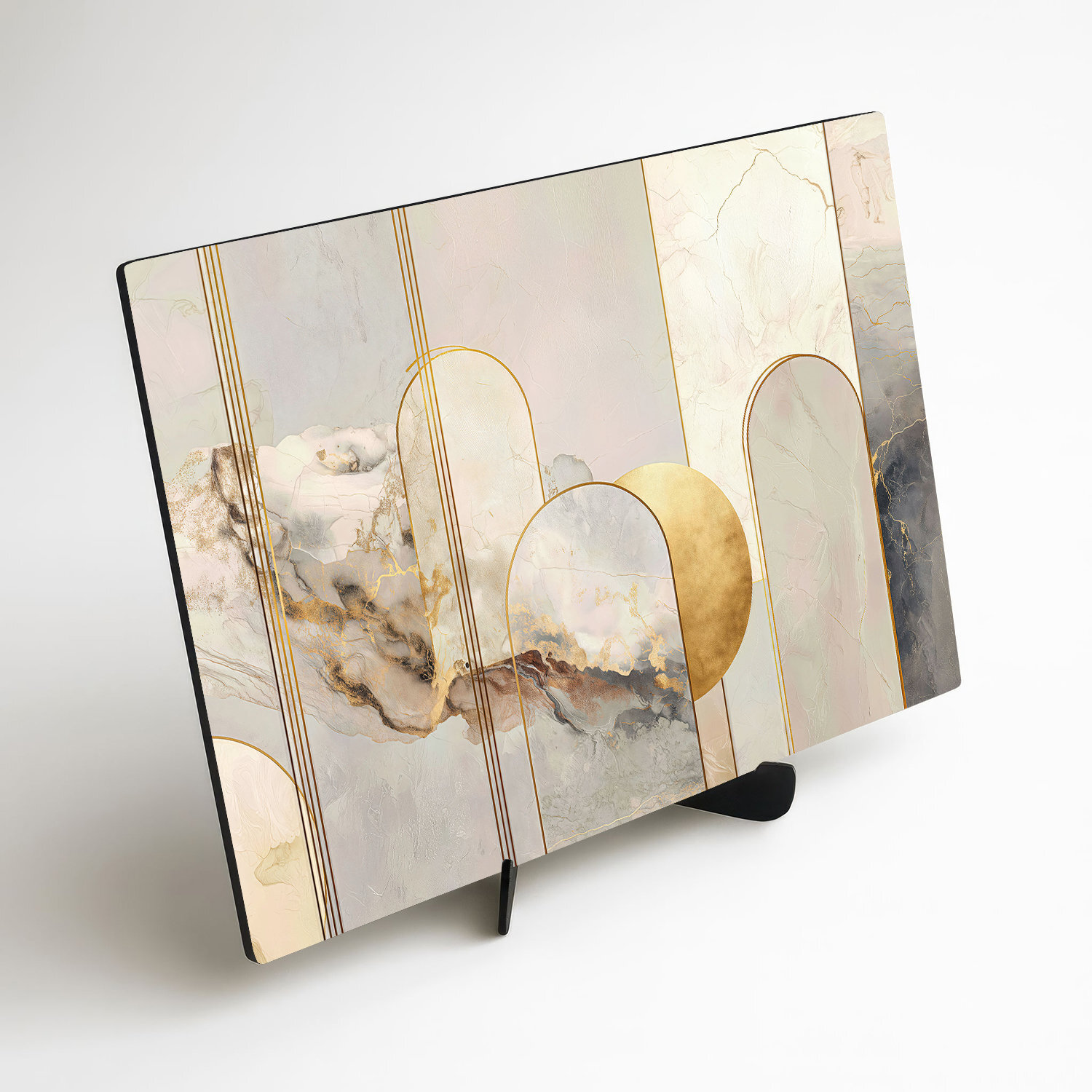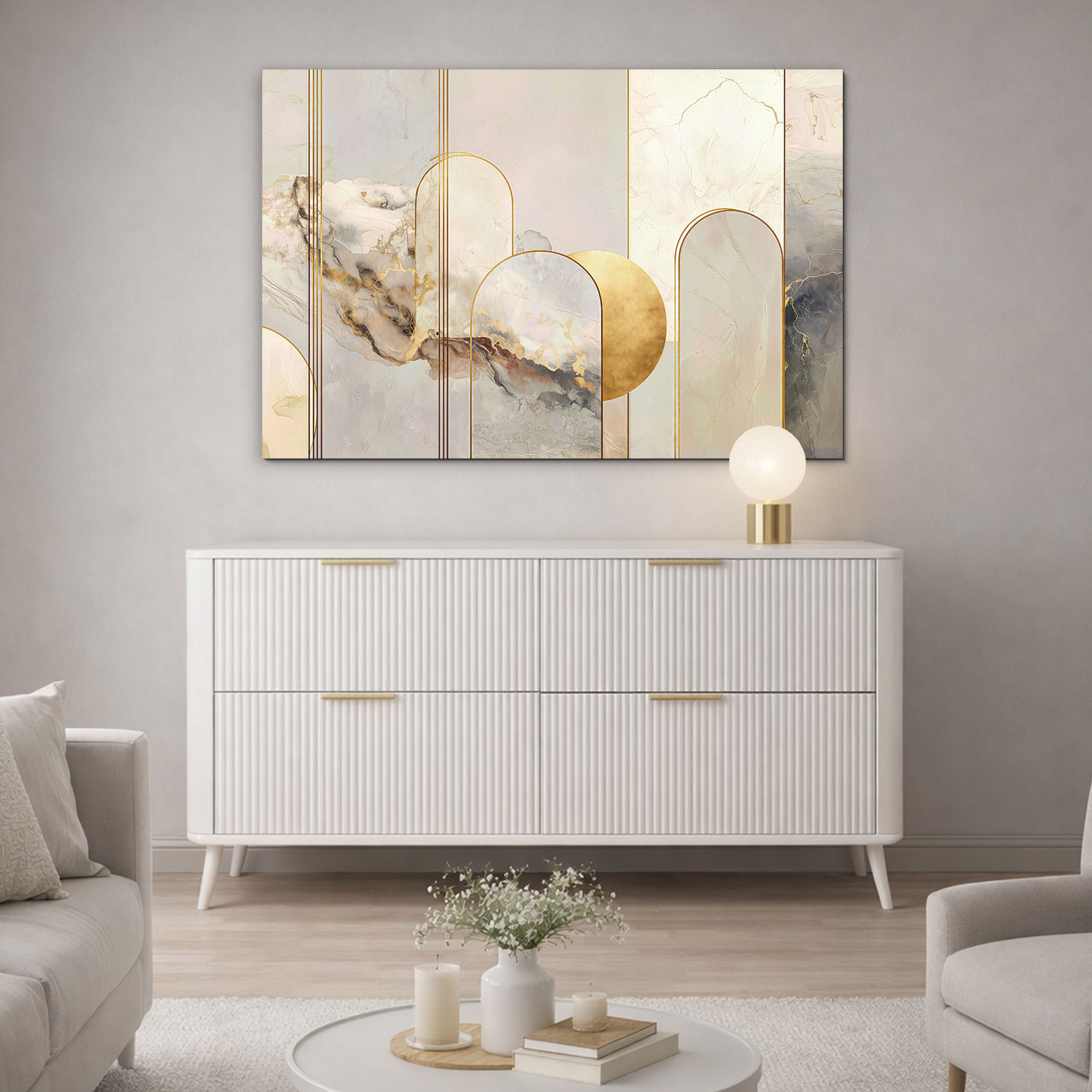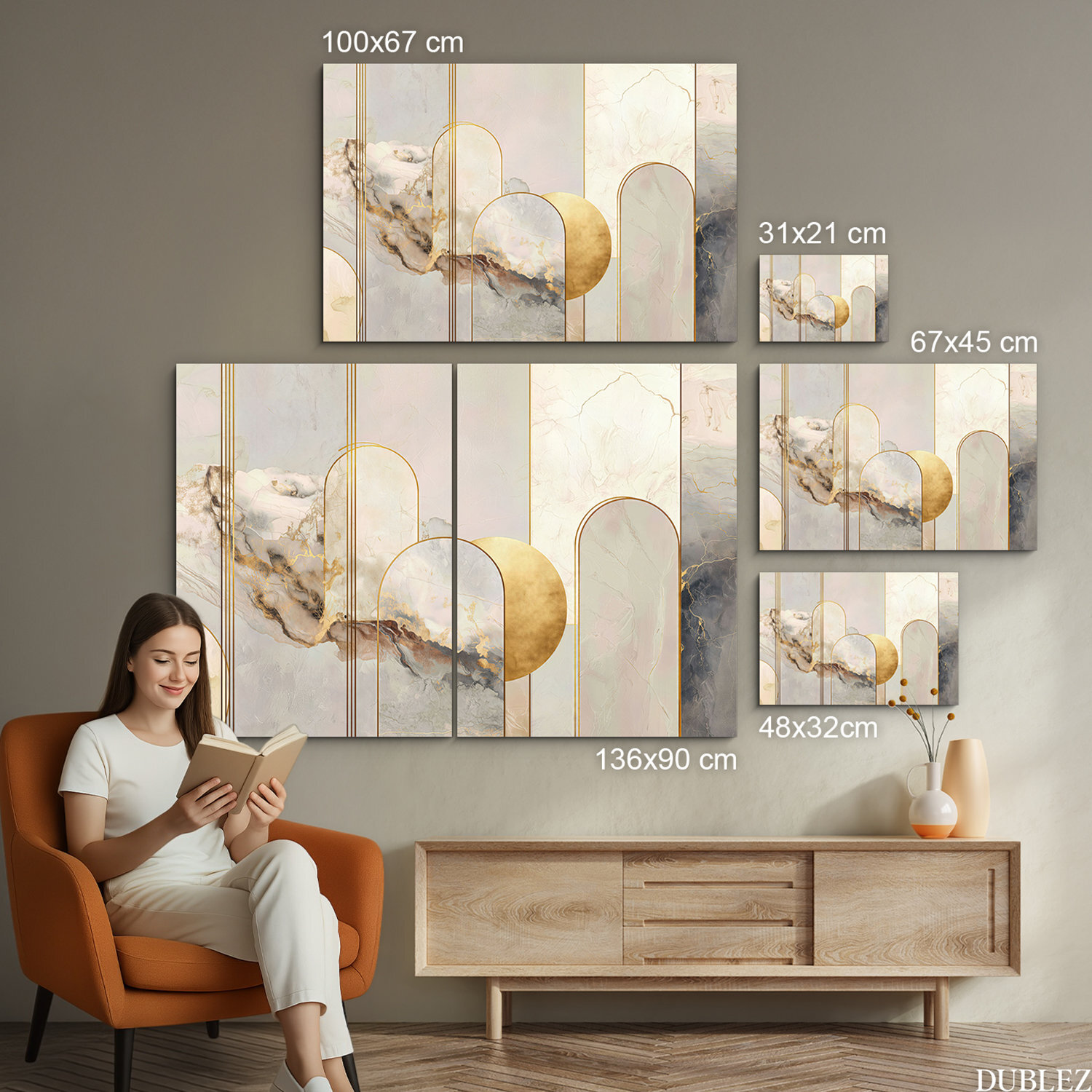 Drevený obraz Zlaté brány abstrakcie je sofistikovaná nástenná dekorácia, ktorá spája jemné mramorové textúry s precíznou geometriou zlatých línií. Moderný obraz je oslavou luxusu, harmónie a elegancie. Oblúky a kruhové prvky v kombinácii s pastelovými tónmi sa hodia každému, kto miluje moderný glamour štýl a chce svoj interiér premeniť na miesto s nádychom exkluzivity. Skvele vynikne nad elegantnou sedačkou, v hotelovom lobby alebo v štýlovej jedálni.