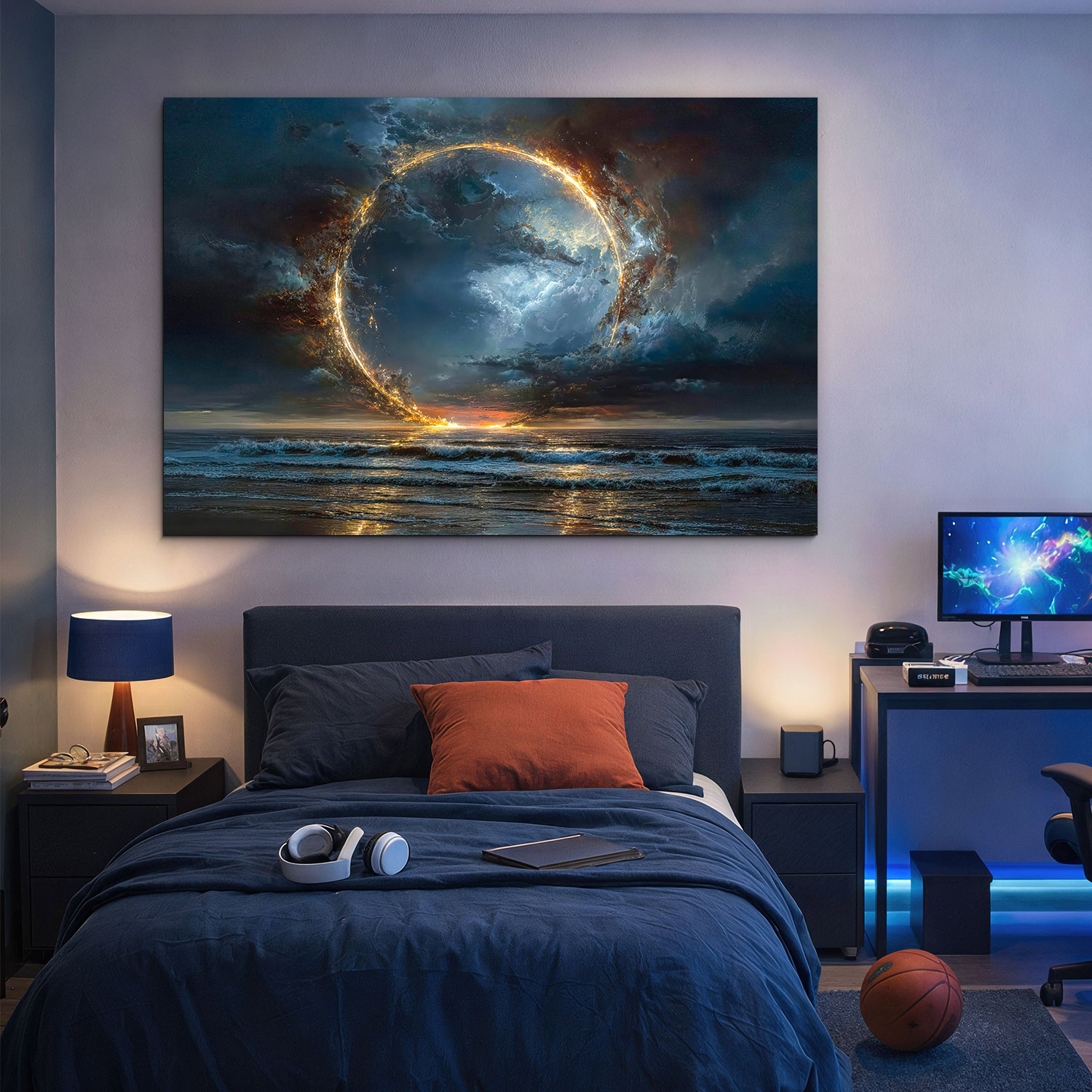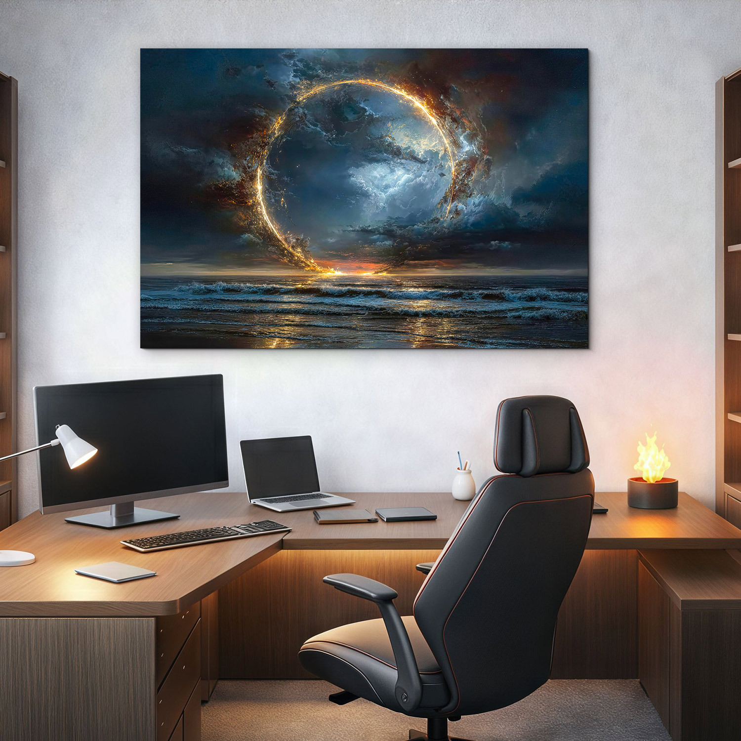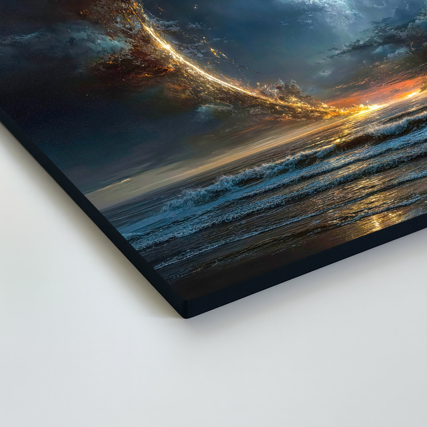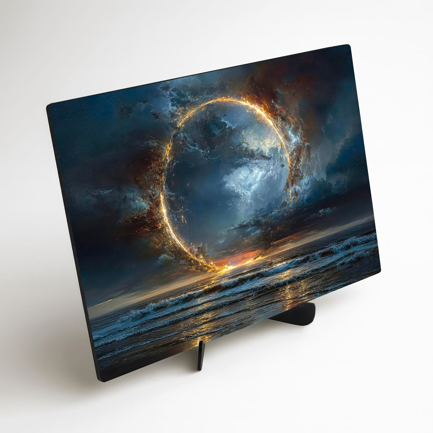 Drevený obraz zachytáva dychberúci stret elementov – ohňa, vody a vzduchu. Ústredným motívom je žiariaci portál energie vznášajúci sa nad nepokojnou hladinou oceánu, obklopený mystickými búrkovými mrakmi. Výjav pôsobí ako brána do iného sveta, symbol nekonečna či čistú kozmickú energiu. Vďaka sýtym farbám je obraz ideálna voľba pre moderné, industriálne aj luxusne ladené interiéri.