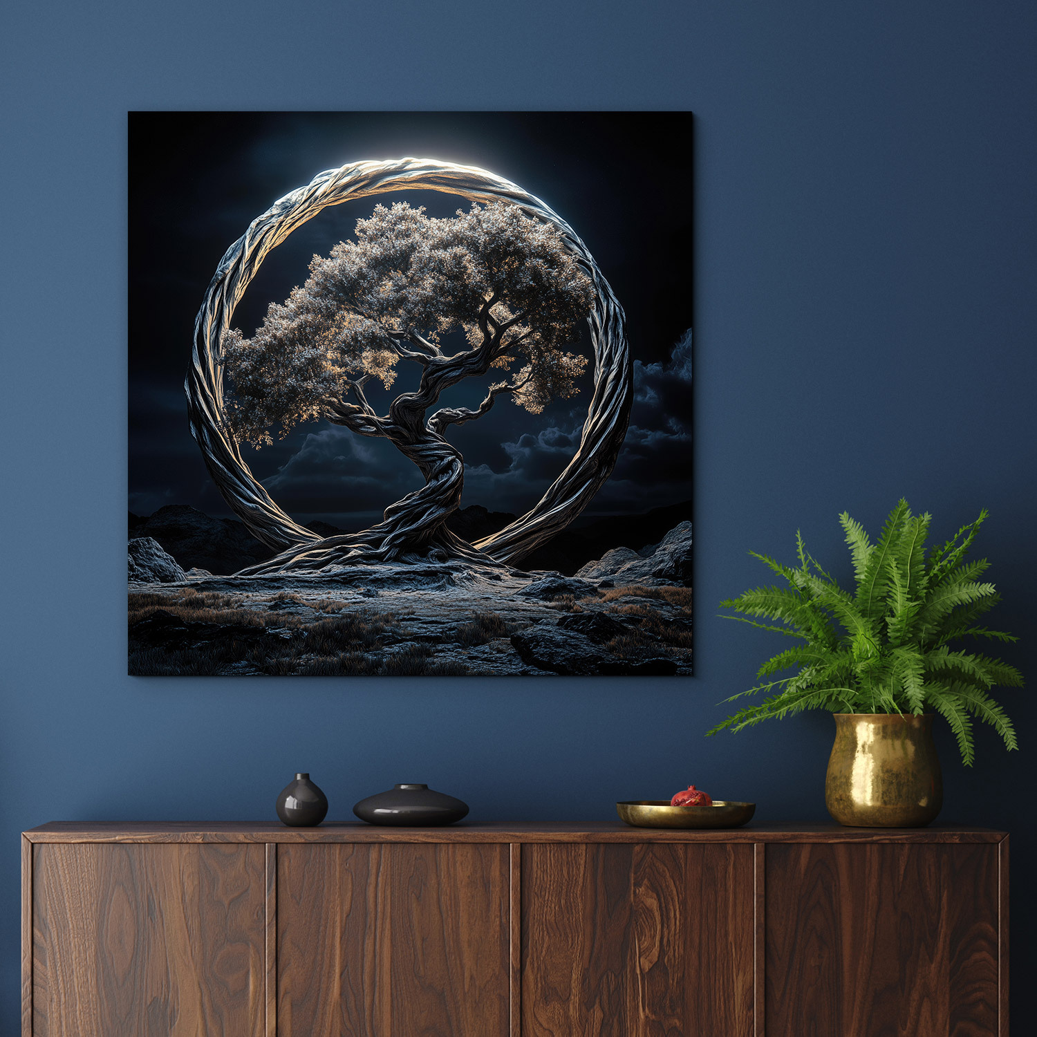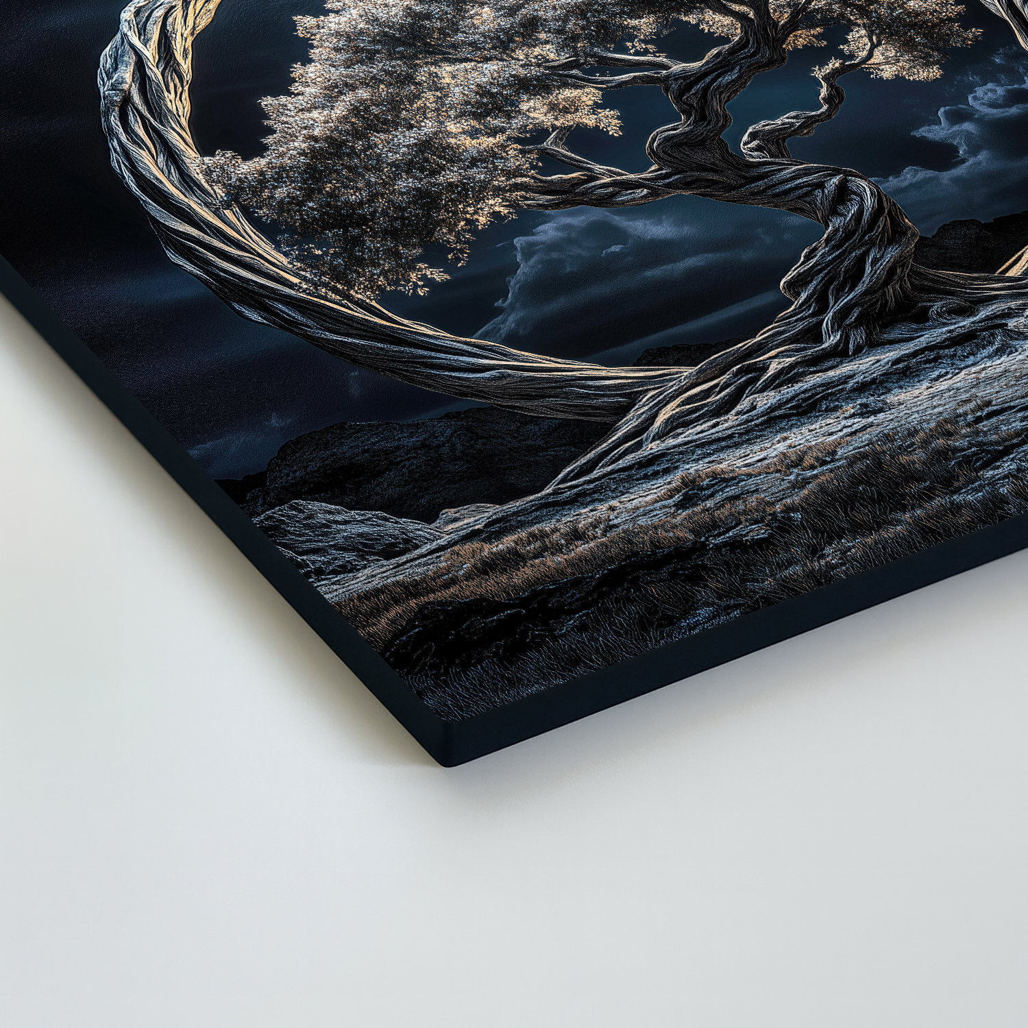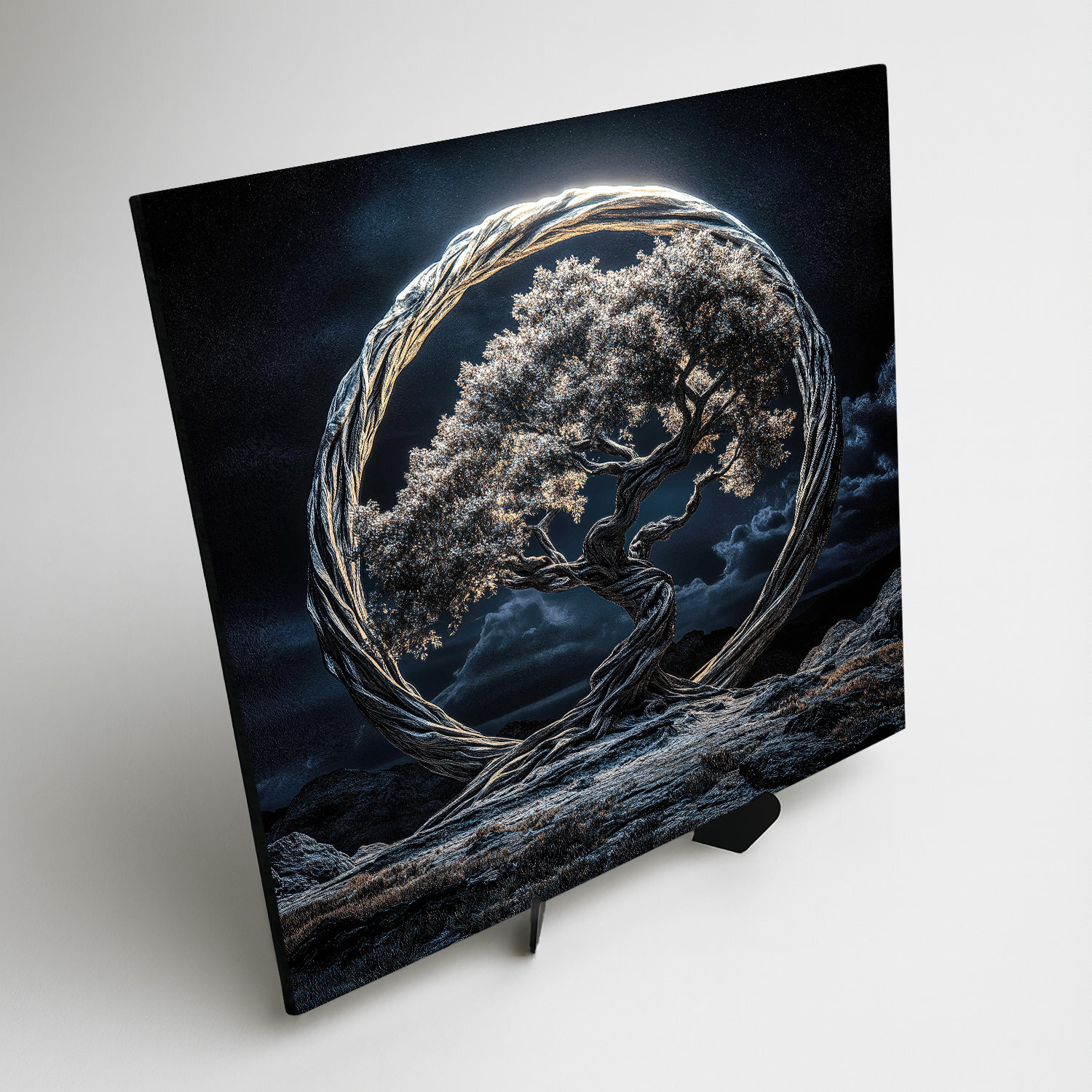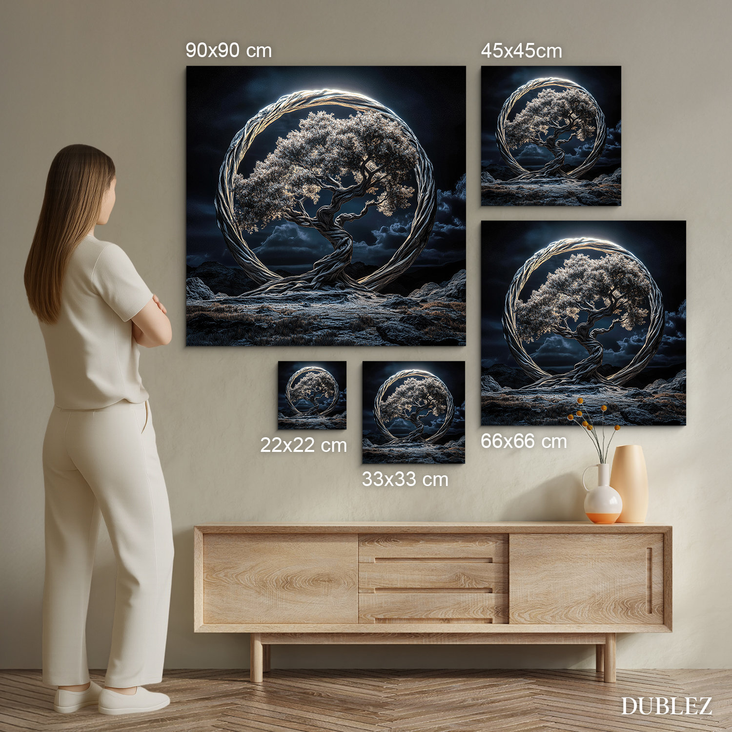Mystický obraz Strom života sa perfektne hodí do moderného interiéru, kde vynikne svojou temnou eleganciou a hlbokou symbolikou. Dominantný bonsaj s prepleteným kmeňom stojí uprostred kamennej krajiny, obklopený silným kruhom – symbolom ochrany. Detaily koruny stromu vnášajú do obrazu magickú žiaru, ktorá krásne vyniká na nočnom pozadí. Drevený obraz je ideálny do obývačky či kancelárie.