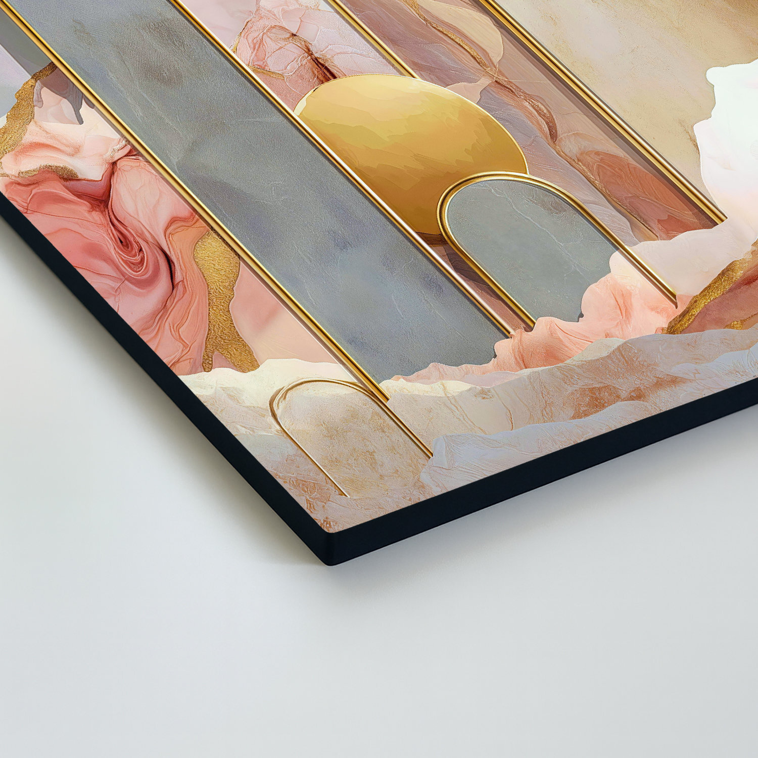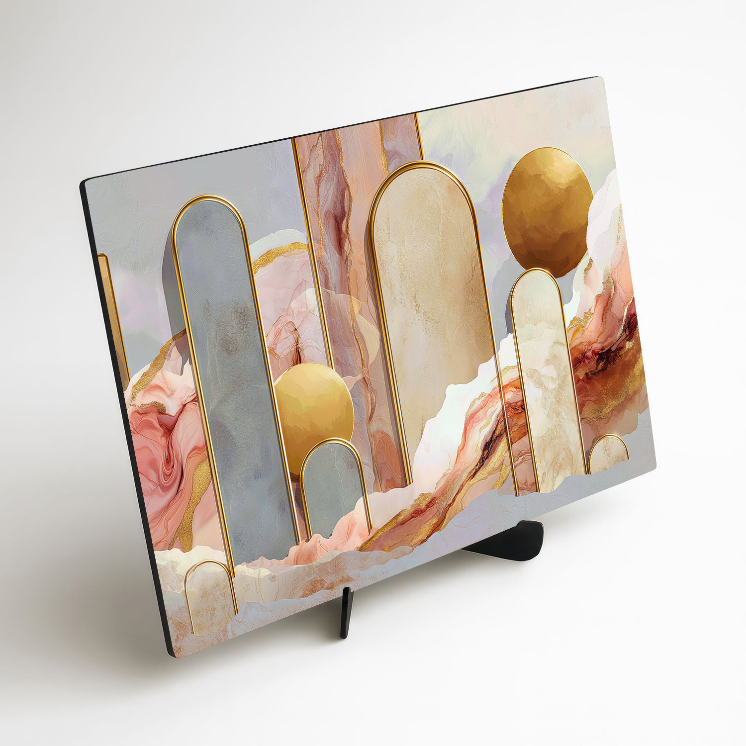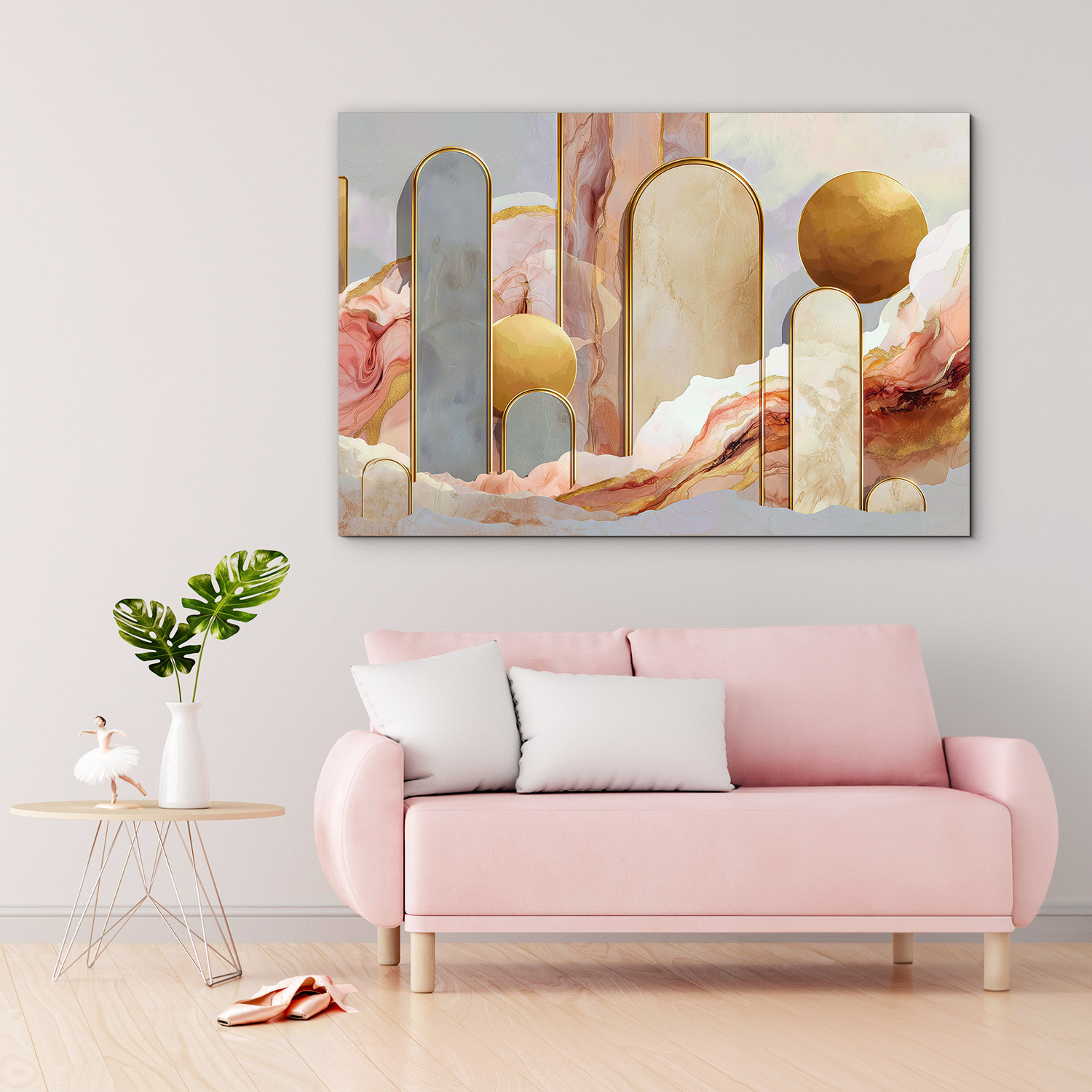 Jemný abstraktný obraz v pastelových farbách prináša do interiéru pocit ľahkosti, elegancie a moderného štýlu. Kombinácia ružových, béžových a sivých odtieňov doplnených o zlaté geometrické prvky vytvára harmonickú kompozíciu, ktorá pôsobí luxusne, no zároveň veľmi príjemne a upokojujúco. Drevený obraz sa dokonale hodí do obývačky, spálne alebo moderného interiéru, kde vynikne ako dizajnový prvok.