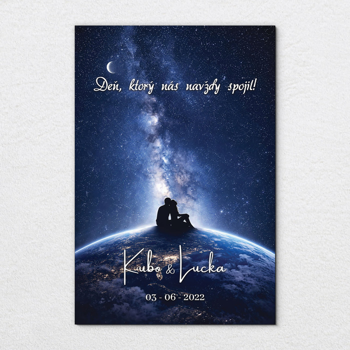 Význam obrazu: Zaľúbený pár sediaci na vrchole planéty pod hviezdnou oblohou symbolizuje, že keď ste spolu, celý svet vám leží pri nohách a vaše možnosti sú nekonečné ako sám vesmír.