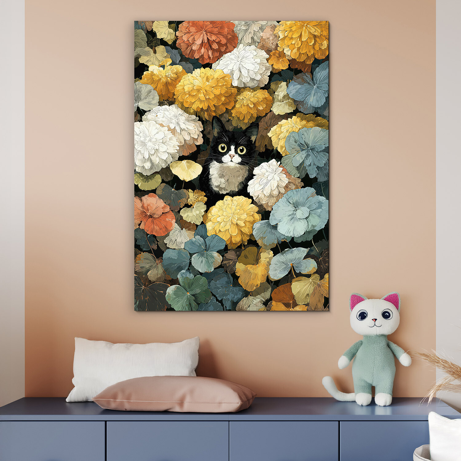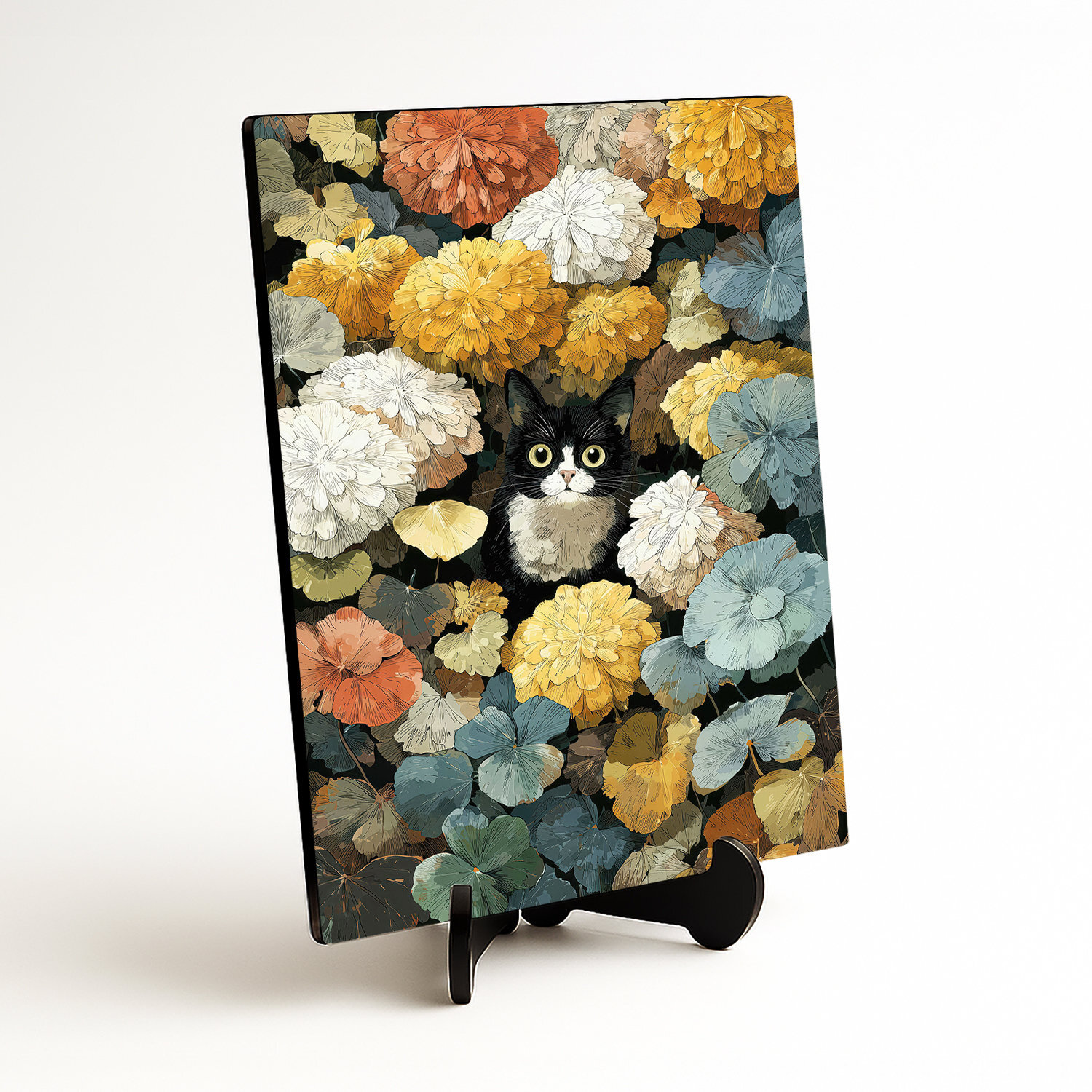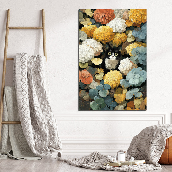 Význam obrazu: Mačka v kvetoch symbolizuje zvedavosť, pokoj a radosť z prítomného okamihu.