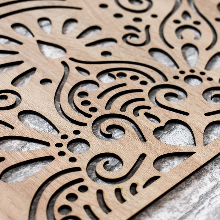 Výrobok je vyrezaný laserovou technológiou z drevenej HDF dosky - drevovláknitá doska s vysokou hustotou, ktorá vzniká zlisovaním drevených vlákien a živice pod tlakom. Materiál je pevný (hrúbka 3 mm), tvarovo stály a s hladkým povrchom. Vďaka pevnosti dokážeme vyrezávať aj jemné, tenké detaily.