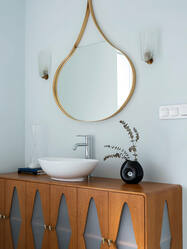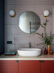 Pre retro kúpeľňu sú charakteristické buď jednofarebné kachličky v rôznych farbách alebo s pravidelnými geometrickými vzormi. Umývadlo zvykneme voliť oblého tvaru. Aj sklenený sprchový kút však môže perfektne zapadnúť do kúpeľne v retro štýle. Pravidelný geometrický vzor je taktiež možné aplikovať aj na nábytok. Takto sa interiér obzvláštni, no zároveň bude pôsobiť stále jednoducho.