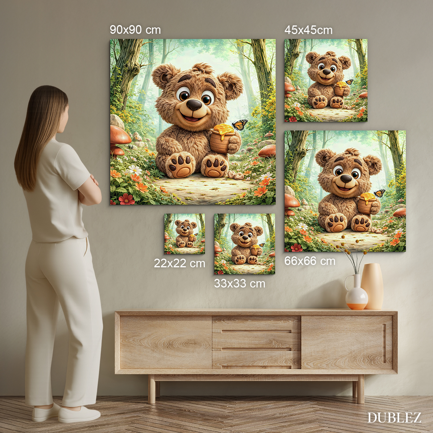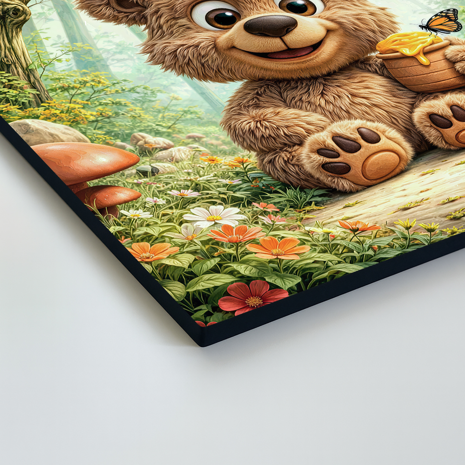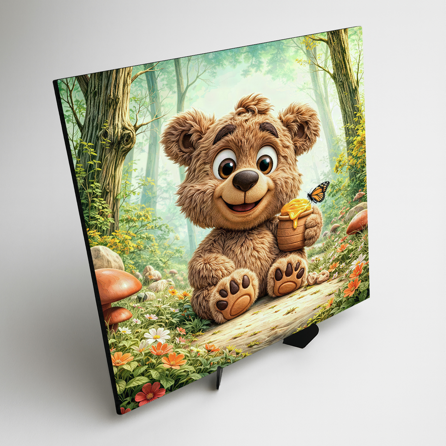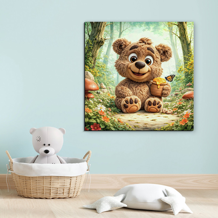 Premeňte detskú izbu na veselý lesný svet s týmto milým obrazom medvedíka s hrnčekom medu. Rozprávková dekorácia plná slnečných lúčov, lesných kvetov a poletujúcich motýľov krásne oživí stenu nad poličkou s hračkami. Medvedík pôsobí priateľsky a spokojne, preto je tento motív skvelou voľbou pre rodičov, ktorí hľadajú hravú, no stále vkusnú dekoráciu. Je to očarujúci darček pre malých objaviteľov k narodeninám či na Vianoce, ktorý vďaka tlači na dreve premení každú izbu na útulné miesto plné lesných dobrodružstiev.