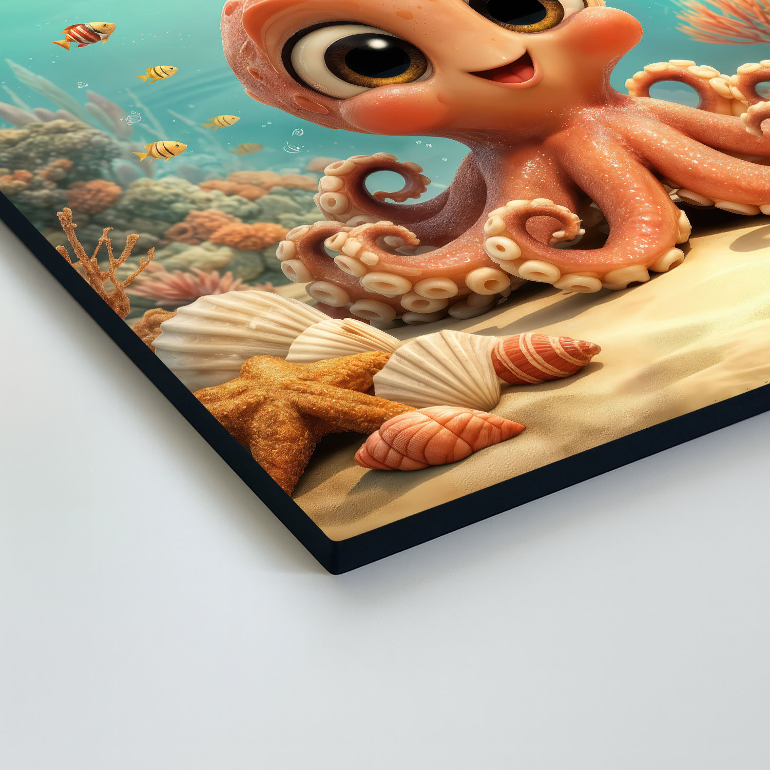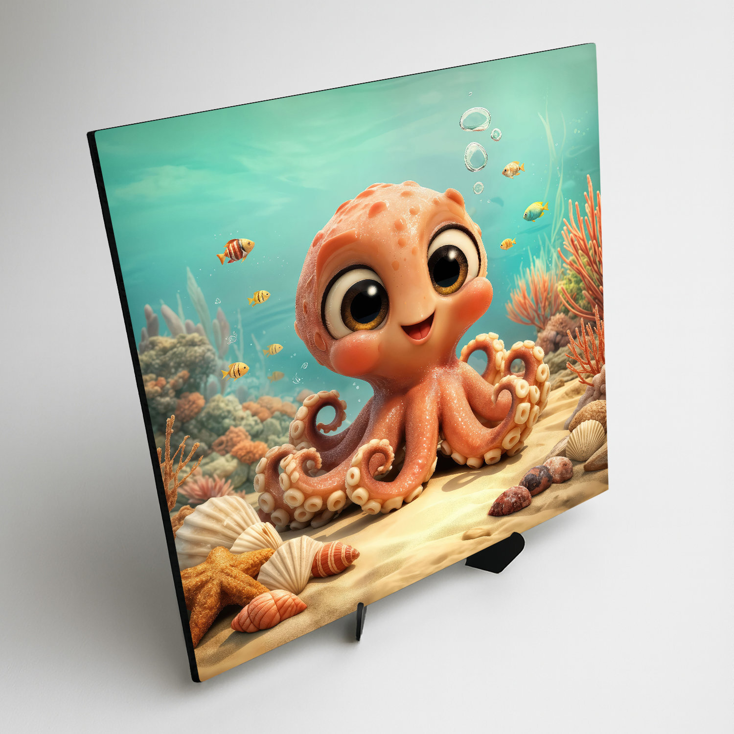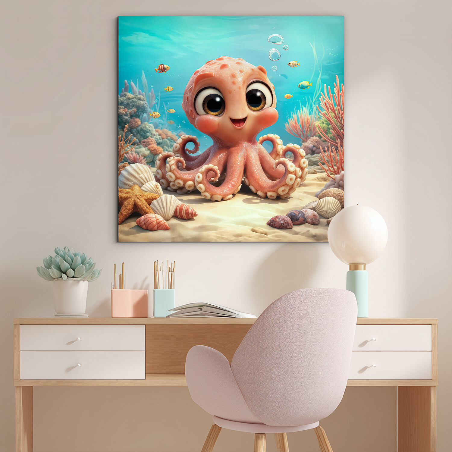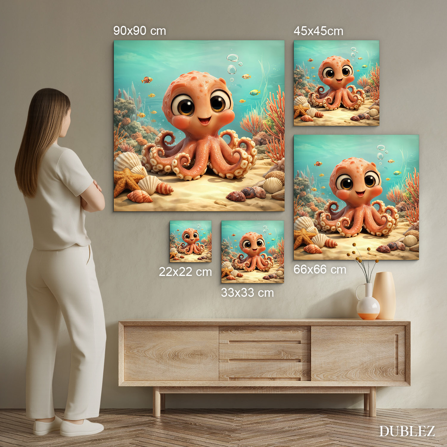 Rozprávkový obraz Chobotnička bude veselou podmorskou kamarátkou všetkých detí. Usmiata malá chobotnička s veľkými očkami pôsobí priateľsky a nežne, vďaka čomu si deti okamžite zamilujú jej veselý výraz. Jemné tyrkysové tóny oceánu v kombinácii s detailmi mušlí a koralov vytvárajú pokojné, no zároveň farebne živé prostredie. Tento obraz pre deti krásne vynikne nad postieľkou, písacím stolíkom aj v hracom kútiku, kde podporí fantáziu a radosť z objavovania.