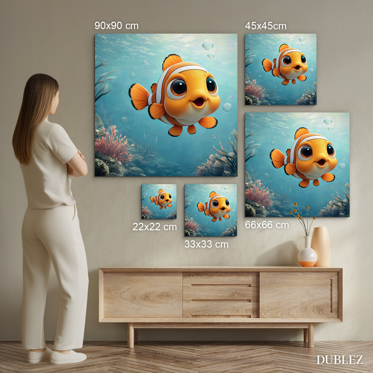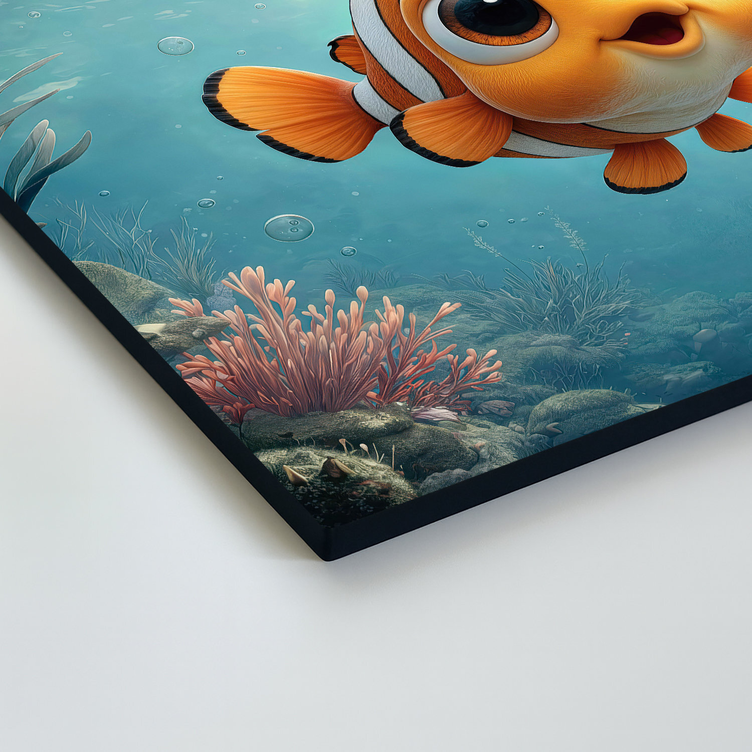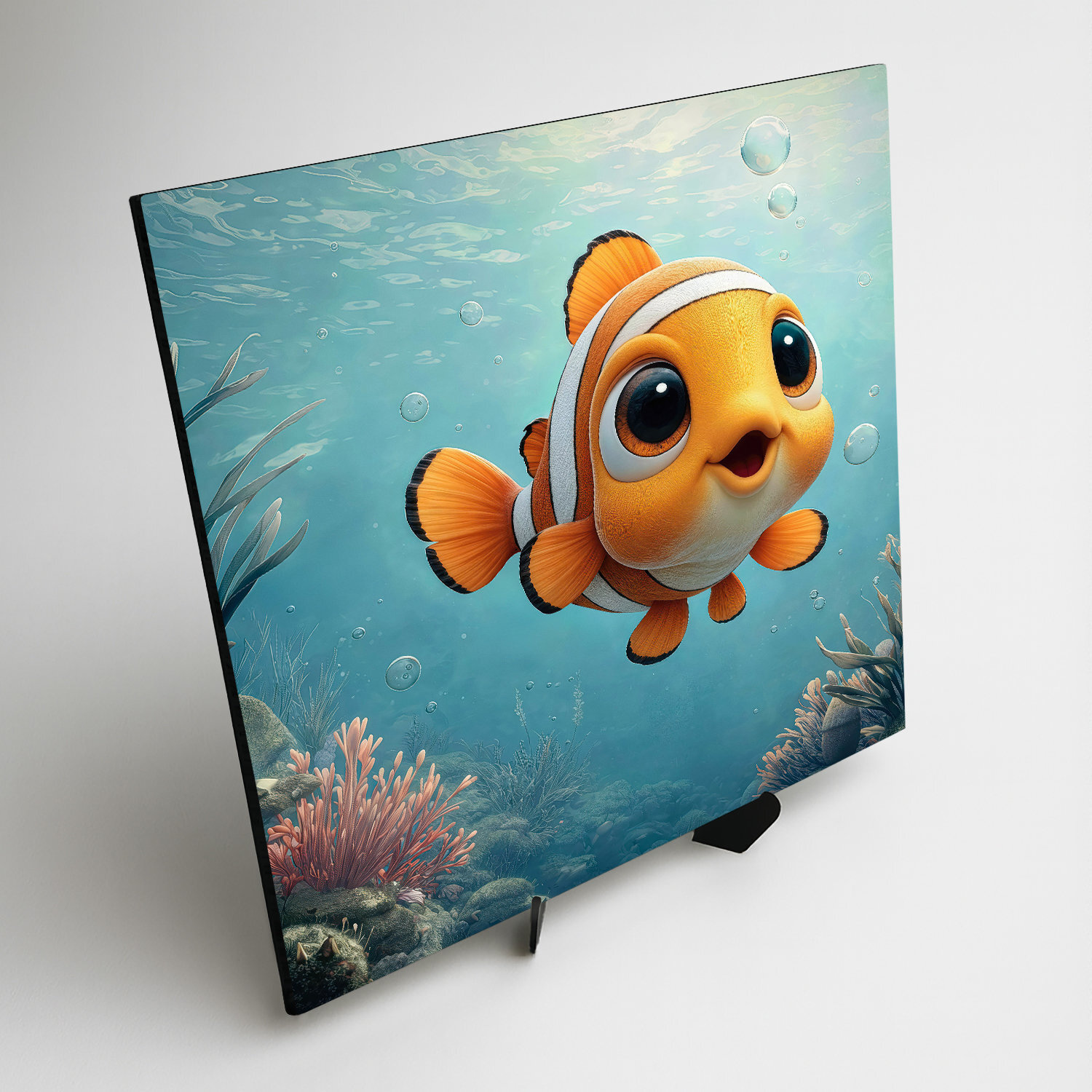 Rozprávkový obraz Nemo – Klaun očkatý prinesie do detskej izby veselý podmorský svet plný farieb a radosti. Usmiata oranžová rybka s veľkými očkami pôsobí hravo a priateľsky, čím si okamžite získa detskú pozornosť. Jemné modré tóny oceánu vytvárajú upokojujúcu atmosféru, zatiaľ čo detailné spracovanie koralov dodáva obrazu hĺbku. Tento farebný obraz je ideálnou voľbou do detskej izby, nad postieľku alebo do hracieho kútika, kde podporí fantáziu a radosť z objavovania.