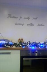 - Šablónu nalepíme na stenu tak, aby sme do nej mohli vkladať časti citátu (nepritlačte ju moc na stenu, aby nebol problém s jej odlepením). Šablóna spĺňa len funkciu, aby sa citát nalepil rovno so správnymi medzerami. Po nalepení všetkých častí citátu v šablóne budete môcť šablónu bezpečne odlepiť. Po nalepení citátu totiž už nebude možné citát meniť ani polohovať.