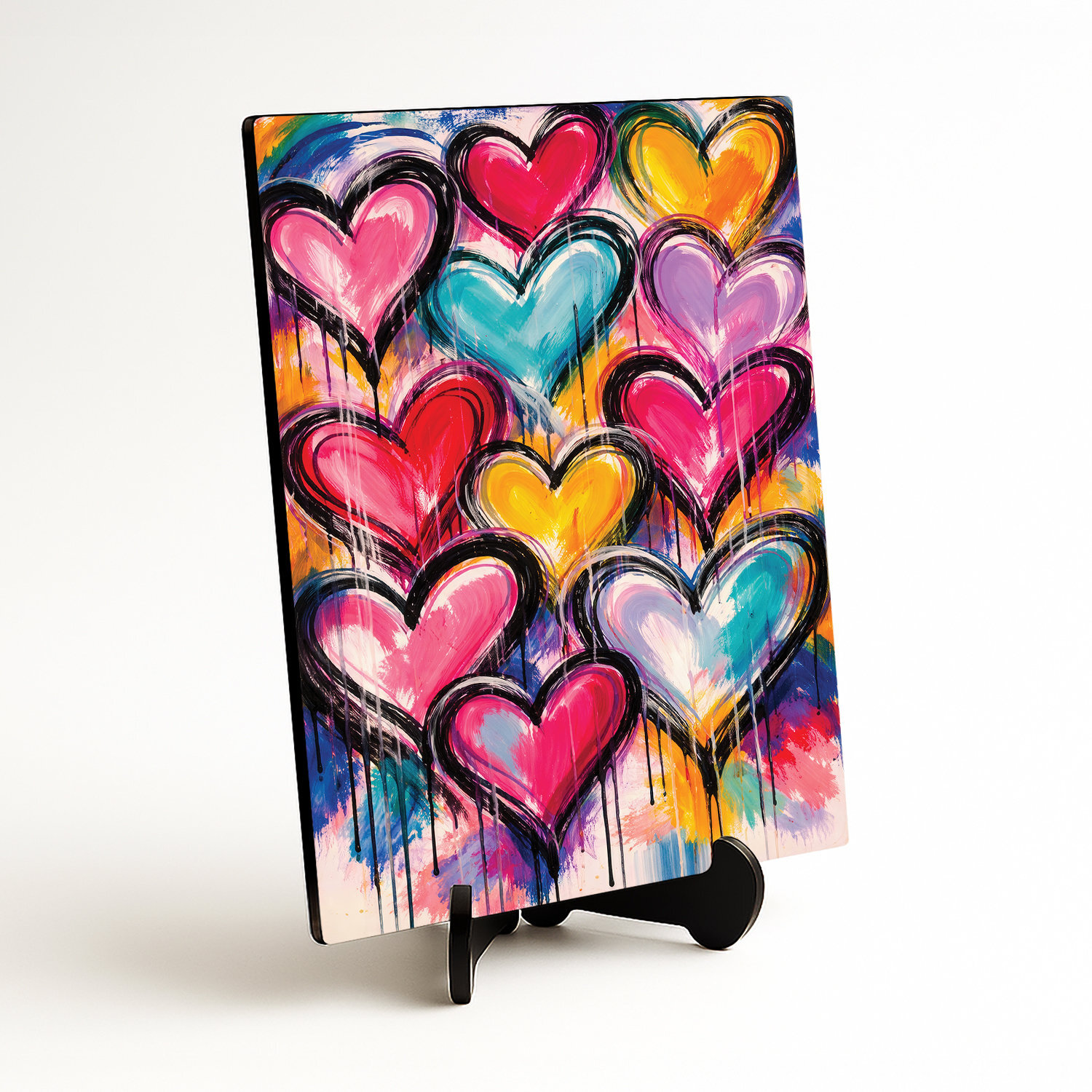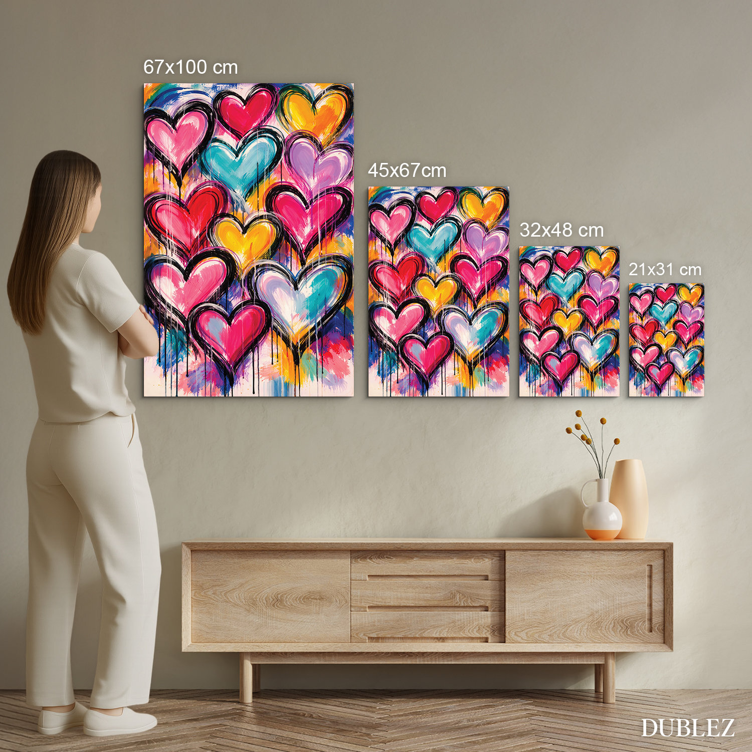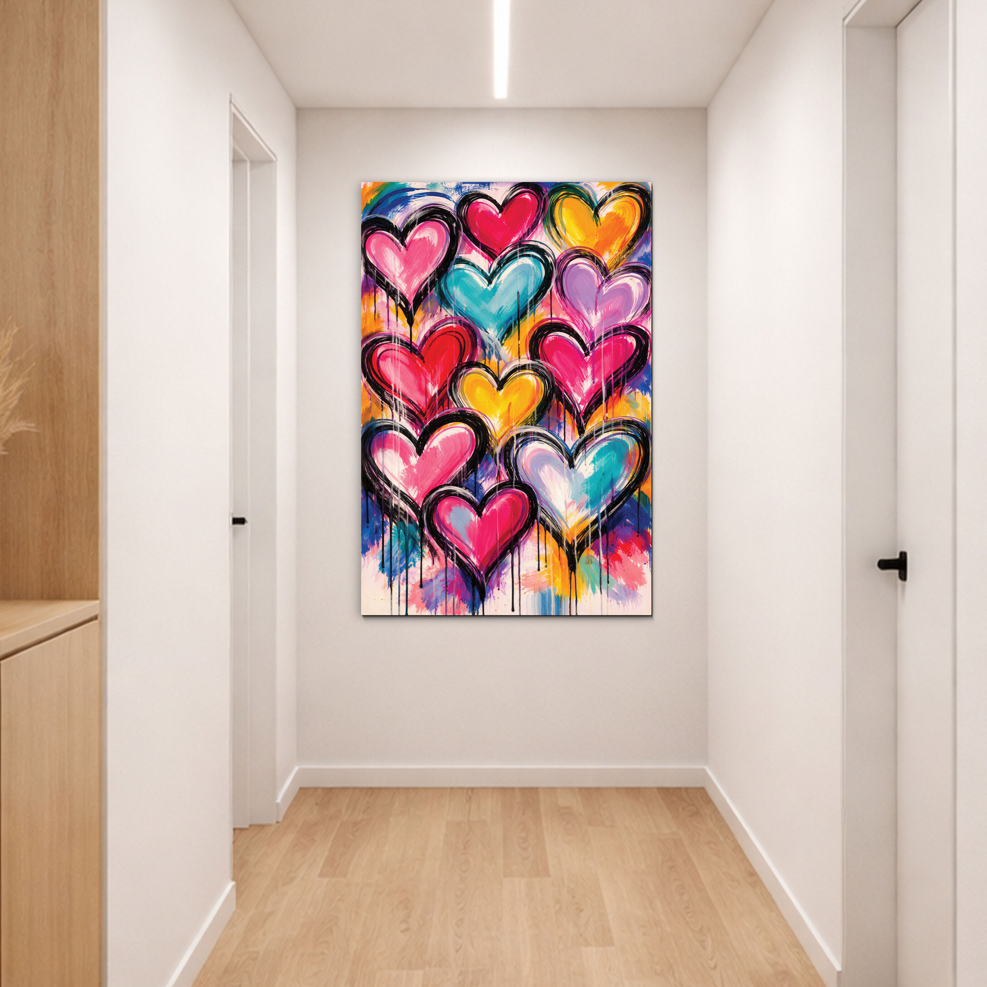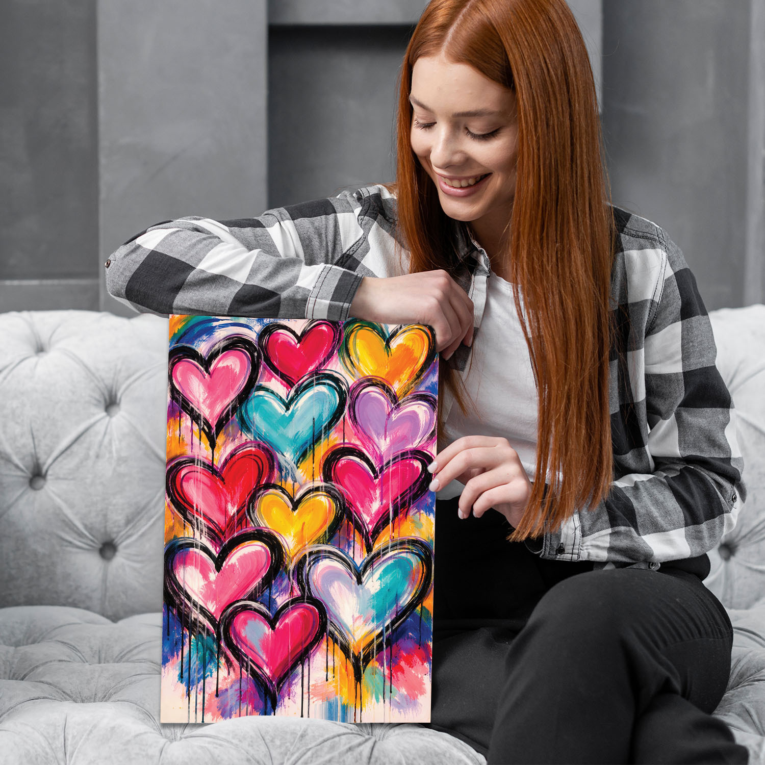Moderný obraz na stenu - Rytmus lásky prináša do interiéru nespútanú energiu a mestský štýl. Výrazné, pestrofarebné srdcia s prvkami graffiti a dizajn stekajúcej farby okamžite pritiahne pozornosť. Obraz lásky na dreve je ideálnym riešením pre každého, kto hľadá originálny darček s nádychom moderného umenia. Vďaka svojej farebnosti dokonale oživí biele steny, chodby alebo moderne zariadené obývačky.