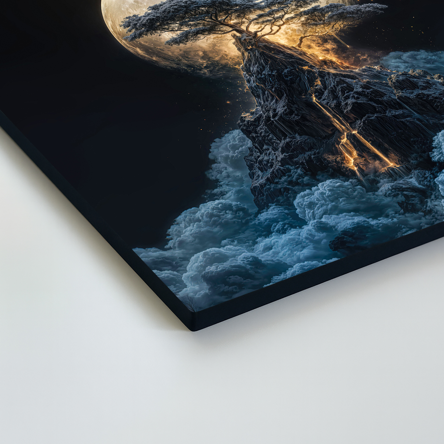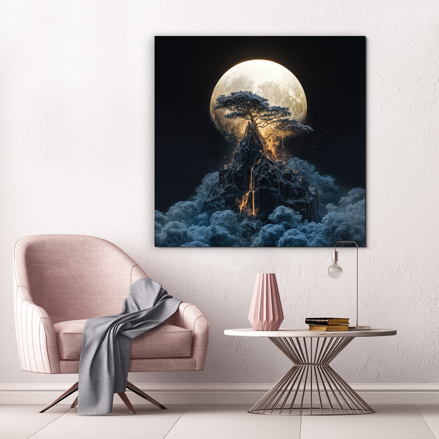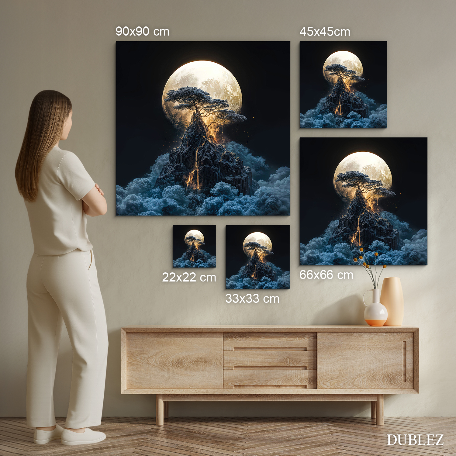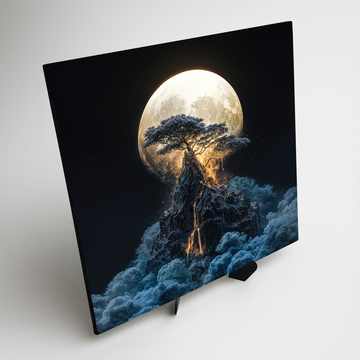 Drevený obraz s mystickým stromom na skalnom vrchole pod jasným splnom mesiaca v sebe spája silu prírody, tajomno nočnej oblohy a výnimočný dizajn. Vďaka tmavému pozadiu a svetlému mesiacu upúta pozornosť už pri vstupe do miestnosti. Obraz stromu života sa skvele hodí do moderných obývačiek, spální alebo pracovne.
