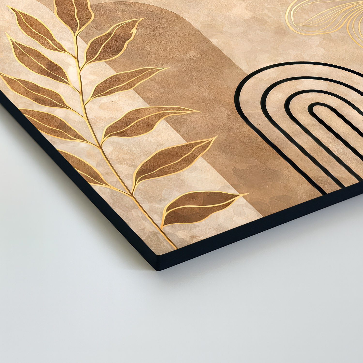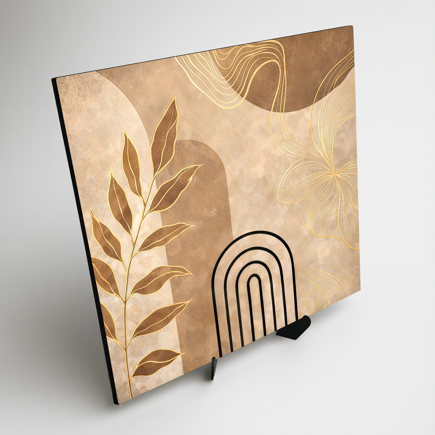 Štvorcový obraz na dreve spája moderný boho štýl, organické prírodné prvky a čistú geometriu. Dominantným prvkom je vetvička s listami, ktorú dopĺňa čierna lineárna arkáda a plynulé zlaté krivky prechádzajúce celou kompozíciou. Svojím minimalistickým dizajnom a trendovým prevedením je ideálnou dekoráciou do moderného interiéru.