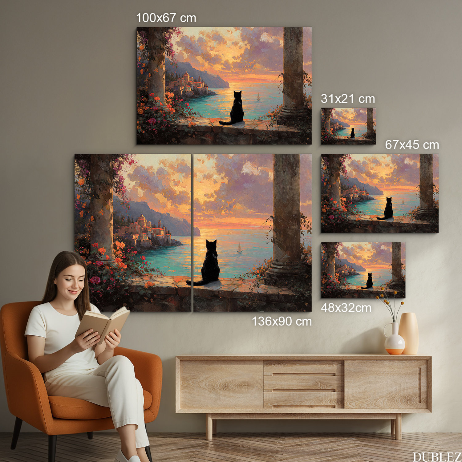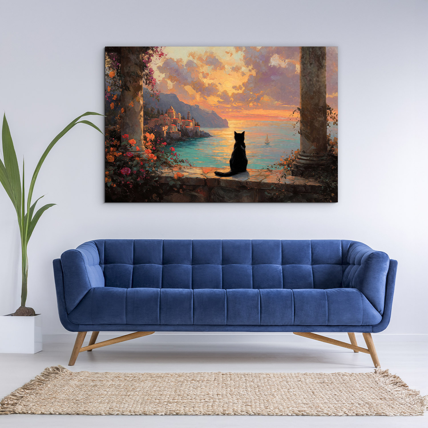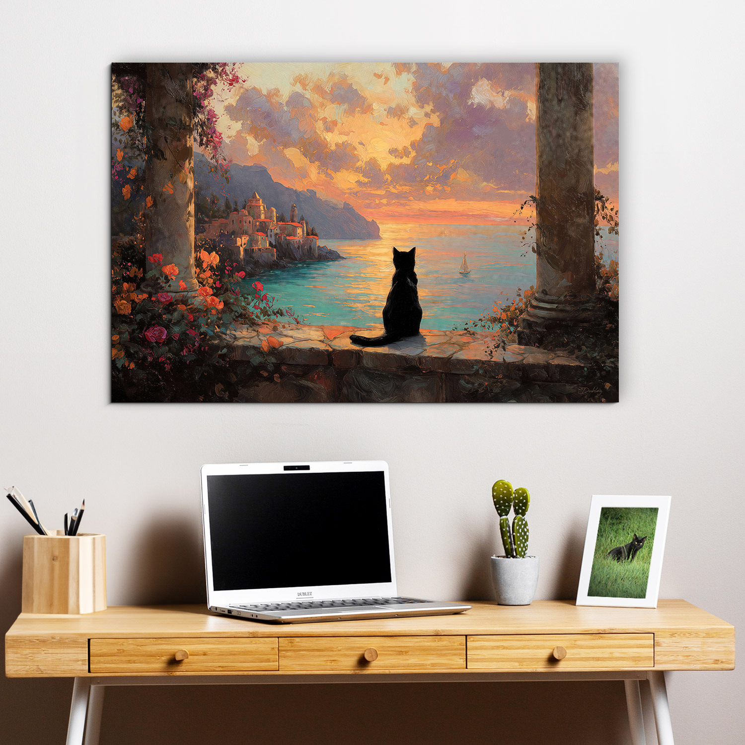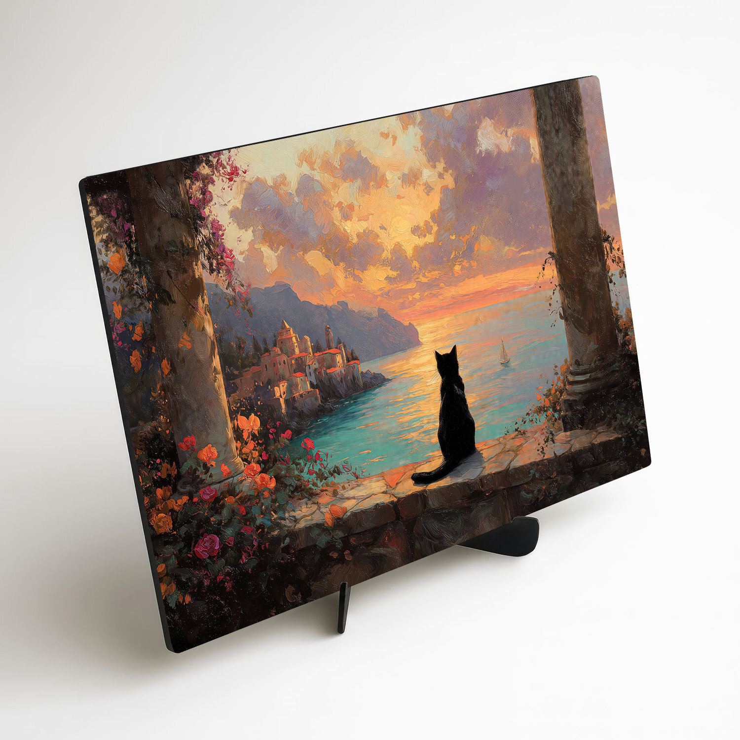 Drevený obraz nie je len obyčajnou dekoráciou, ale štýlový interiérový doplnok. Čierna mačka nerušene sleduje západ slnka nad talianskym pobrežím, vytvára vzácny pocit pokoja a nezávislosti. Kombinácia štýlu umeleckej maľby a teplých farieb vytvára obraz, ktorý si zamilujete.